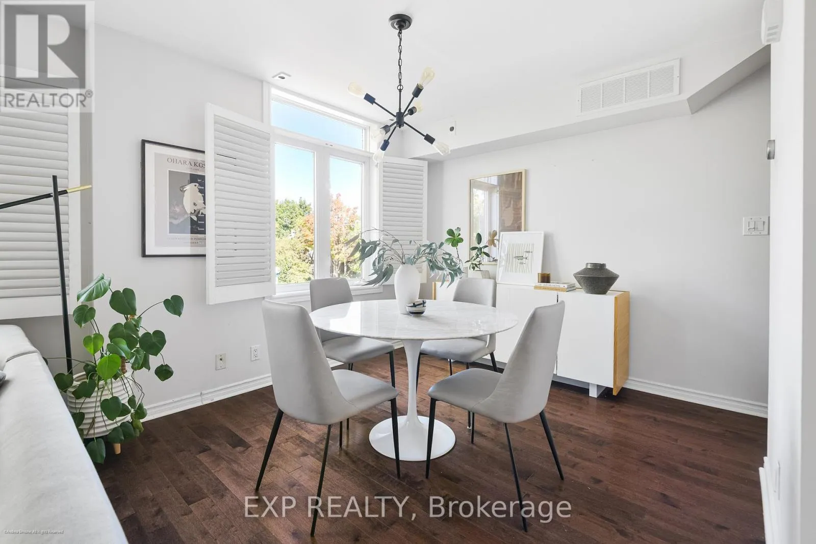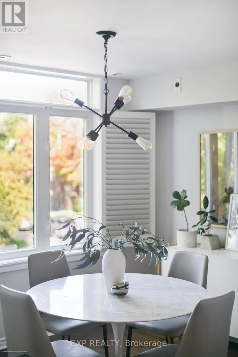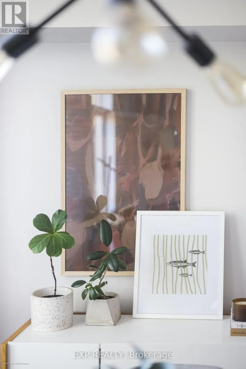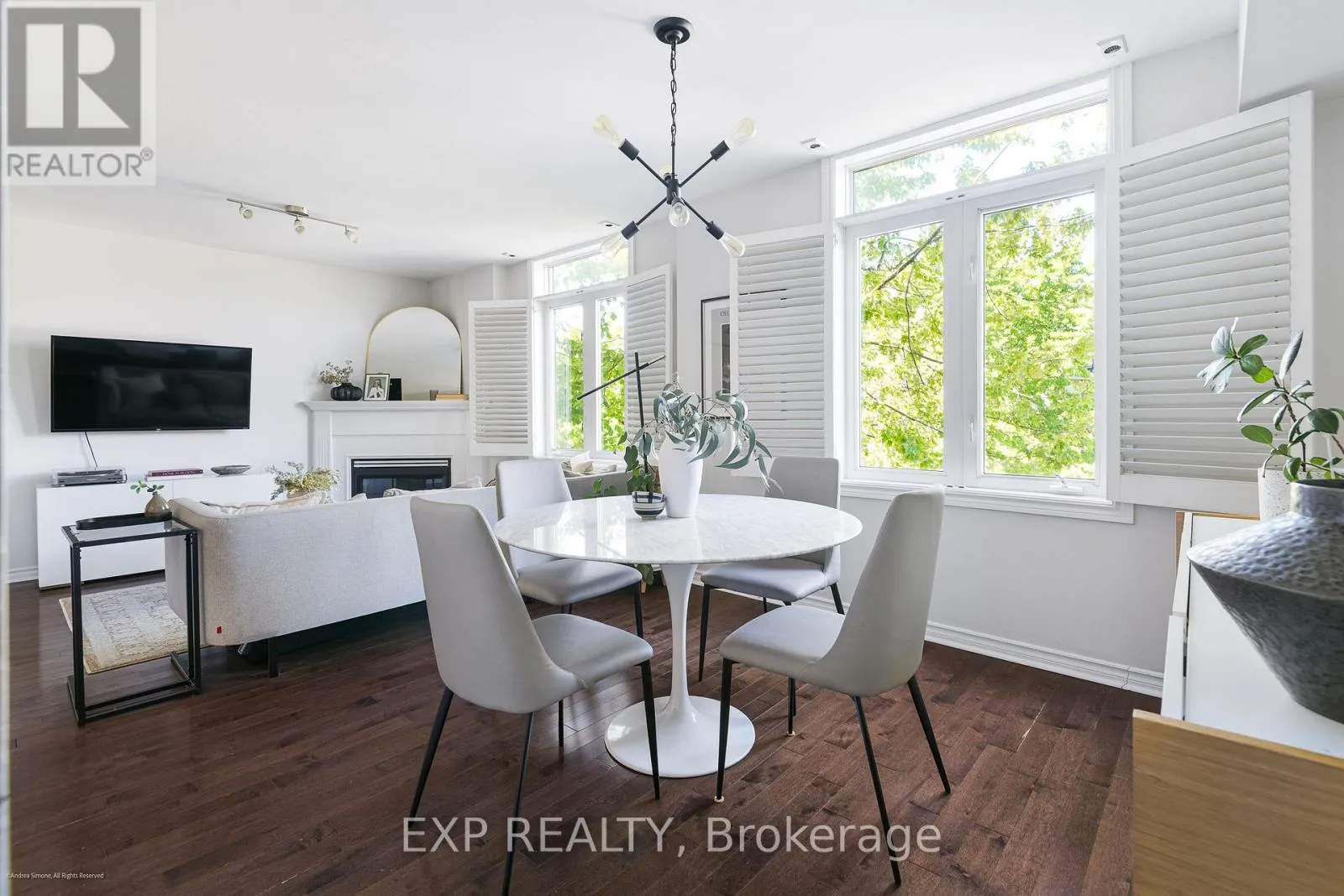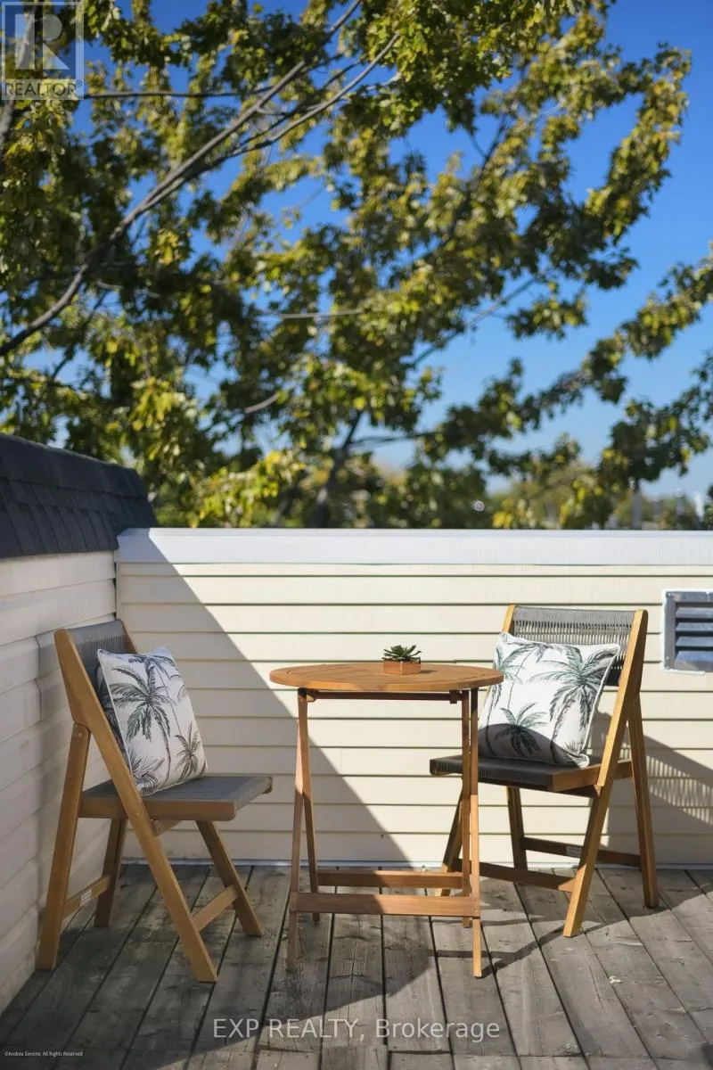 King & Strachan Tucked along a quiet, tree-lined street just steps from Trinity Bellwoods and Queen West one of Toronto's most vibrant and coveted corridors this beautifully designed two-bedroom condo townhome delivers an effortless blend of comfort, style, and ease. Behind its classic red-brick facade lies a space that feels more like a home than a condo. Thoughtfully laid out across multiple levels, its perfect for a couple or first-time buyer seeking room to grow. The main floor offers open-concept living, dining, and kitchen areas with a convenient powder room ideal for entertaining or unwinding. Oversized windows bathe the space in natural light, while the kitchens two-tone cabinetry (white uppers and deep blue lowers), Caesarstone countertops, and subway tile backsplash lend a touch of modern refinement. Upstairs, you'll find a bright four-piece bath and two generous bedrooms. The second bedroom, currently a charming nursery with built-ins, could easily serve as a guest room or home office. The primary suite offers ample closet space and a peaceful, sunlit retreat. On the top floor, a spacious rooftop terrace provides a rare urban escape expansive enough for lounging, dining, or simply enjoying sunset cocktails under the stars, surrounded by treetop views. Just moments from Trinity Bellwoods Park and some of the city's most celebrated cafes, restaurants, and shops, yet quietly tucked within a family-friendly pocket, this home strikes a perfect balance between urban energy and neighbourhood calm. A rare offering of scale, character, and setting city living, beautifully composed. (id:27476)