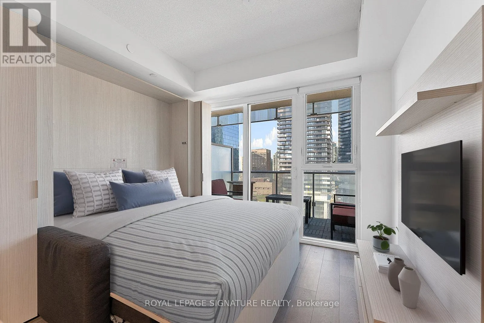 Lower Jarvis St & Queens Quay E Experience modern city living in this thoughtfully designed studio with lake and city views. Situated on a high floor in the desirable Lighthouse West Tower, this suite offers a functional open layout that feels bright and airy from every angle. A custom Murphy bed and sofa system maximizes space and versatility, while the contemporary kitchen features integrated appliances and a large island ideal for dining or entertaining. Step out to a generous balcony and take in the sweeping views, or unwind in style surrounded by premium finishes throughout. Perfectly located at Jarvis & Queens Quay, steps to Sugar Beach, Loblaws, LCBO, and the waterfront. Enjoy exceptional amenities including an outdoor pool, basketball and tennis court, yoga and art studios, rooftop terrace, concierge, and more. Ideal for professionals, investors, or anyone seeking a blend of comfort, luxury, and convenience by the lake. (id:27476)