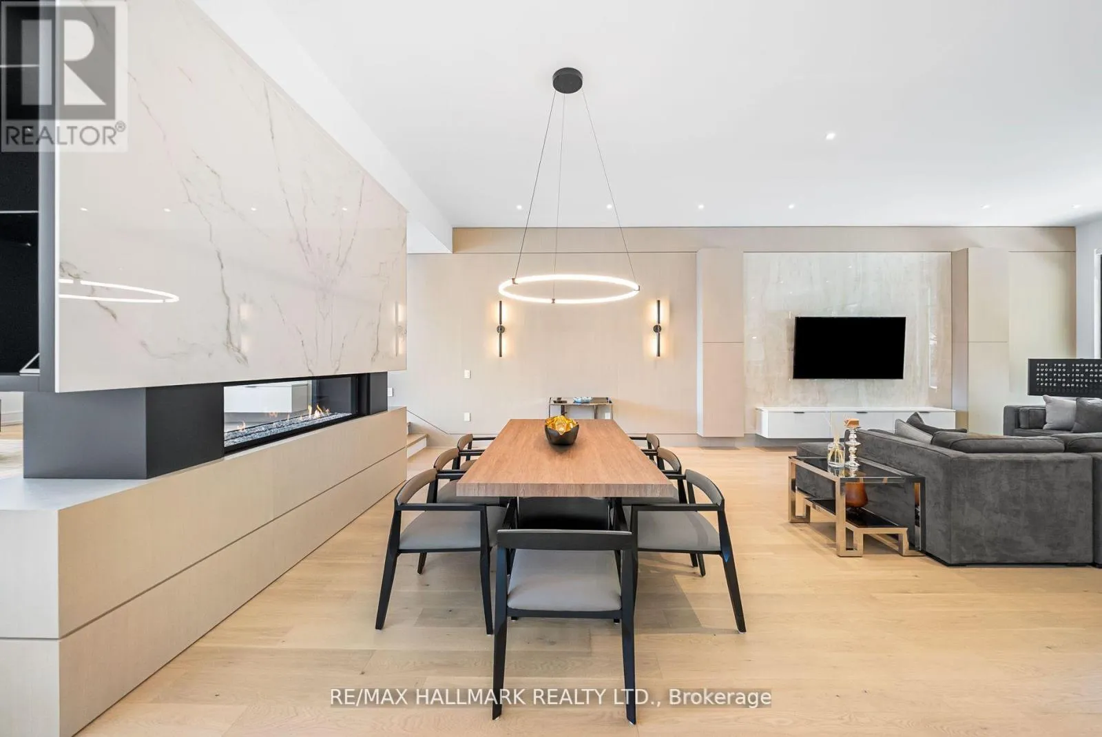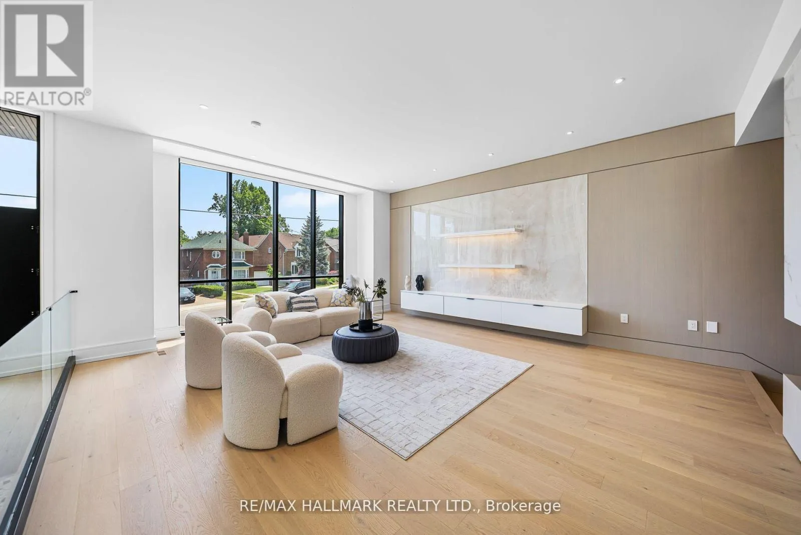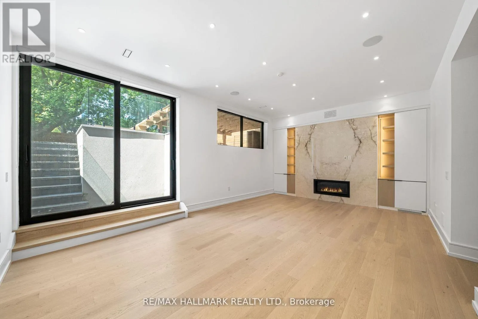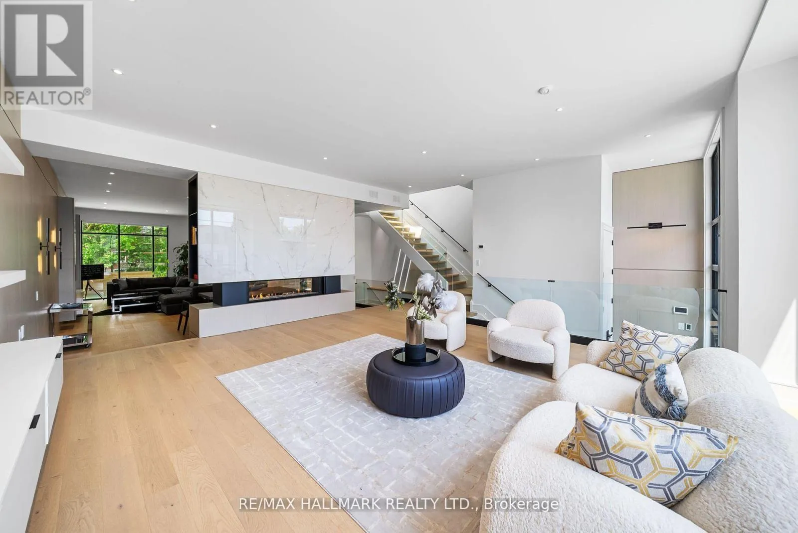 Bayview & Eglinton Welcome to 22 Divadale, located in the most desirable, quite, highly accessible and private pockets of North Leaside! This is by far one of the most uniquely designed homes in Leaside, featuring a layout that blends flow, function, and style across over 4,800 sqft of luxurious living space and checking every box. The main floor features soaring 12 foot ceilings, a chef inspired kitchen with an oversized island that seats eight, top of the line Miele & Wolfe appliances, with walkout to a large deck perfect for entertaining featuring exterior sound system, exterior lighting and gas line BBQ. White oak hardwood floors and stairs and sleek glass railings run throughout. Second floor features primary bedroom with stunning 7 piece ensuite, with heated floors and a large walk in closet with a skyslight. Three oversized bedrooms each with direct access to a bathroom and large closets. A rarely offered two floor basement with tons of features including a theatre room, nanny suite, 5 and 4 piece bathrooms, radiant heated flooring, wine display, built in speakers, separate entrance, large windows with walk out and 12 foot ceilings. A rare double car garage, hard to find in Leaside, is complemented by a full snow melt system/radiant floor heating covering the driveway, front porch, steps, side path, backyard, and basement walkout and landing. Additional features include a Control4 smart home system, electric blinds, designer lighting with dimmers, exterior lighting, a sprinkler system, gas fireplaces, skylights, and laundry on two levels. Just steps from Bayview Avenue and Eglinton Avenue. Located minutes from the top schools in Toronto including Northlea Elementary and Middle School, Bessborough Drive Elementary and Middle School, Park Lane Public School and Leaside High School. (id:27476)