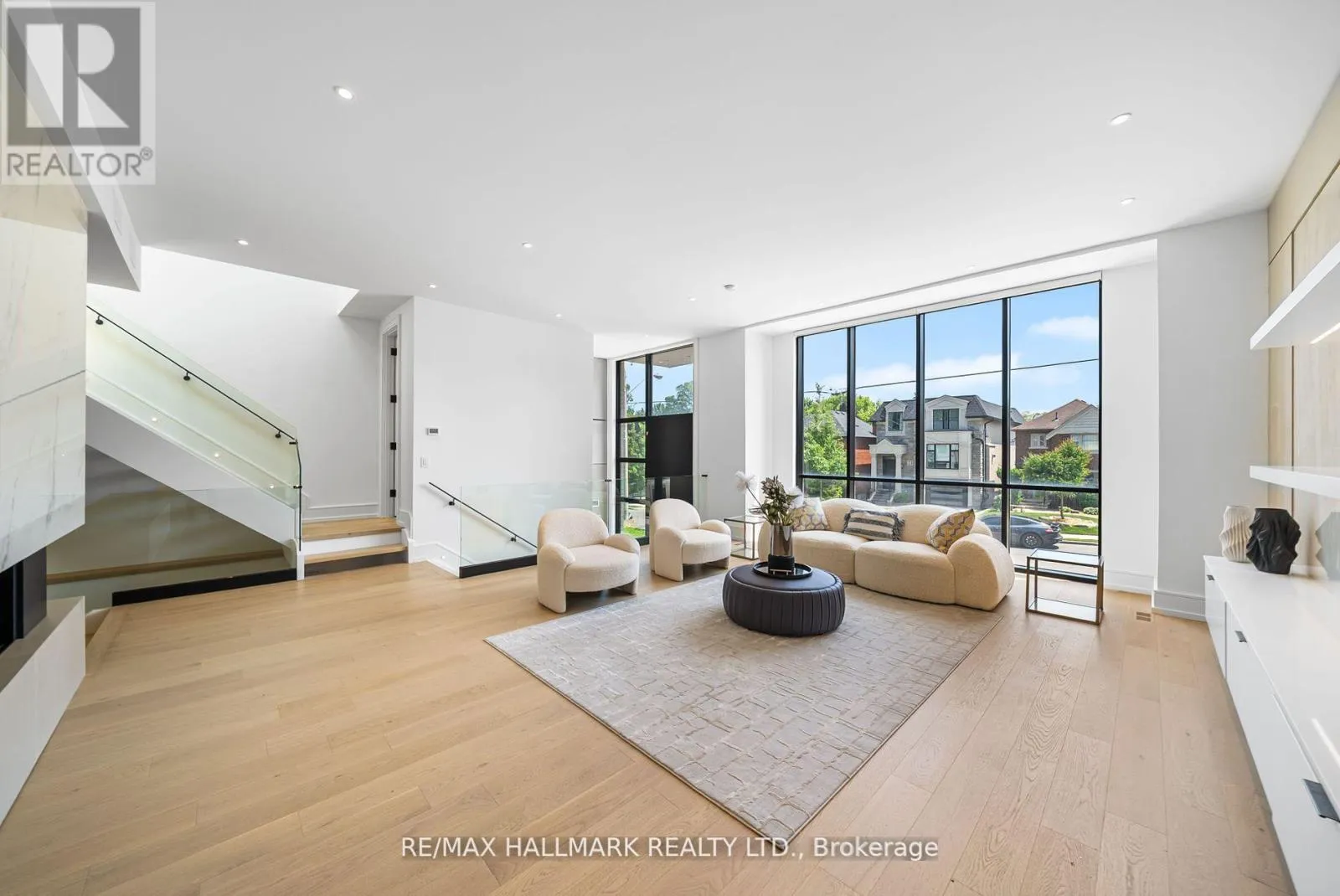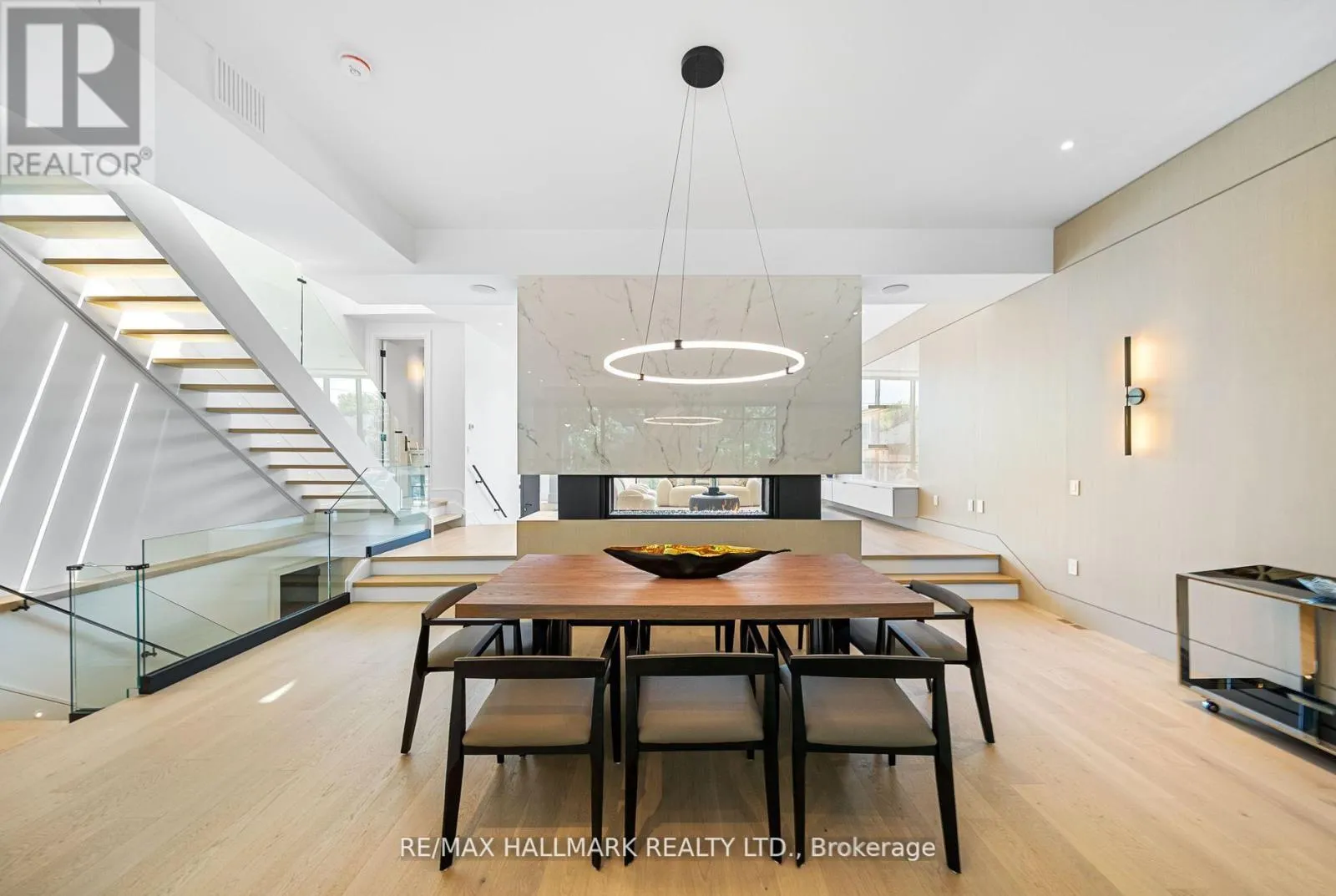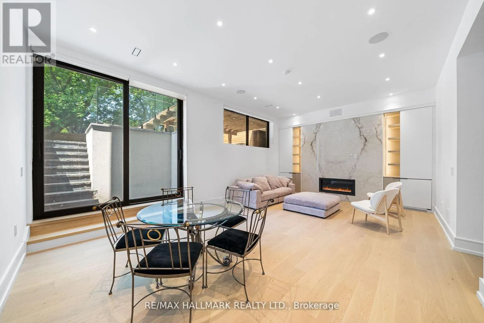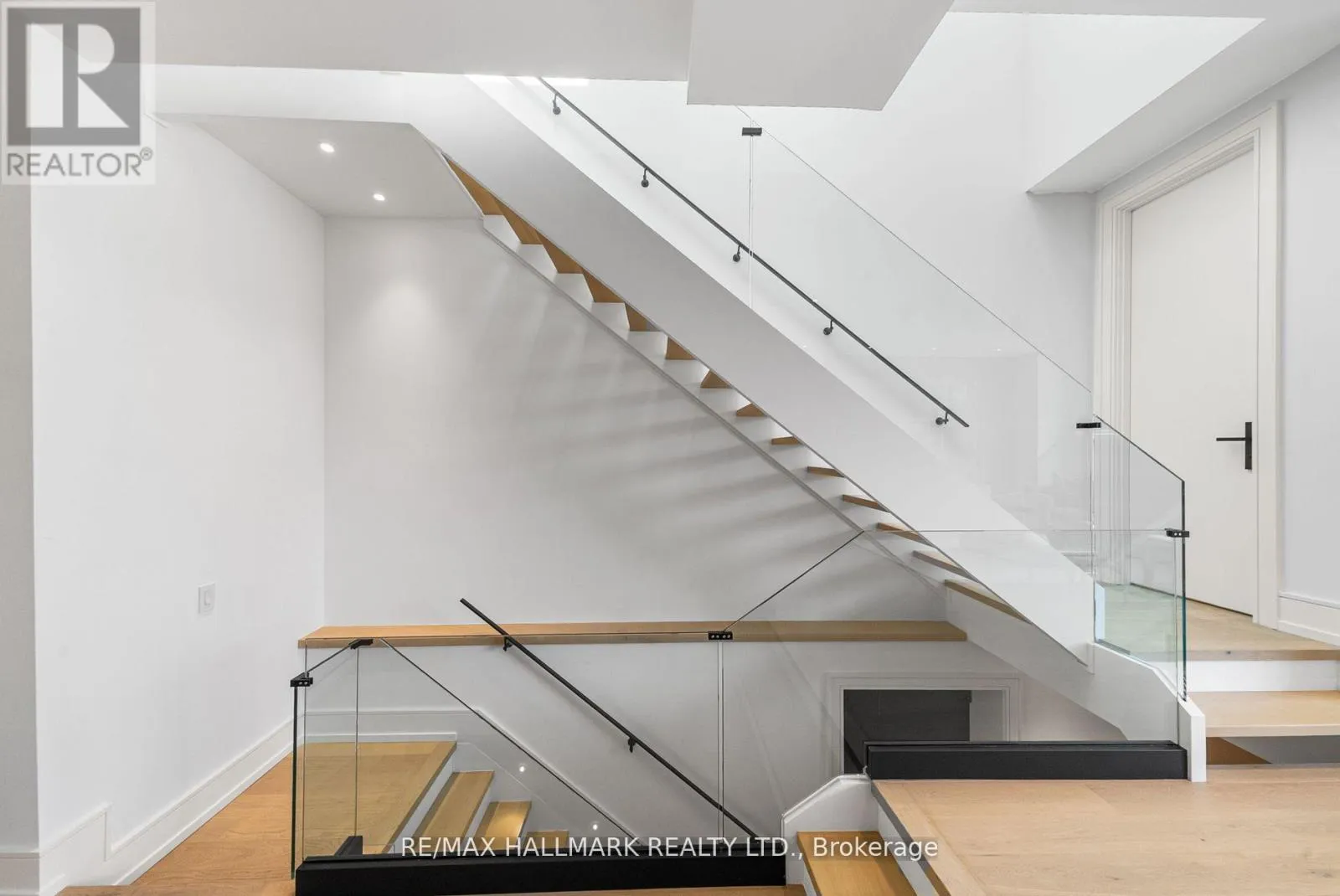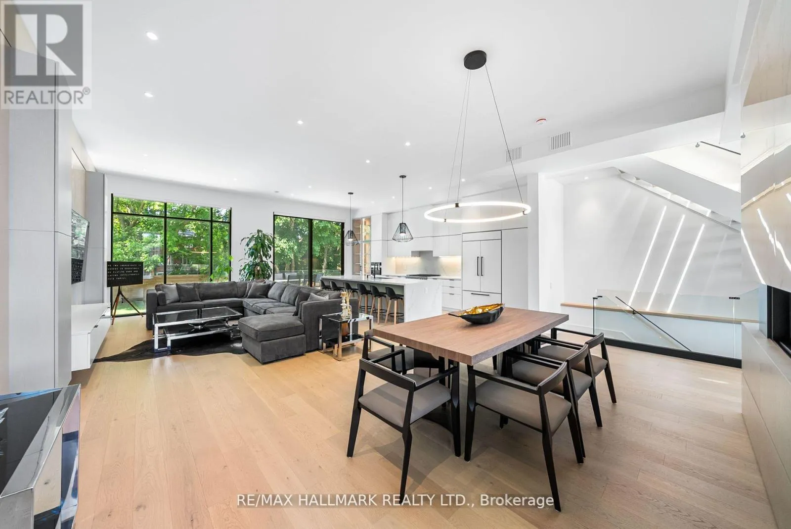 Bayview & Eglinton Welcome to 22 Divadale, located in the most desirable, quite, highly accessible and private pockets of North Leaside! This is by far one of the most uniquely designed homes in Leaside, featuring a layout that blends flow, function, and style across over 4,800 sqft of luxurious living space and checking every box. The main floor features soaring 12 foot ceilings, a chef inspired kitchen with an oversized island that seats eight, top of the line Miele & Wolfe appliances, with walkout to a large deck perfect for entertaining featuring exterior sound system, exterior lighting and gas line BBQ. White oak hardwood floors and stairs and sleek glass railings run throughout. Second floor features primary bedroom with stunning 7 piece ensuite, with heated floors and a large walk in closet with a skyslight. Three oversized bedrooms each with direct access to a bathroom and large closets. A rarely offered two floor basement with tons of features including a theatre room, nanny suite, 5 and 4 piece bathrooms, radiant heated flooring, wine display, built in speakers, separate entrance, large windows with walk out and 12 foot ceilings. A rare double car garage, hard to find in Leaside, is complemented by a full snow melt system/radiant floor heating covering the driveway, front porch, steps, side path, backyard, and basement walkout and landing. Additional features include a Control4 smart home system, electric blinds, designer lighting with dimmers, exterior lighting, a sprinkler system, gas fireplaces, skylights, and laundry on two levels. Just steps from Bayview Avenue and Eglinton Avenue. Located minutes from the top schools in Toronto including Northlea Elementary and Middle School, Bessborough Drive Elementary and Middle School, Park Lane Public School and Leaside High School. (id:27476)