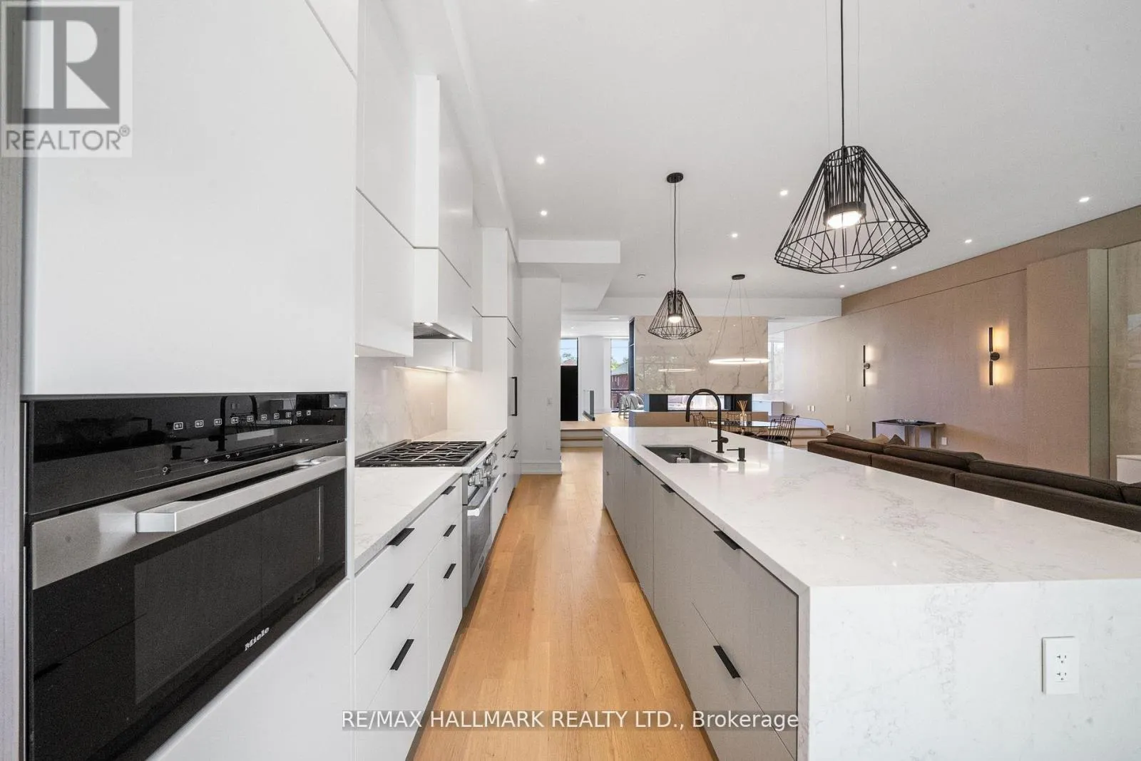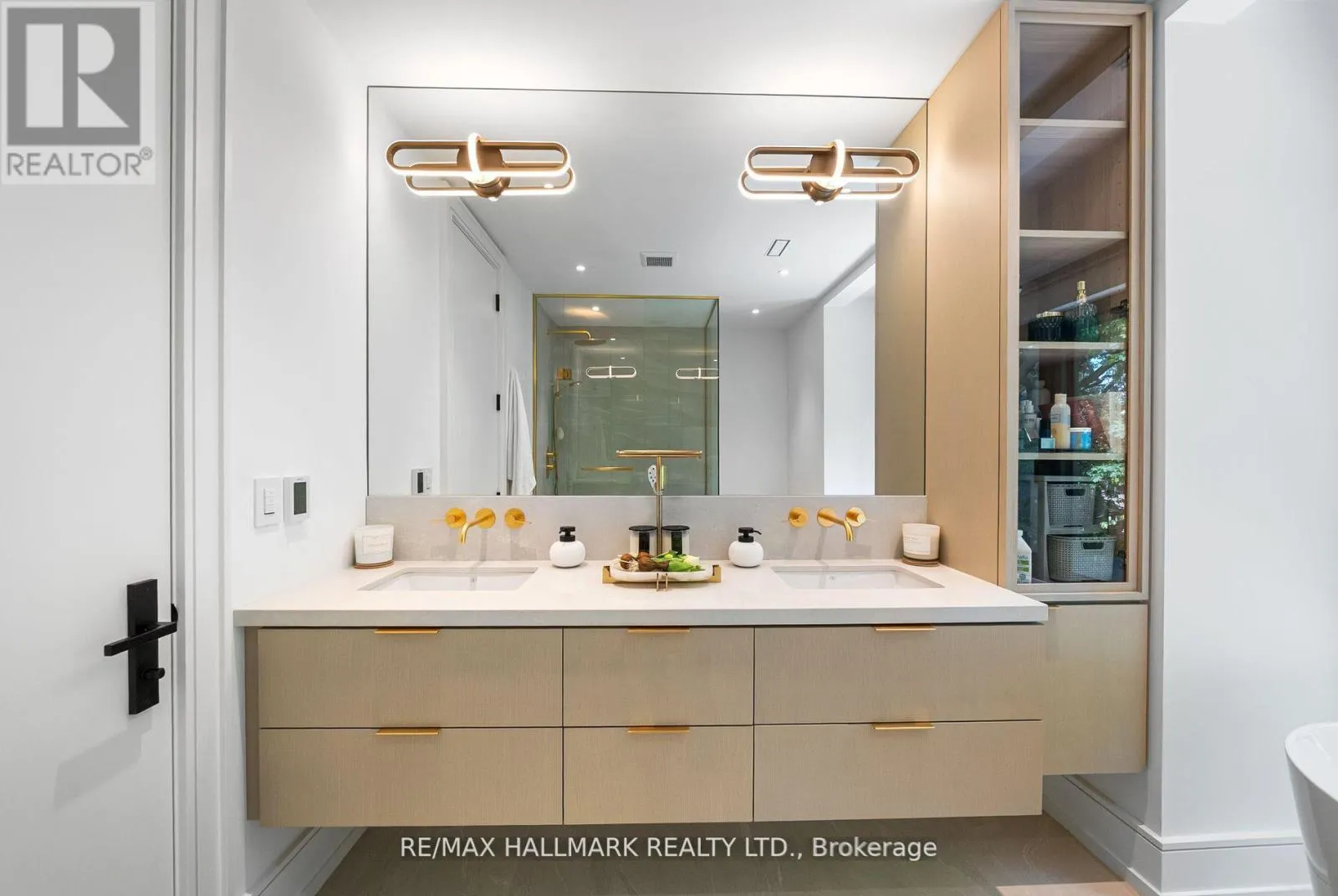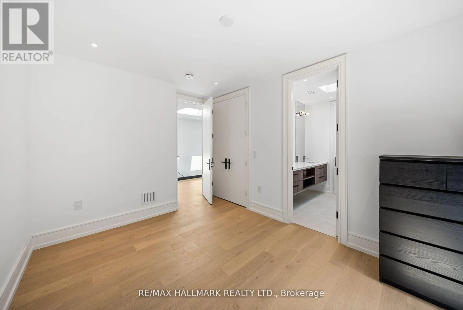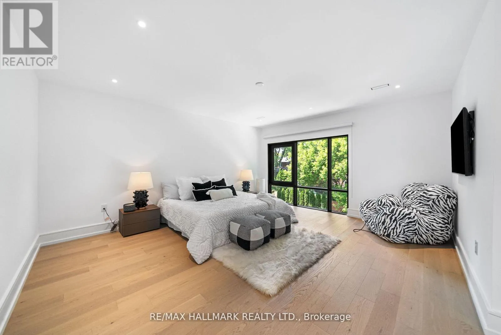 Bayview & Eglinton Welcome to 22 Divadale, located in the most desirable, quite, highly accessible and private pockets of North Leaside! This is by far one of the most uniquely designed homes in Leaside, featuring a layout that blends flow, function, and style across over 4,800 sqft of luxurious living space and checking every box. The main floor features soaring 12 foot ceilings, a chef inspired kitchen with an oversized island that seats eight, top of the line Miele & Wolfe appliances, with walkout to a large deck perfect for entertaining featuring exterior sound system, exterior lighting and gas line BBQ. White oak hardwood floors and stairs and sleek glass railings run throughout. Second floor features primary bedroom with stunning 7 piece ensuite, with heated floors and a large walk in closet with a skyslight. Three oversized bedrooms each with direct access to a bathroom and large closets. A rarely offered two floor basement with tons of features including a theatre room, nanny suite, 5 and 4 piece bathrooms, radiant heated flooring, wine display, built in speakers, separate entrance, large windows with walk out and 12 foot ceilings. A rare double car garage, hard to find in Leaside, is complemented by a full snow melt system/radiant floor heating covering the driveway, front porch, steps, side path, backyard, and basement walkout and landing. Additional features include a Control4 smart home system, electric blinds, designer lighting with dimmers, exterior lighting, a sprinkler system, gas fireplaces, skylights, and laundry on two levels. Just steps from Bayview Avenue and Eglinton Avenue. Located minutes from the top schools in Toronto including Northlea Elementary and Middle School, Bessborough Drive Elementary and Middle School, Park Lane Public School and Leaside High School. (id:27476)