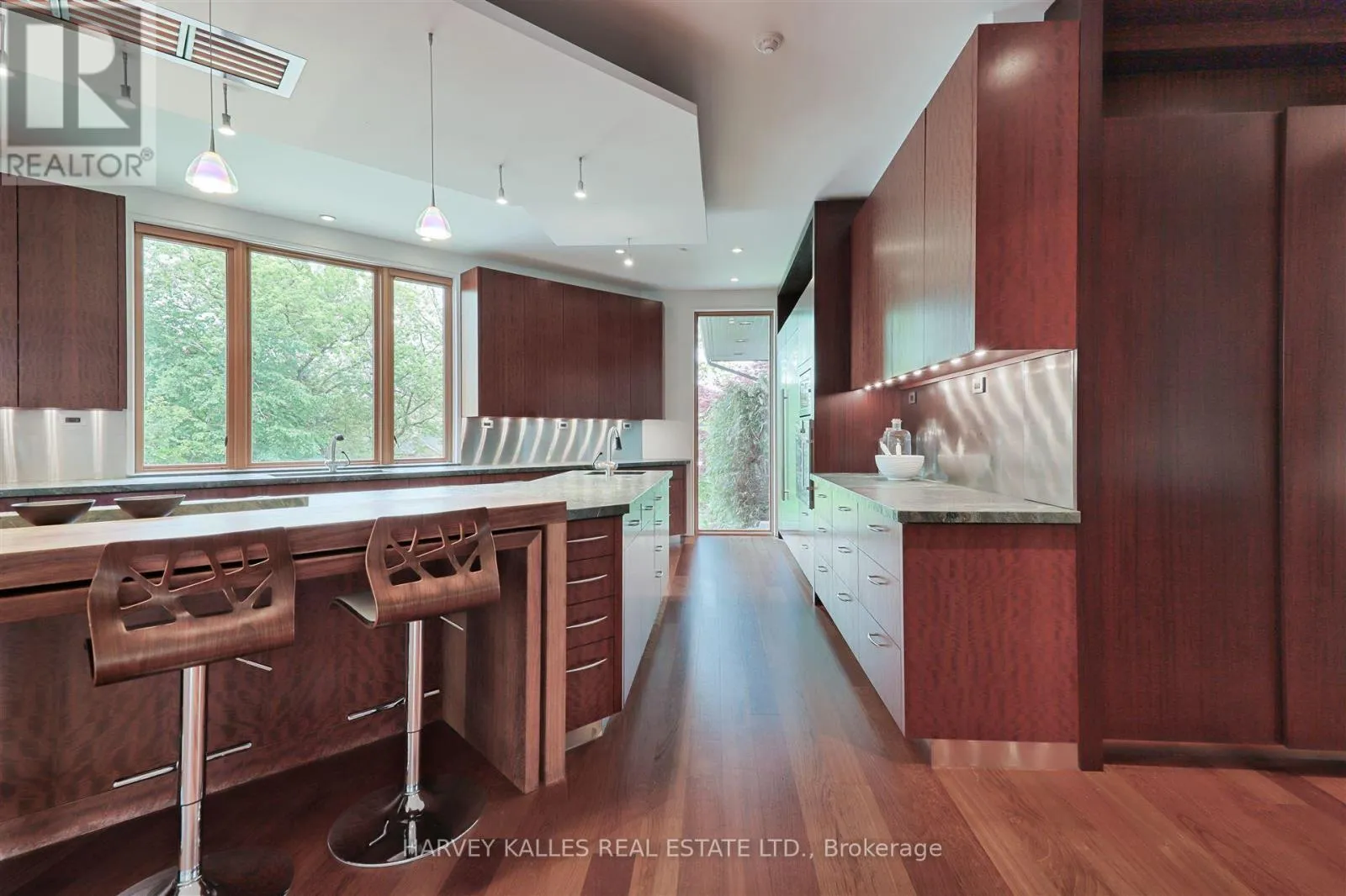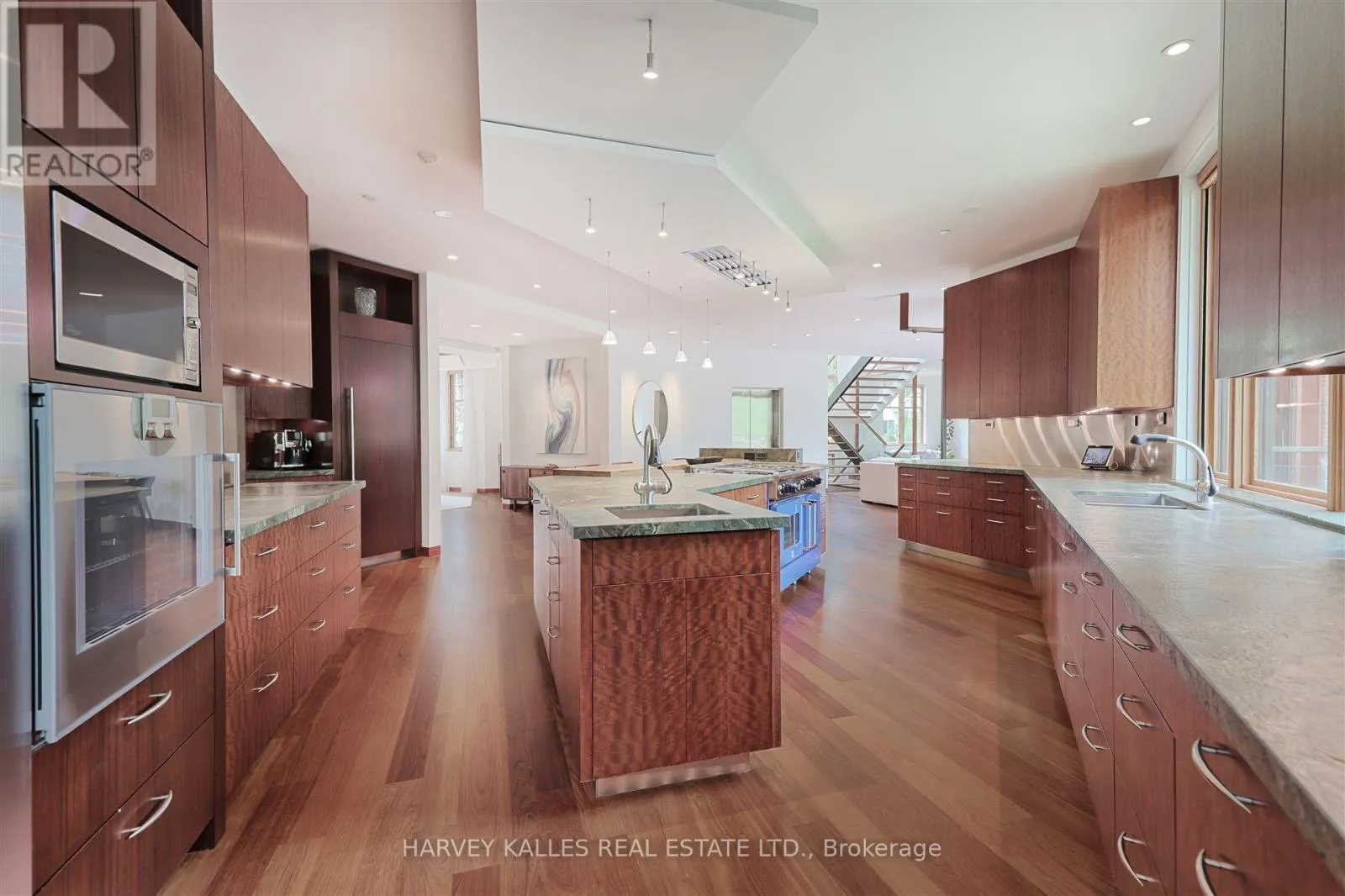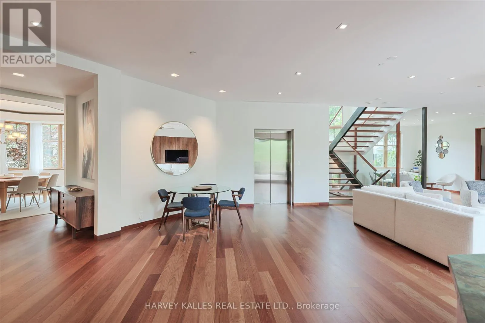 Government and Prince Edward Discover a gem, custom-built as a multi-generational home, offering over 11,000 sq ft of luxurious living space on a rare 125ft double lot at the edge of the Humber Valley in the tree-lined Kingsway neighbourhood. This residence is a statement of contemporary elegance and sophistication, perfect for the discerning family.Inside, experience clean lines and exquisite details that enhance comfortable luxury living, including sound-isolated suites, Jatoba hardwood floors, stunning Persian serpentinite kitchen countertops, and heated stone floors for ultimate comfort.Accessibility is a key feature, with snow melt for the front porch, steps, ramp and driveway, a commercial 4x6 ft elevator, and 4 ft wide hallways to ensure effortless movement throughout the residence.The ground floor features a bright, open-plan living area that seamlessly integrates the chefs kitchen, dining, and living spaces, extending to a partially covered upper deck with a 17ft wide opening. A heated 3-car garage is cleverly positioned at the side of the house.The primary retreat is where luxury meets tranquility, featuring two generous walk-in closets and two ensuites one complete with a massage room and whirlpool tub offering tree-top views. Two additional spacious bedrooms, each with walk-in closets, share a thoughtfully designed bathroom suite with dual sinks, ample storage, and a separate area for added privacy. The oversized fourth bedroom also includes its own ensuite bathroom and walk-in closet, providing comfort and convenience for family or guests.The ground floor bedroom suite with a Juliet balcony offers a perfect retreat for guests.Venture to the finished lower level, where 10+ ft ceilings create a light and airy ambiance.This expansive space features a wide sliding door leading to the lower deck, ideal for entertaining.With multiple entertainment areas, including a stepped home theatre and sprawling park-like backyard, this home is designed for those who appreciate spacious comfort. (id:27476)