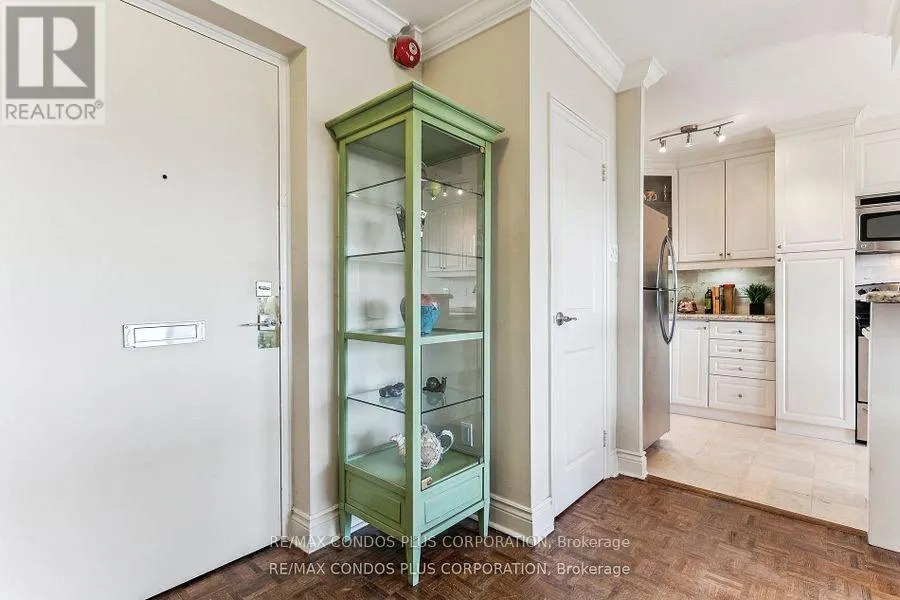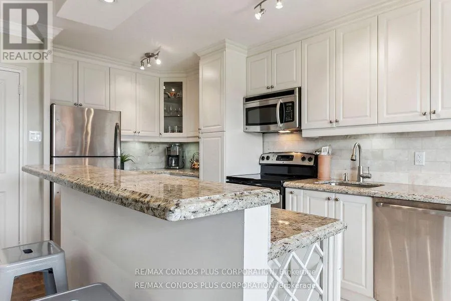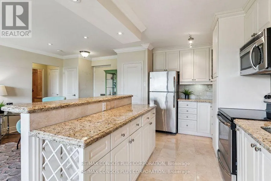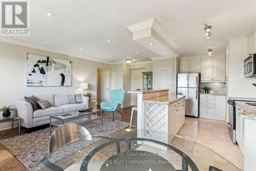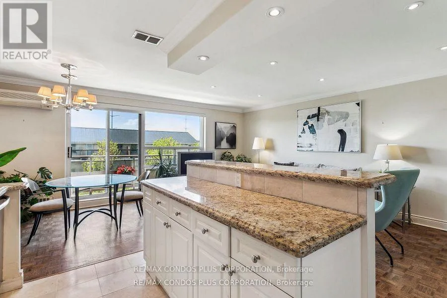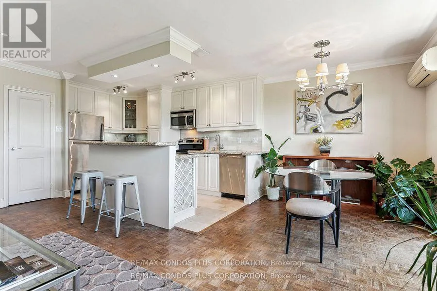 Cross Streets: Eglinton/Victoria park. ** Directions: South off Eglinton between Victoria Park and Bermondsey. Buyers & Agents check this out! Turn Key Unit that checks all the boxes! Value-Space-Location! Top Floor, 735 Sq. Ft. 1 Bdrm. Dining Room W/Sliding door W/O to Private 138 Sq Ft Balcony-only 3 one BR units have this size Superb bright S/W Panoramic View on Quiet North York residential Street W/Multi million dollar Townhomes. This full reno (gutted 15 years ago) Total Custom Upgraded unit W/continuing updates to present HAS Large thermal windows-smooth ceilings-crown moldings-7 in. baseboards. 2 Panel doors-Recessed lighting & tracks-Updated Electrical W/Extra Decora wall outlets & Dimmer Switches- High end finishes. 13 Ft Granite Counters. Kit w/12 drawers-abundant storage upper Cabinets - spacious Base cabinets -Chrome Lazy Susan-Slat wood Wine rack. Large Breakfast bar, Travertine stone Backsplash & Flooring. Ready for Gourmet cooking & Sumptuous entertaining--before strolling to the private 31.8 ft Updated April 2025 Balcony to enjoy a beautiful evening view. LRT on Eglinton East. Bermondsey & Victoria Park stops working soon, Minutes to all amenities in multiple Plazas & Bus to Downtown. East parking lot entrance has wheelchair accessibility, easy access to lockers, furniture moving and in and out deliveries.. Note low ALL inclusive Maint.+Taxes ONLY $604.51 Do not miss out on this markets amazing opportunity. Motivated Seller! (id:27476)