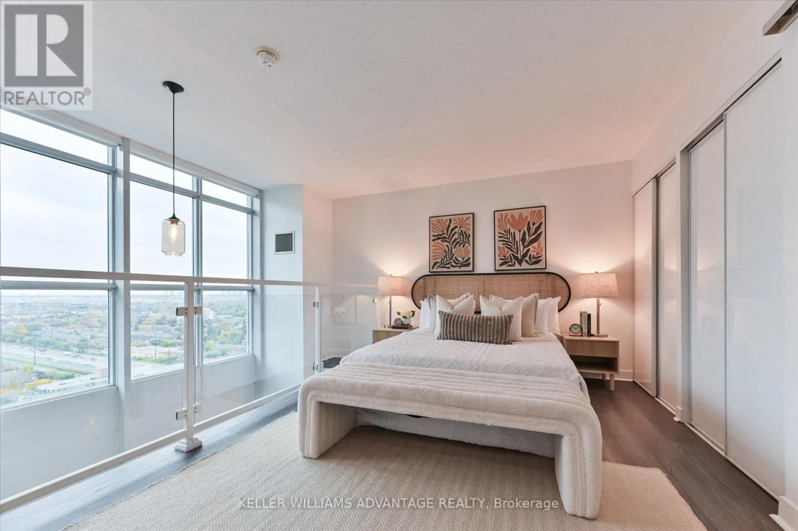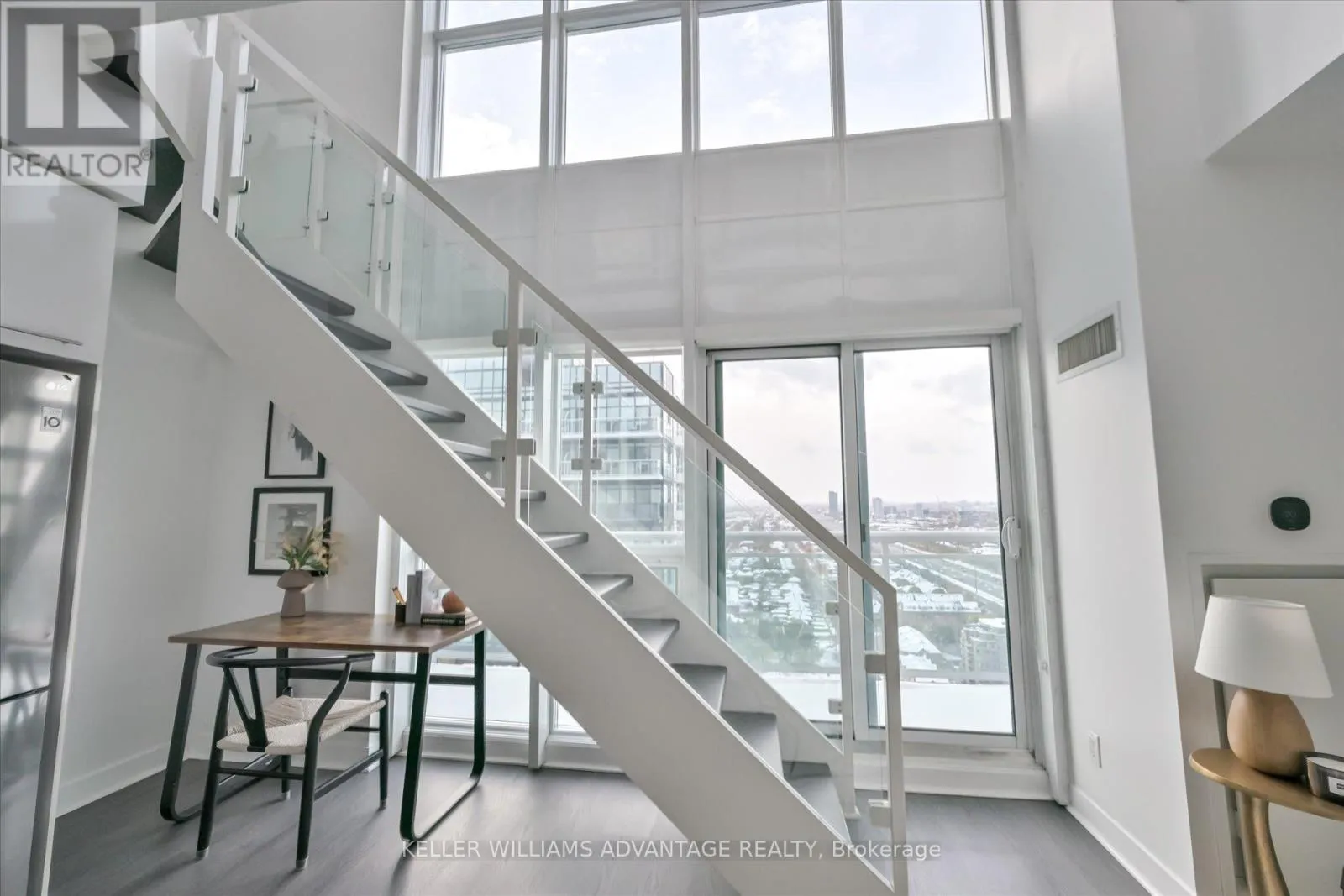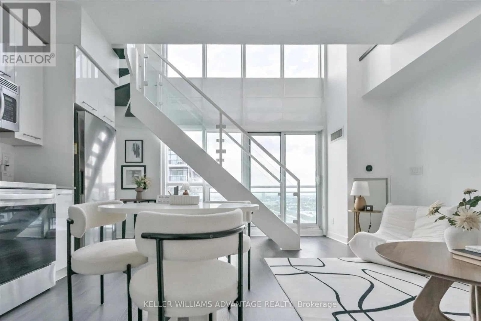 Lakeshore/Parklawn Step into Breathtaking Views from this sun-drenched, west-facing Penthouse unit, featuring dramatic 17ft ceilings with floor-to-ceiling windows. This striking two-story loft offers 720 sq. ft. of thoughtfully designed, open-concept living. The main floor presents a generous living and dining area, an elevated open kitchen with premium built-in stainless steel appliances, a two-piece powder room, and a private walk-out balcony that boasts an expansive view with sparkling lake views. A versatile nook beneath the stairs is ideal for a desk or pantry. The upper level is a luxurious master retreat, complete with custom his-and-hers closets with built-in organizers and a spa-like ensuite featuring a separate shower and soaker tub. This exceptional layout is perfect for a single or couple desiring ample space for a sophisticated work-from-home setup.Take advantage of resort-like facilities including: 24 hr concierge, full gym, party room, outdoor pool, rooftop deck with bbq's, games room, media room, sauna, and squash courts, bike storage and guest suites. Prime Mimico location: 3 min to the Gardiner Exp, 5 min drive to Mimico GO. Walk to the waterfront, walking trails, stores, groceries, public transit. One parking spot included. Floor plans attached. Check out the virtual tour! (id:27476)
