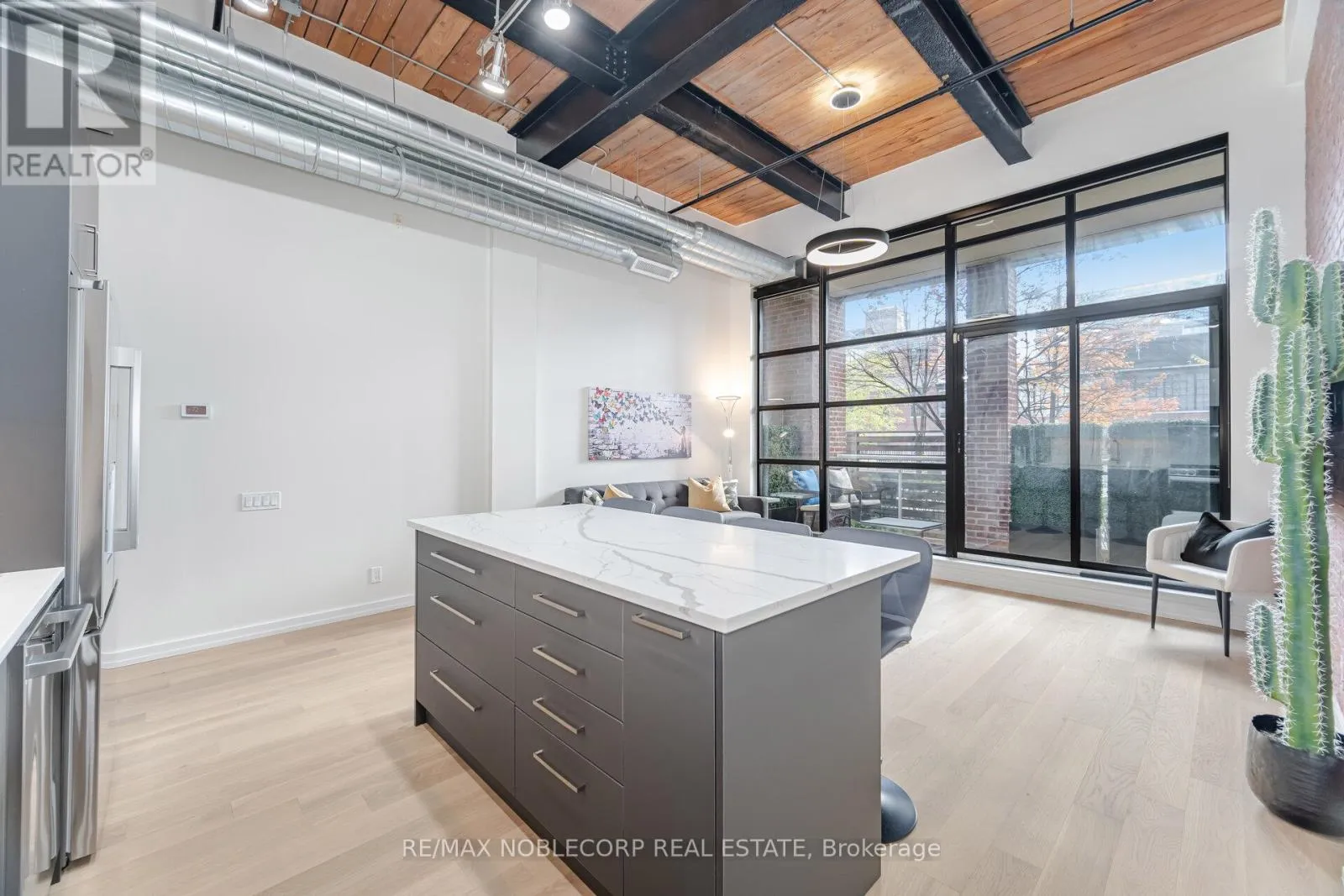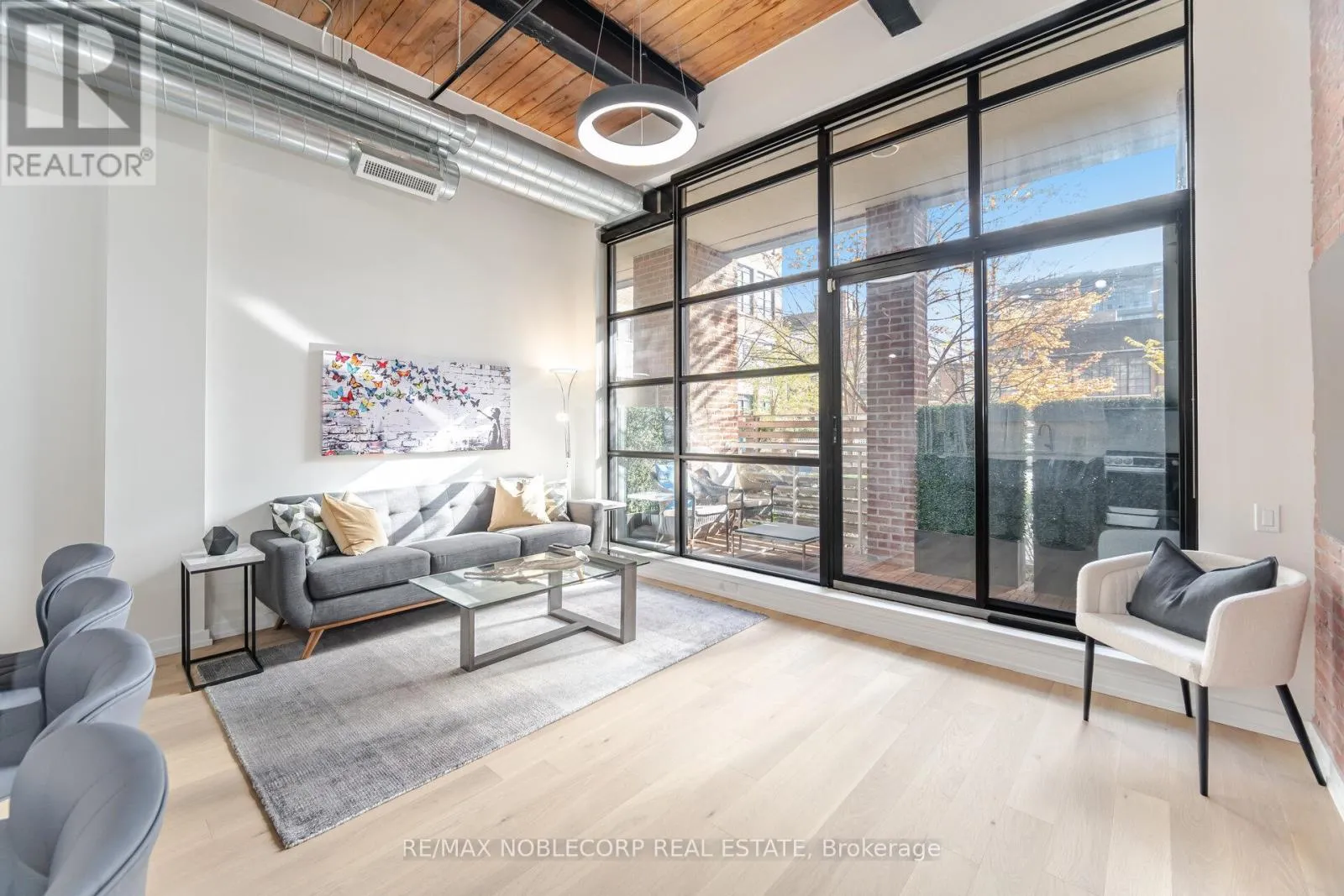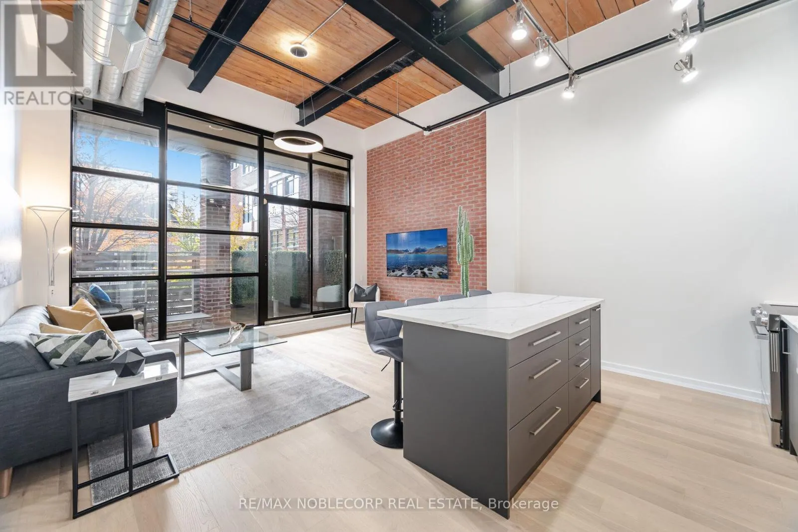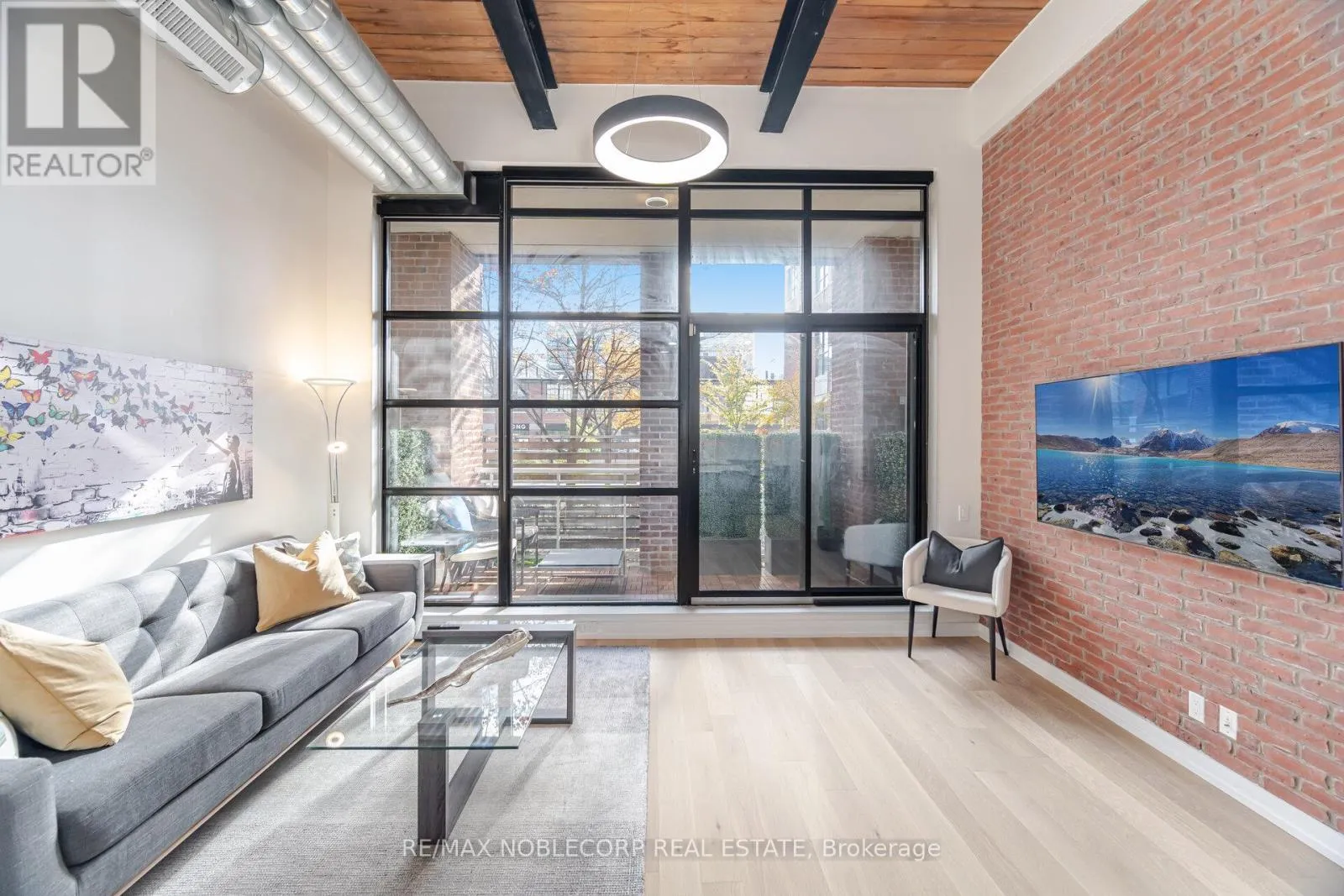 East Liberty st/ hanna ave Welcome to one of the most impressive lofts in the city, located in one of its most sought-after buildings! Be the first to enjoy this brand new unit - extensively renovated to the nines and never lived in! This rare, sunny, south-facing hard loft features a large original brick private terrace. The ground floor location offers a beautiful view backing onto the quiet, gated private courtyard. Soaring 13 ft. wood beam ceilings and exposed red brick create the perfect blend of old industrial charm and modern, sleek, high-end finishes. Enjoy easy, elevator-free access with prime ground floor parking and a locker literally just steps from the unit - living here truly feels more like a house. This loft has undergone a complete high- end renovation with the highest quality materials: brand new hardwood flooring, a stunning new bathroom with large porcelain tiles, heated floors, an oversized soaker tub, and premium vanities. The brand new two-tone kitchen features a custom glass backsplash and over $10K spent on top-of-the-line appliances. The exposed brick wall in the living area gives this unit a true "wow" factor - a special, unique space that shows 10/10! This unit is ideally situated on the south side of the building and is one of the few with outdoor space offering this desirable exposure. No need to worry about future condos being built in front of you! The building is exceptionally well-managed with low maintenance fees. Enjoy a convenient 5-minute walk to Exhibition GO Station with easy access to Union Station in just 8 minutes. A future subway station and a large park are also being developed right across the street. (id:27476)
