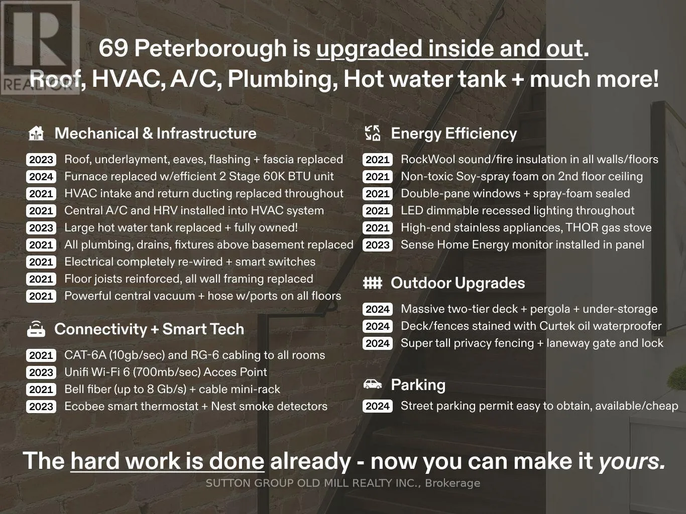 Cross Streets: Dufferin St + St Clair Ave W. ** Directions: West of Dufferin St, btwn St Clair Ave W + Davenport. Heritage Charm Meets Modern Confidence | Designer-Renovated Corso Italia Semi. Every so often, a home resolves Toronto's dilemma: character or reliability. For buyers seeking the soul of old Toronto with the confidence of a modern rebuild, 69 Peterborough Ave is reimagined for contemporary living. Step inside a light-filled, open-concept main floor where exposed brick & wide-plank engineered hardwood meet thoughtful flow. Custom Carrara marble kitchen features continuous slabs across the counters, waterfall island & backsplash that culminate in a full-height marble surround window frame. A walkout leads to the upper tier of acustom deck with pergola and privacy fencing (2024), extending the living space outdoors. Upstairs, a large primary suite showcases a statement brick wall & custom closet storage, while two additional bedrooms include built-in storage. A floor-to-ceiling linen closet adds thoughtful functionality to the upper level. Spa-inspired bath with custom Nero-Assoluto built-in window frame evokes boutique-hotel serenity and craftsmanship. Behind the beauty lies a system-level renovation: plumbing + electrical rework (2021), spray-foam RockWool insulation (2021), HVAC and HRV integration (2021), roof replacement (2023), updated furnace &hot water tank (2024), engineered for efficiency, longevity, peace of mind.Outside, the two-tier deck extends to a lower level with storage, while privacy fencing continues throughout the yard, creating a rare private retreat. The clean, generous basement includes under-stair storage, a workbench & an extra fridge, ready for your vision. Steps to The Sovereign Café, Tre Mari Bakery, & Geary Avenue's Famiglia Baldassarre, North of Brooklyn Pizza, & more. Old Toronto soul, rebuilt for modern life. Come see what makes this turn-key semi different, where the hard work is done, & your energy can go toward making it your own. Seller parks on street with permit. Peterborough Ave designated for residential street parking. (id:27476)