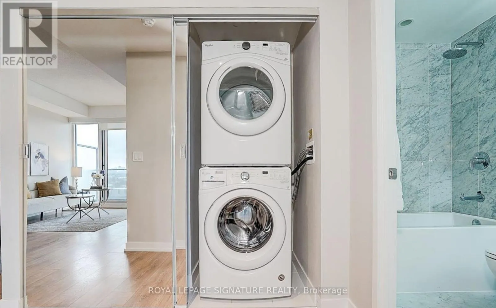 Leslie St / Sheppard Ave E Luxury sun-filled 1-bedroom plus den suite in prestigious Bayview Village featuring 633 sqft of interior space and a 127 sqft west-facing balcony with beautiful sunset views. This bright unitoffers 9-ft ceilings, floor-to-ceiling windows, and laminate flooring throughout. The modern kitchen is equipped with full-sized integrated appliances, quartz countertops, and smart cabinet organizers. The open-concept den can function as a home office or sitting area. Enjoy the convenience of a full-sized washer/dryer, spacious bedroom with a large closet, and included parking and locker. Professionally managed for peace of mind, this prime location is just steps to two subway stations, GO transit, Woodsy Park, Bayview Village, Fairview Mall,Canadian Tire, IKEA, Starbucks, and minutes to Hwy 401/404 and North York General Hospital.Residents have access to a wide range of premium amenities in the MegaClub, including a full-sized basketball court, indoor pool, gym, bowling alley, mini golf, tennis court, party room, pet spa, meeting room, BBQ courtyard, 24-hr concierge, and ample visitor parking. (id:27476)
