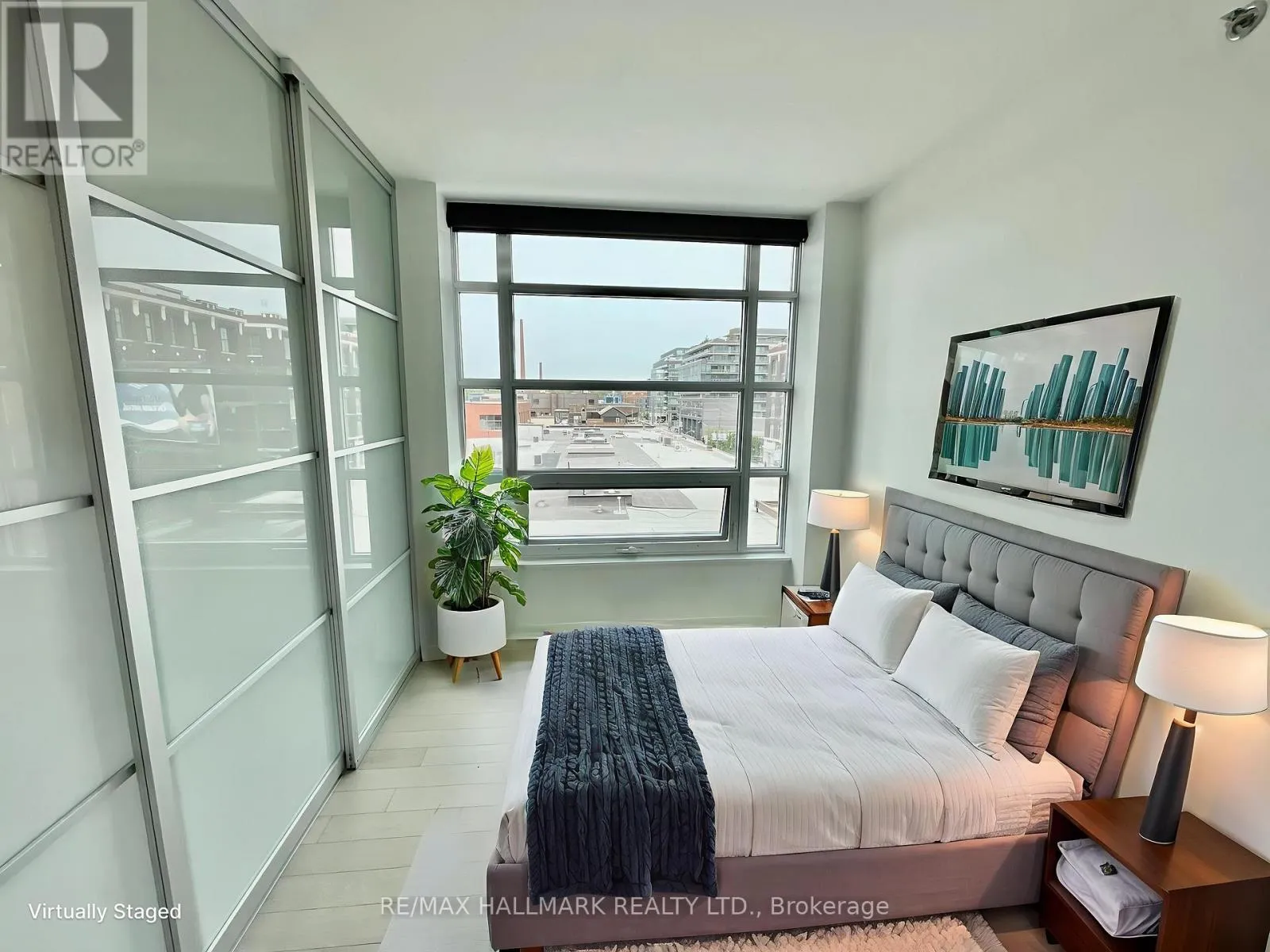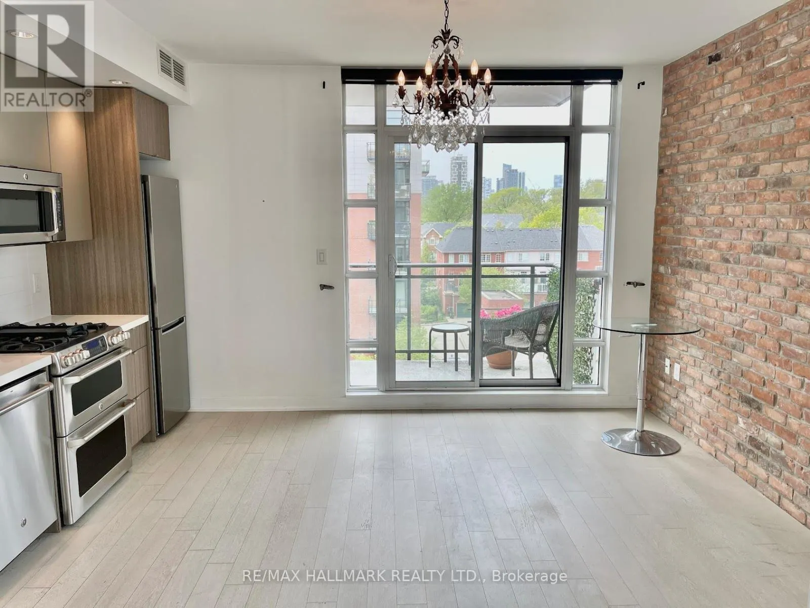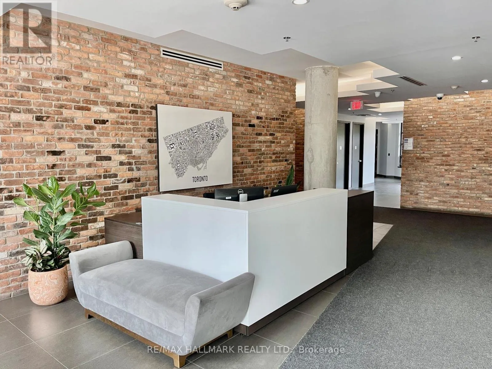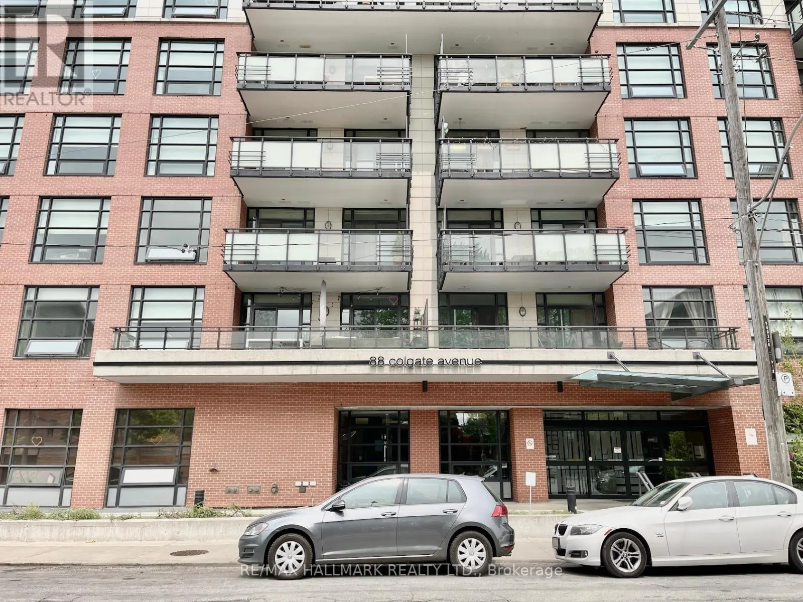 Cross Streets: Queen And Carlaw. ** Directions: Carlaw ave and Colgate ave. Experience loft living at Showcase Lofts in the heart of Leslieville. This sleek 1-bedroom suite blends exposed brick charm with a clean, modern open-concept layout. The kitchen features full-size stainless steel appliances, stone counters, and a gas cooktop-perfect for anyone who loves to cook. Hardwood floors run throughout, and the large bedroom window fills the space with natural light. You'll also find a spacious closet, in-suite laundry, a locker, and parking included. Enjoy a generous balcony overlooking the quiet courtyard-ideal for morning coffee or evening drinks. Step outside and you're moments from Queen Street's best cafés, restaurants, and transit. A stylish, move-in-ready home in one of Toronto's most vibrant neighborhoods. *Some photos have been virtually staged* (id:27476)