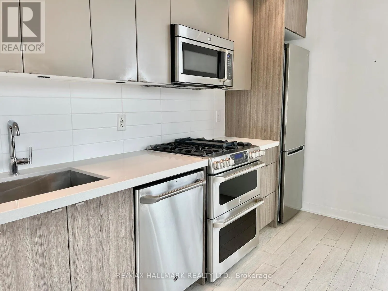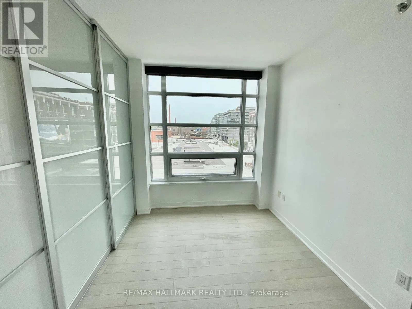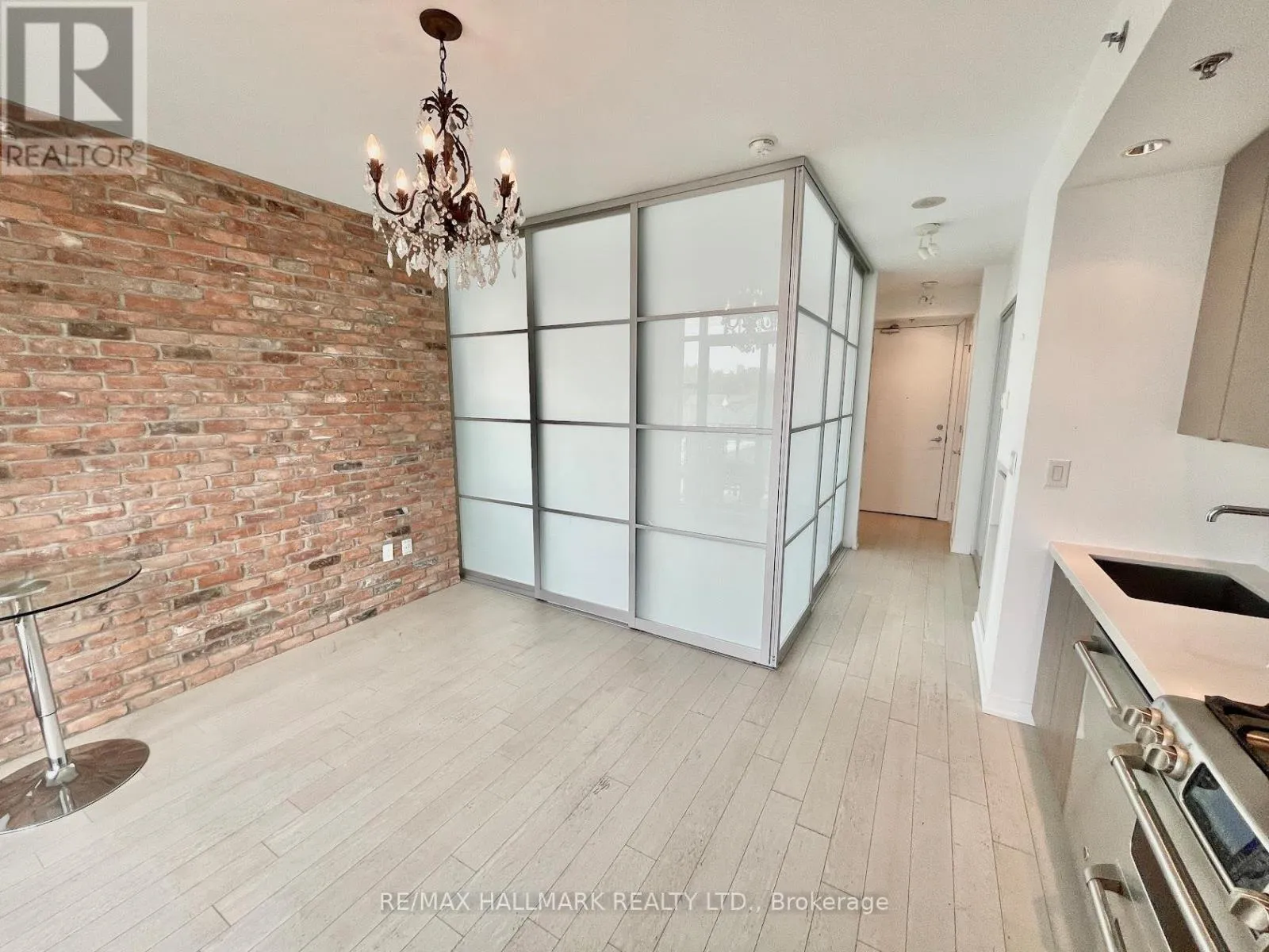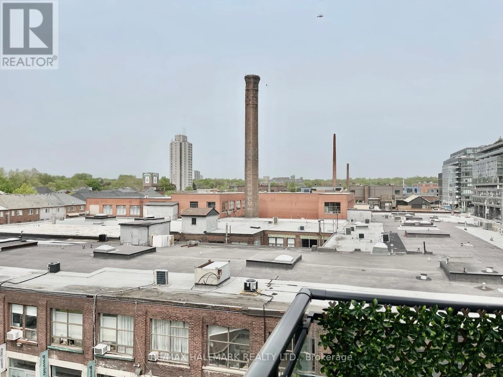 Cross Streets: Queen And Carlaw. ** Directions: Carlaw ave and Colgate ave. Experience loft living at Showcase Lofts in the heart of Leslieville. This sleek 1-bedroom suite blends exposed brick charm with a clean, modern open-concept layout. The kitchen features full-size stainless steel appliances, stone counters, and a gas cooktop-perfect for anyone who loves to cook. Hardwood floors run throughout, and the large bedroom window fills the space with natural light. You'll also find a spacious closet, in-suite laundry, a locker, and parking included. Enjoy a generous balcony overlooking the quiet courtyard-ideal for morning coffee or evening drinks. Step outside and you're moments from Queen Street's best cafés, restaurants, and transit. A stylish, move-in-ready home in one of Toronto's most vibrant neighborhoods. *Some photos have been virtually staged* (id:27476)