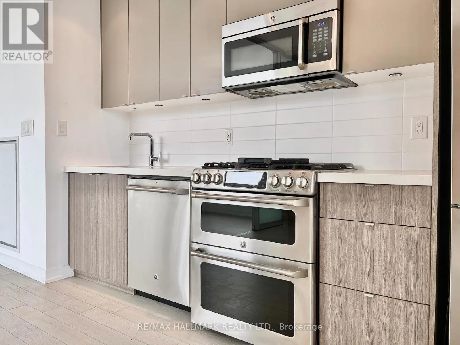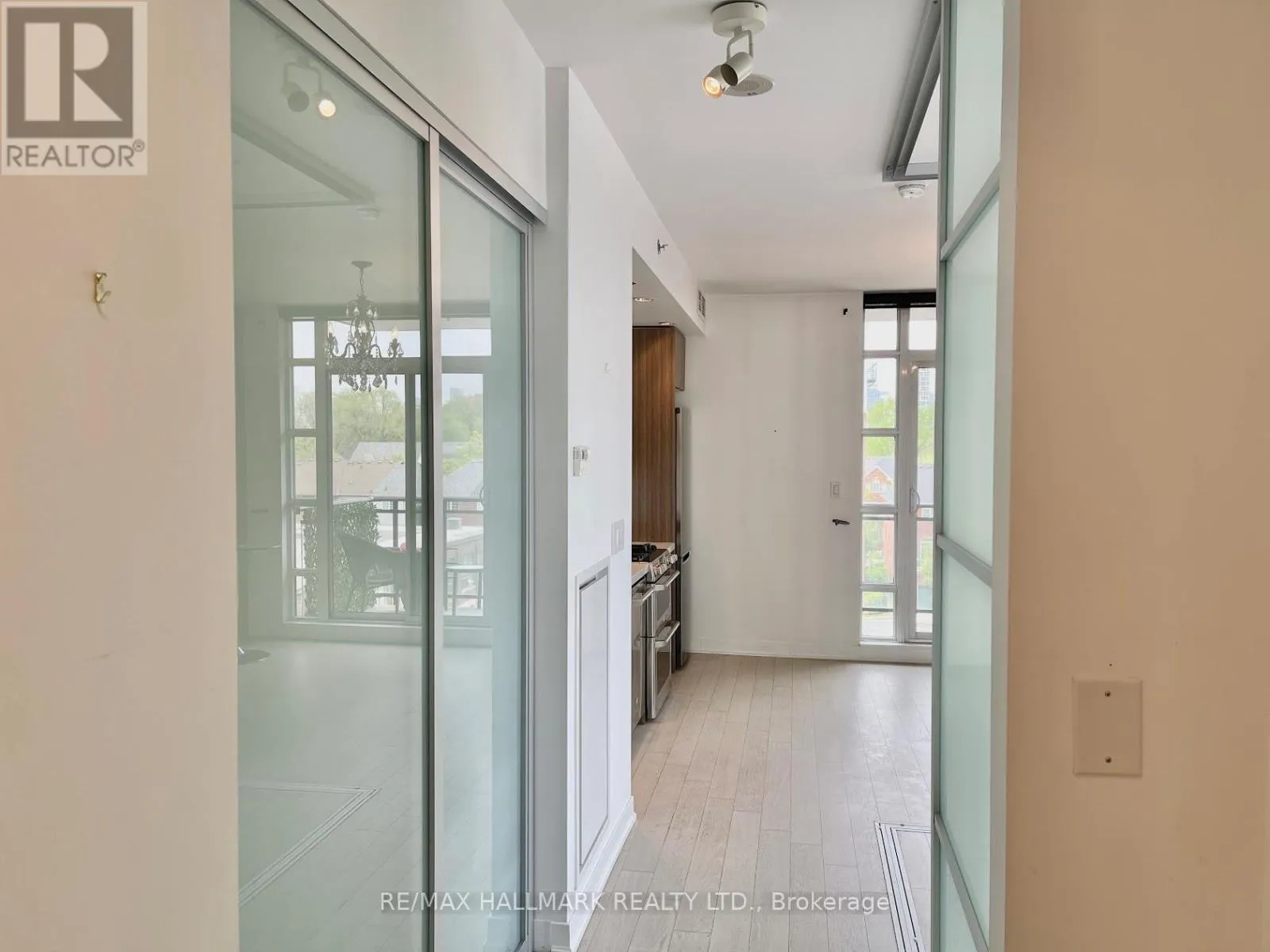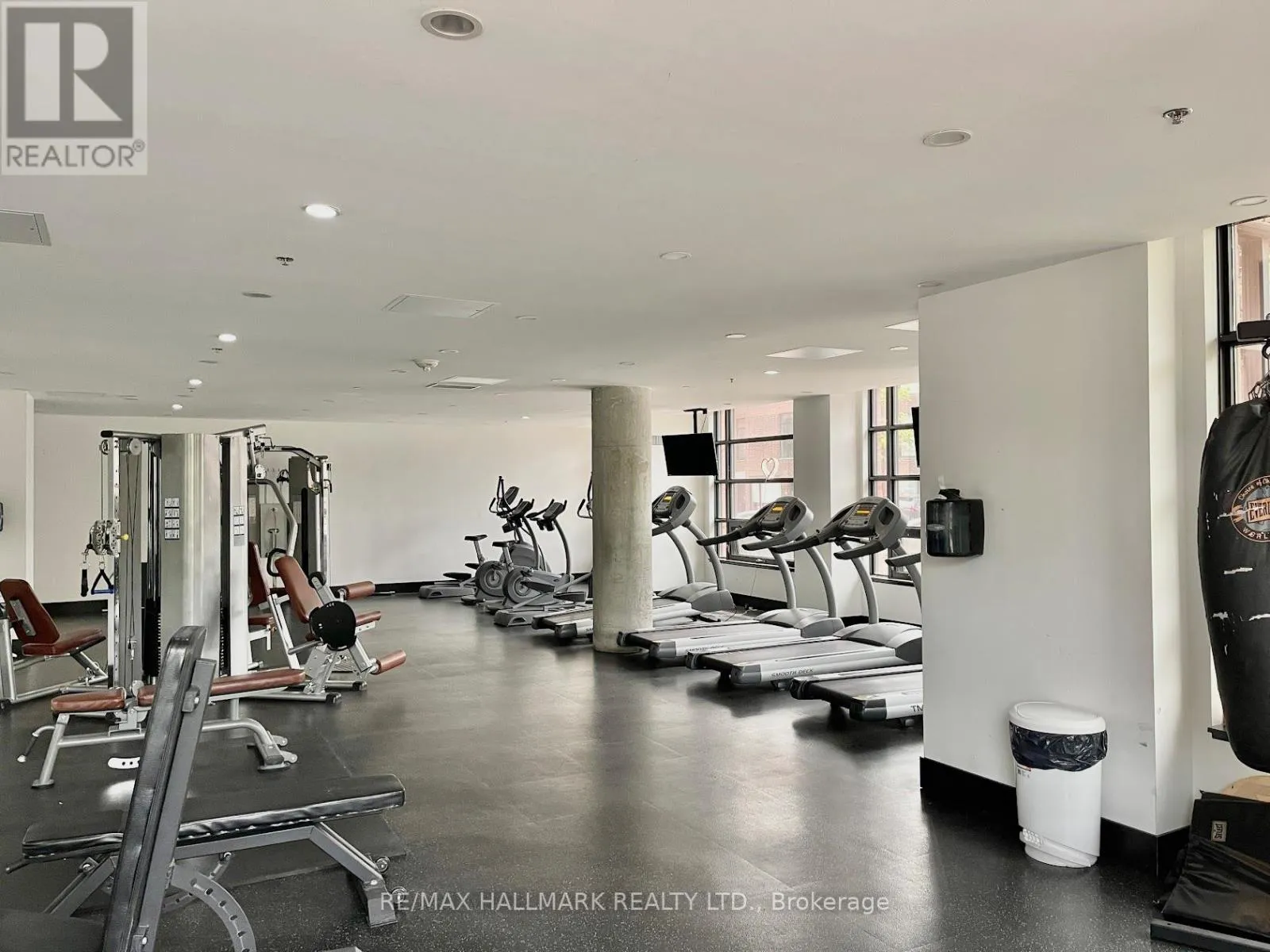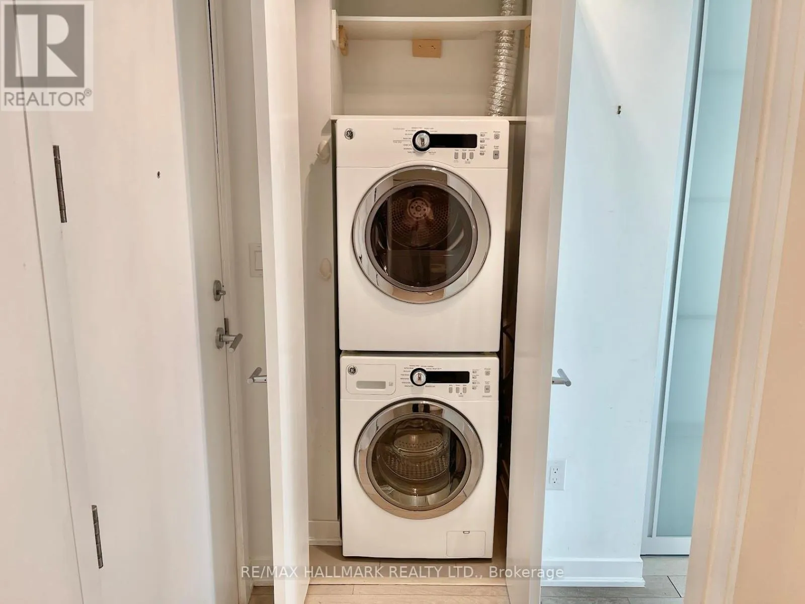 Cross Streets: Queen And Carlaw. ** Directions: Carlaw ave and Colgate ave. Experience loft living at Showcase Lofts in the heart of Leslieville. This sleek 1-bedroom suite blends exposed brick charm with a clean, modern open-concept layout. The kitchen features full-size stainless steel appliances, stone counters, and a gas cooktop-perfect for anyone who loves to cook. Hardwood floors run throughout, and the large bedroom window fills the space with natural light. You'll also find a spacious closet, in-suite laundry, a locker, and parking included. Enjoy a generous balcony overlooking the quiet courtyard-ideal for morning coffee or evening drinks. Step outside and you're moments from Queen Street's best cafés, restaurants, and transit. A stylish, move-in-ready home in one of Toronto's most vibrant neighborhoods. *Some photos have been virtually staged* (id:27476)