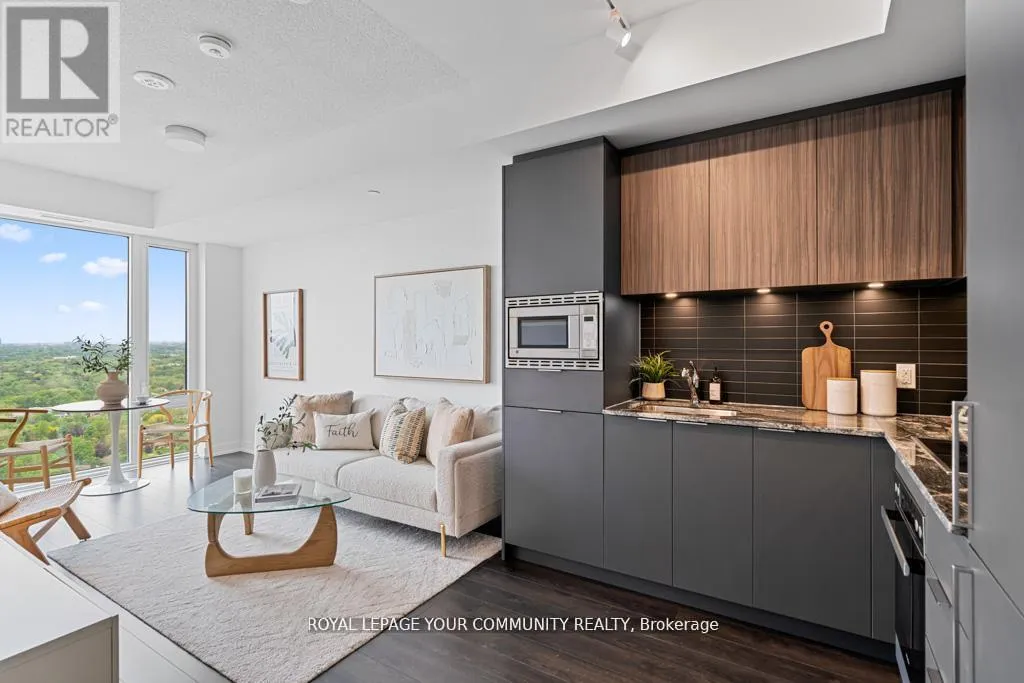 Don Mills Rd/Lawrence Ave E Living at Rodeo Drive, Shops At Don Mills best kept secret!Don Mills is in the heart of midtown, connected to great shopping, fine dining, schools, parks and community centres! Stunning 1 Bedroom + Den boasting unobstructed South & South West Views of the city core & beyond from your huge full-size balcony terrace! One of the most functional floor plans with no wasted space featuring enclosed den that makes for the perfect 2nd bedroom or home office. Enjoy open-concept living area with 9ft ceiling & wide vinyl floors T/O. Chef's Kitchen boasting integrated Miele appliances, quartz counters with under-mount lighting. Spacious primary bedroom with Walking closet featuring huge floor to ceiling windows with incredible views! Comes with 1 underground parking spot, just steps to Shops at Don Mills & minutes to DVP, HWY 401, TTC public transit, just five minutes to the south, you have the upcoming Crosstown LRT on Eglinton, a speedy gateway to east and west Toronto. it offers an array of amenities including a 24-hour concierge, security cameras, a pet spa, fitness room, dry sauna, indoor lounge/party area, outdoor pool, hot tub, and expansive deck with scenic views, outdoor lounge and BBQ areas, a dining room with kitchen, bar lounge,boardroom, and game room! (id:27476)