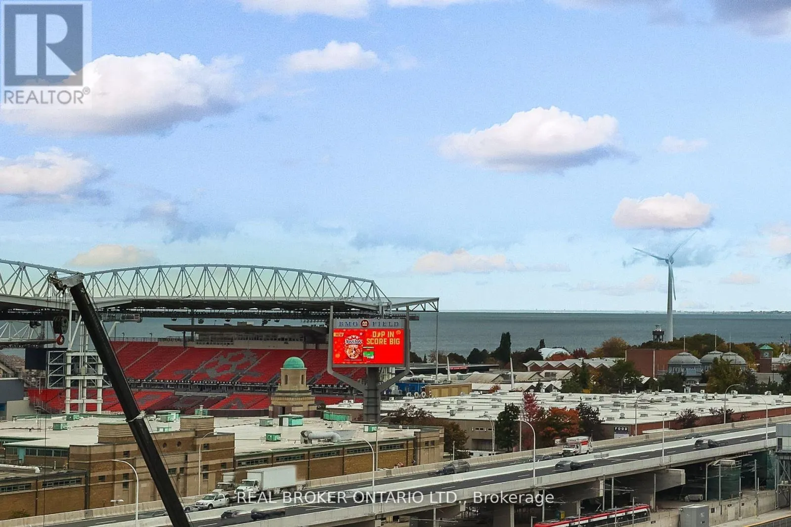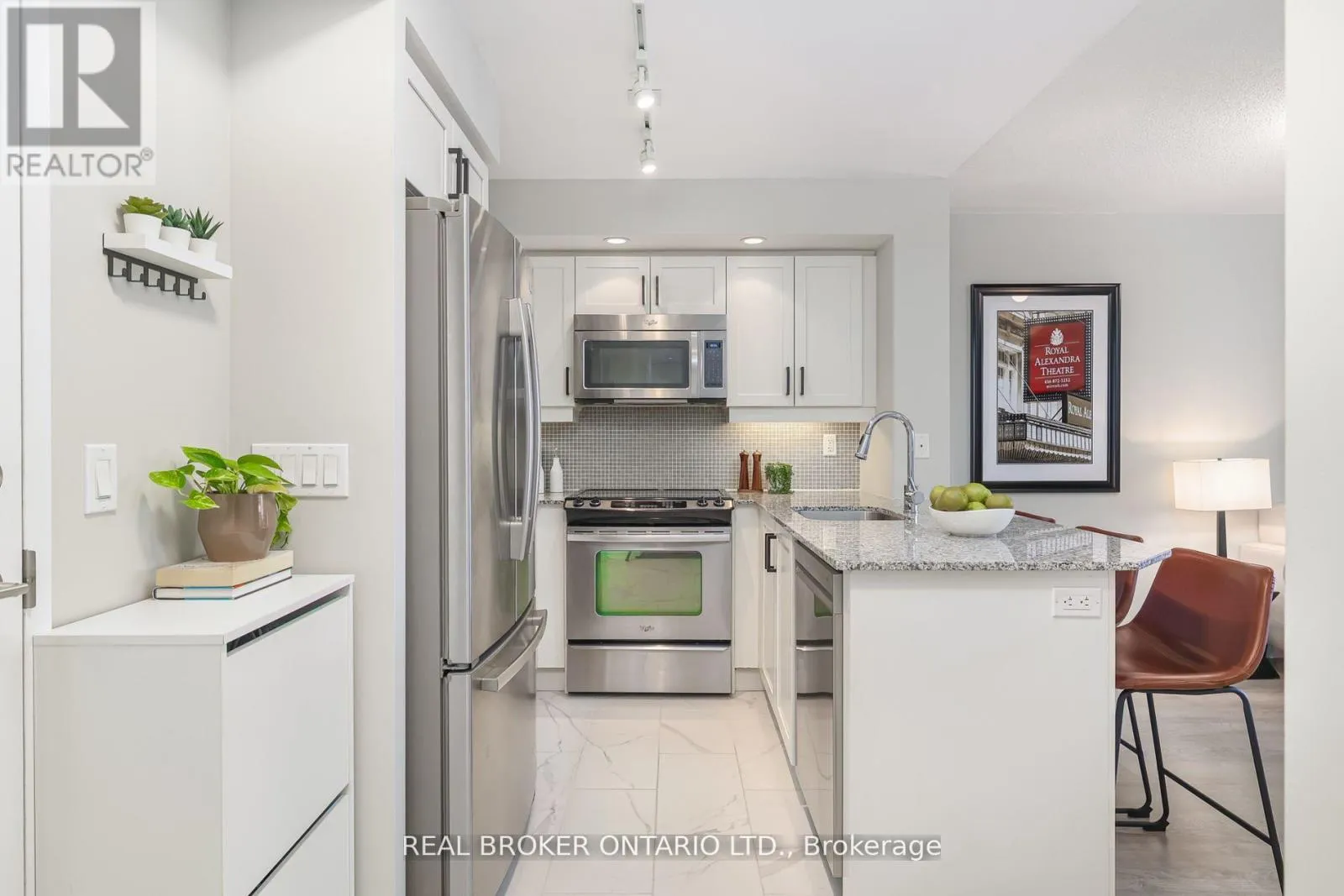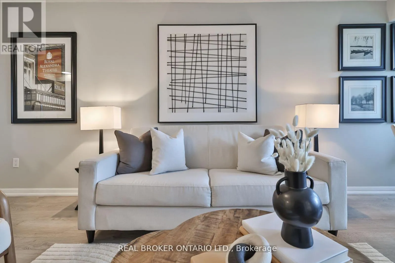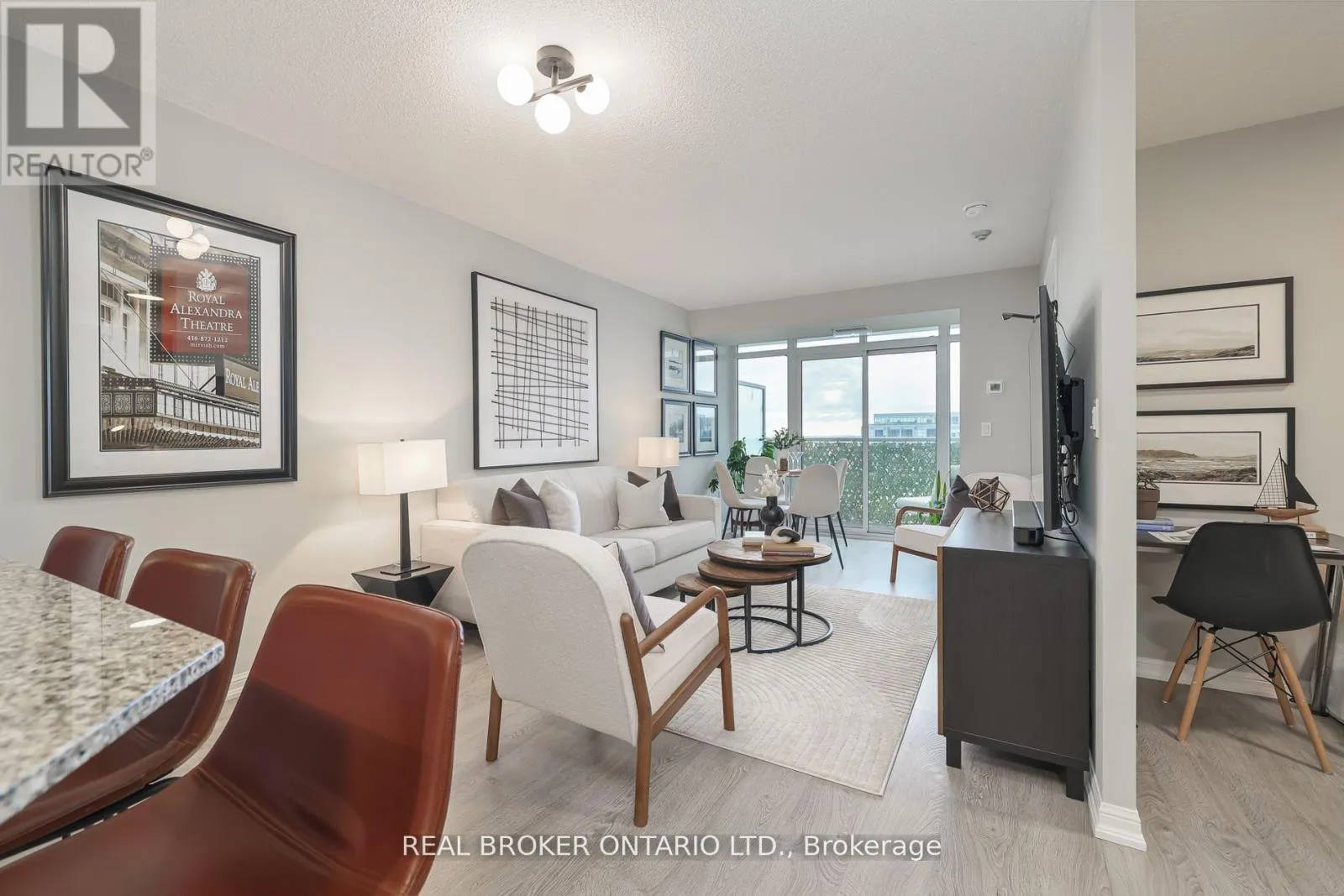 King St W and Strachan Ave This beautifully maintained modern one bedroom plus den condo combines comfort, space, and style in one of Toronto's most vibrant neighbourhoods. The open-concept layout is bright and functional, with fresh paint throughout and new tile floors added in the entry and kitchen. The den is much larger than a typical den, offering the versatility to be used as an office or a second bedroom. Large windows frame impressive city views, and every detail reflects care and pride of ownership, creating a home that feels welcoming from the moment you step inside. Located right in the heart of Liberty Village, you're surrounded by everything that makes downtown living so effortless. Groceries, cafes, restaurants, parks, and the waterfront are all just steps away, with public transit at your door for easy access across the city. Enjoy a full range of amenities including a 24-hour concierge, indoor pool, gym, virtual golf, bowling alley, movie theatre, guest suites, rooftop deck, and party room. With parking and a locker included, this condo delivers an easygoing lifestyle with all the comforts of home. Largest layouts in the building. (id:27476)