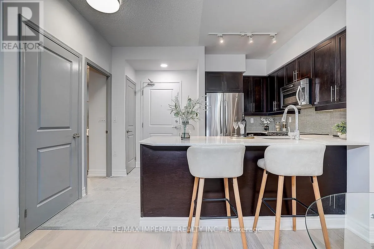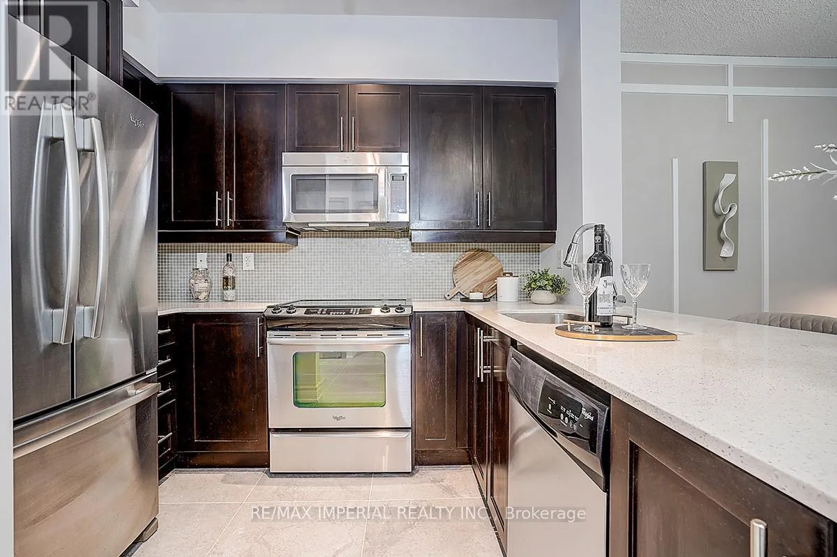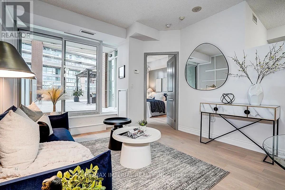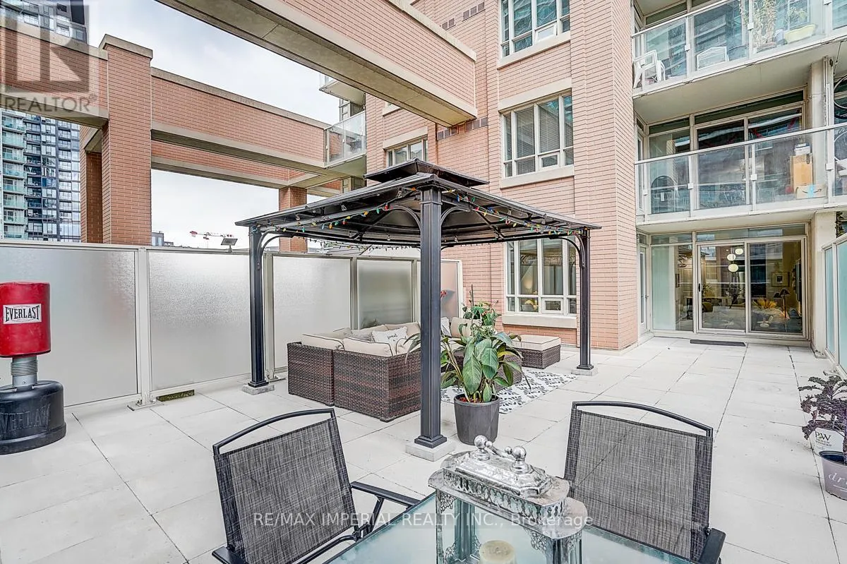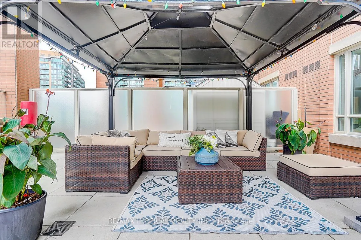 Cross Streets: King St W/Strachan. ** Directions: Western Battery & Lynn Williams. Experience elevated urban living in this exceptionally rare Liberty Village gem!This beautifully renovated 1+1 bedroom, 2-bath suite offers 675 sq.ft. of bright, functional living space paired with an extraordinary 633 sq.ft. private terrace-complete with a charming gazebo and remote-controlled solar string lights. This expansive outdoor retreat is one of the largest terraces in all of Liberty Village, providing unmatched possibilities for entertaining, gardening, outdoor dining, or simply unwinding beneath the skyline.Recent upgrades include new flooring with dry/wet separation, modern custom curtains, and a refreshed vanity, blending contemporary style with everyday practicality. The open-concept layout features stainless steel appliances, granite countertops, hardwood floors, and a versatile den perfect as a home office or second bedroom.Residents enjoy access to premium building amenities: 24-hour concierge, fitness centre, theatre room, rooftop lounge, guest suites, and more. With a 95 Walk Score, you're steps from cafes, restaurants, parks, and TTC-right in the heart of one of Toronto's most vibrant neighbourhoods.Complete with one parking space and one locker, this exceptional suite combines comfort, design, and strong investment potential-delivering a truly rare living experience in Liberty Village. (id:27476)