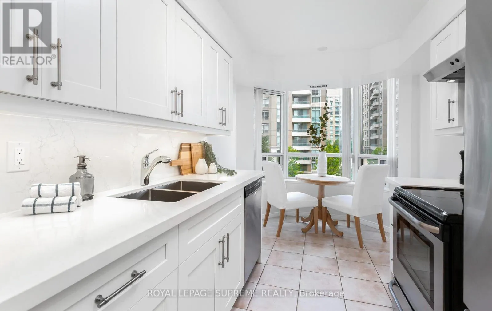 Yonge & Finch BEST value per sqft with renovations! Welcome to the Chic Chicago Residence, a beautifully renovated and impeccably maintained 1,058 sq ft corner suite in the heart of Yonge & Finch. This bright and spacious 2-bedroom, 2-bathroom home features engineered hardwood floors, pot lights, and a thoughtfully designed layout that maximizes every inch of space. The separate eat-in kitchen offers stainless steel appliances, updated white cabinetry, brushed-nickel hardware, and a dedicated breakfast area framed by a charming bay window with picturesque views. The primary bedroom offers a walk-in closet and a 4-piece ensuite. The second bedroom provides direct access to a generous private terrace, perfect for morning coffee or outdoor relaxation. Both bathrooms have been refreshed with modern white vanities, oversized mirrors, and bright, updated lighting. A rare bonus: the oversized in-suite laundry room, large enough to double as a full pantry or additional storage room. Enjoy the convenience of transit right at your doorstep, with Finch subway station just steps away. This pet-friendly building offers an impressive array of amenities, including an outdoor pool, sauna, fully equipped gym, weight room, party/meeting room, guest suites, and visitor parking. This spotless unit shows A+ just move in and enjoy! (id:27476)