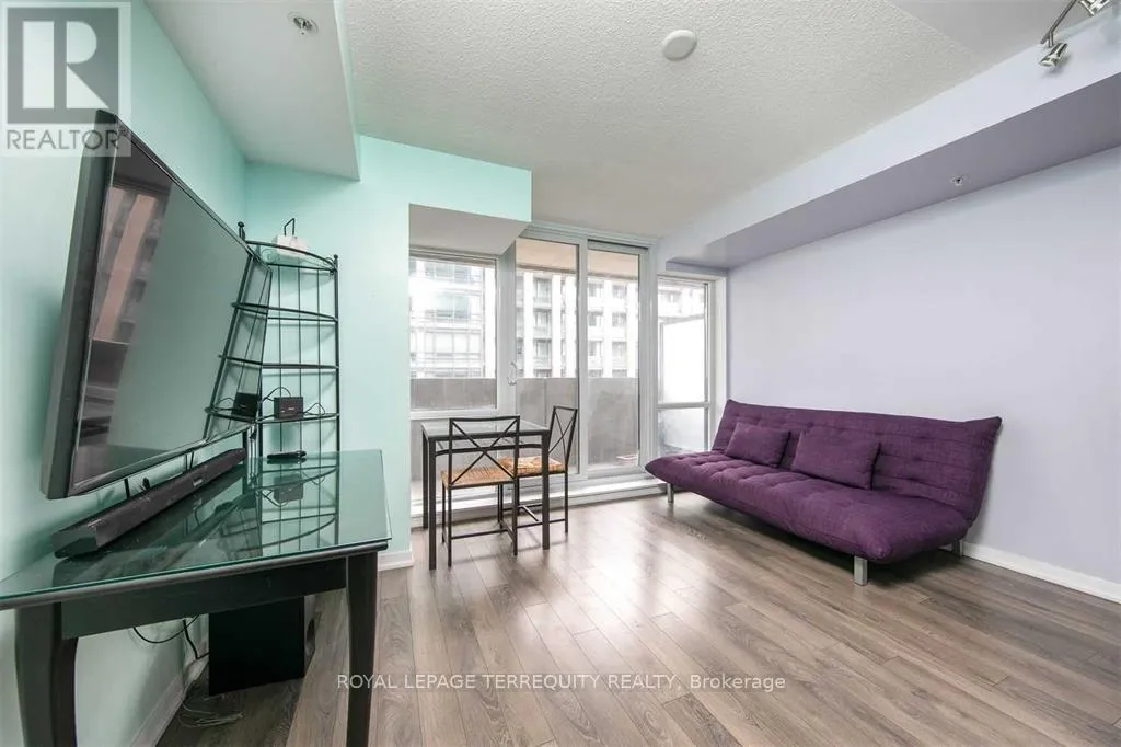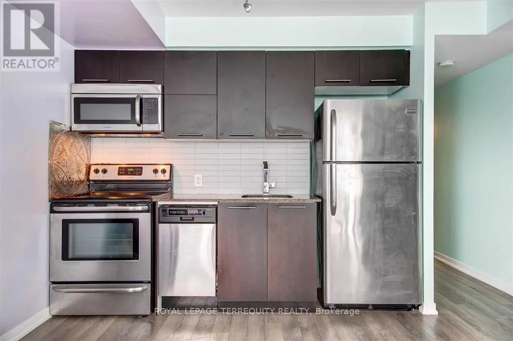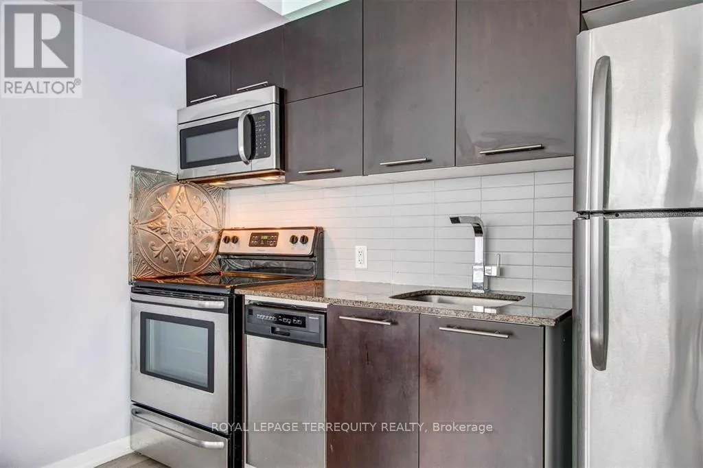 King and Joe Shuster Bright and spacious one bedroom suite with a wide layout, big windows, and a full length balcony that fills the unit with natural light. The open concept living area has enough room for both a dining zone and an office setup, creating a functional space that is ideal for working or entertaining. The bedroom is generously sized and easily fits a queen bed with room for a dresser, giving you the comfortable layout you want in a downtown condo. Fuzion is a boutique sytly midrise building just off King West West with short elevator waits, great visitor parking, and a quiet residential feel only steps from transit, shops, restaurants, Liberty Village, and daily conveniences. Includes washer, dryer, fridge, stove, built in dishwasher, and all light fixtures. (id:27476)