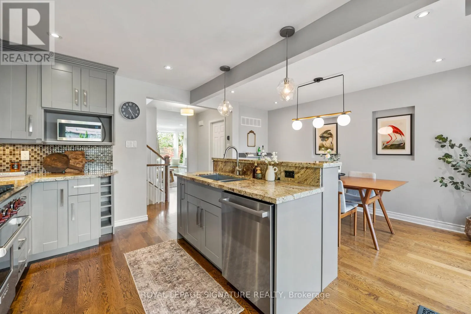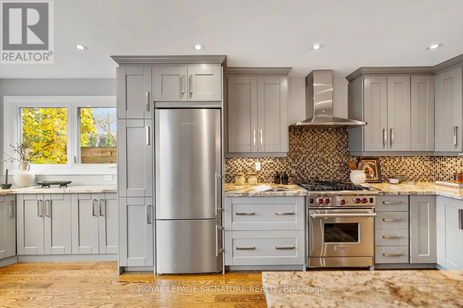 West of Pape Ave. & North of O'Connor Dr. **Say hello to this stylish, turn-key home on Beechwood Drive one of the most coveted streets in East York's Golden Triangle.**Inside, you will be welcomed by a generous foyer with a double closet. The living room offers a calm, inviting retreat with a beautiful gas fireplace, custom bench seating, built-ins, and a picture window framing a charming country-like view. The chef-inspired kitchen features a centre island, high-end appliances, granite countertops, and ample storage, with a BBQ gas line just outside the back door. The main-floor 2-piece bath is a real treat.Upstairs, a skylight pours natural light over the staircase. The king-sized primary features a wall-to-wall closet with custom built-ins and a large picture window overlooking peaceful foliage. The additional two bedrooms each offer double closets with built-ins, making the entire upper level as functional as it is inviting.The high basement features a great rec room for family time, a bedroom ideal for guests or a work-from-home office, and a 4-piece bath. It also includes a rough-in for kitchen plumbing and a 240V outlet, perfect for future possibilities, all easily accessible from the separate side entrance.The house has been thoughtfully updated, reflecting a conscientious homeowner, with many upgrades including 2025 shingles, upgraded windows, newer AC and furnace, a 200-amp service, and more. A home inspection report is available.Located on a quiet street, this standout property offers a private fenced backyard, exclusive laneway parking with a convenient carport, and immediate access to the Don Valley trail system. Walk to parks, the library, WB Public School, the community centre, and just a 10-minute walk to the future subway station at Pape and Cosburn. Close to major highways, local shopping, transit options, and the vibrant restaurants of The Danforth, this home checks every box for comfort, charm, and convenience. (id:27476)