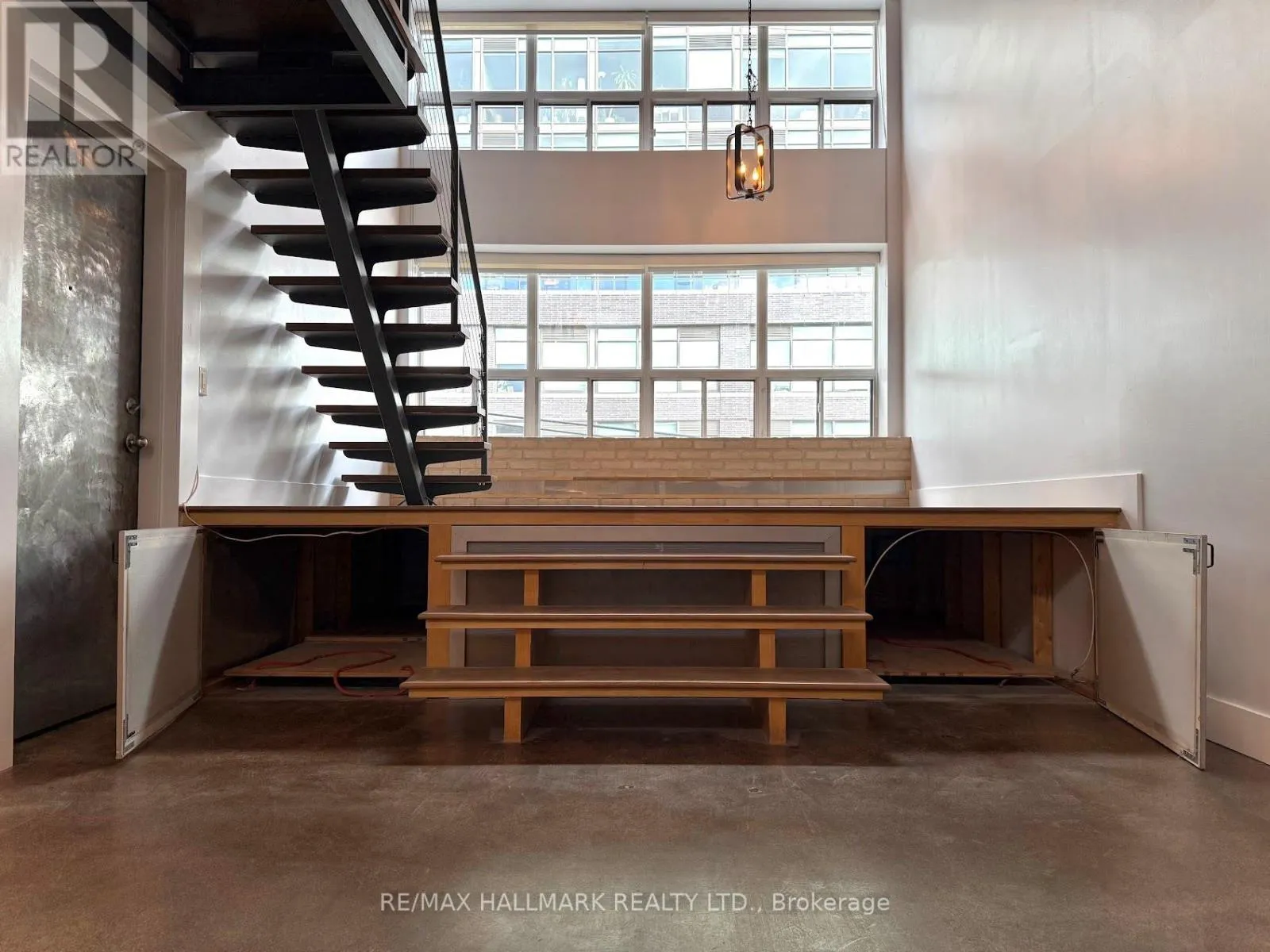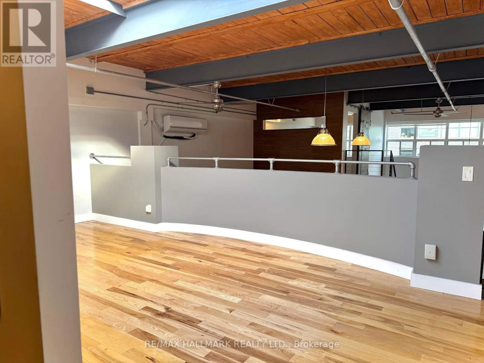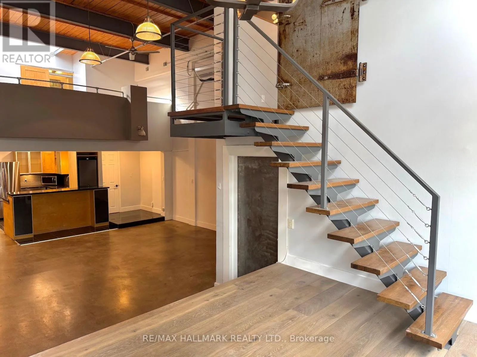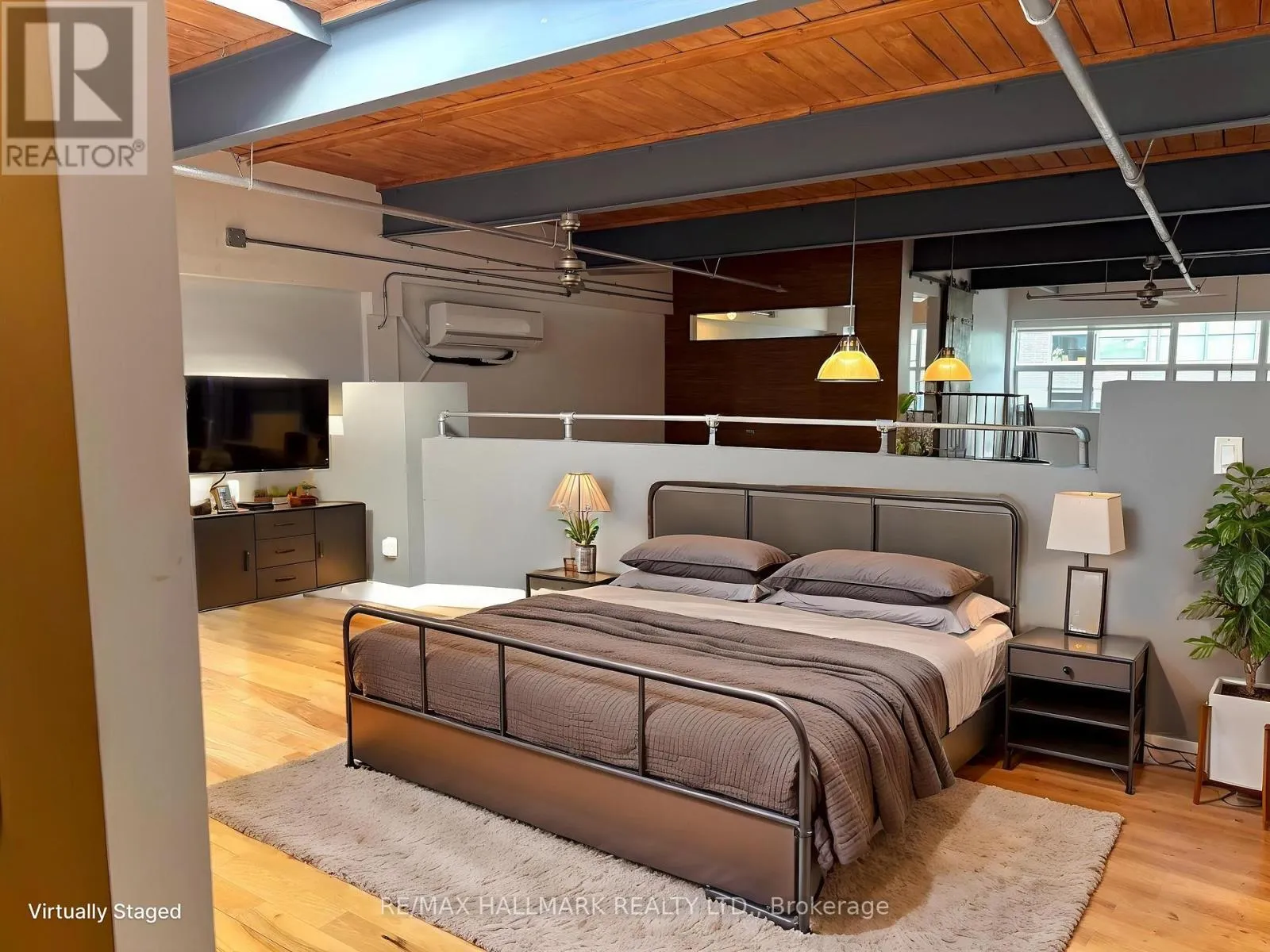 Cross Streets: Carlaw. ** Directions: South West side of Dundas St E & Carlaw Ave. Gorgeous 2 bedroom, 2 washroom hard loft in Leslieville's iconic Izone. This loft stands out with soaring 17 foot ceilings, two mezzanines, parking, locker, and a rare second entrance. This east facing layout has been thoughtfully updated with a large skylight, walk in closet, wood plank ceiling detail, and an open concept kitchen finished with Ceaserstone countertops. The raised dining area features new hardwood floors and a custom staircase that leads to the second bedroom. Newer AC unit as well. The private second entrance gives you direct access to your locker and a quick walk out to Carlaw Ave, then straight under to your dedicated parking spot. A rare chance to live or work in one of the most sought after loft conversions in the east end. True hard loft character with exposed elements, volume, and natural light throughout. Residents enjoy use of the rooftop party room, loading docks, and a creative, community driven building. All of this in the heart of Leslieville, steps to Queen Street's shops, restaurants, cafes, galleries, transit, and minutes to the DVP and the downtown core. Loft living at its best! Some photos are virtually staged. (id:27476)
