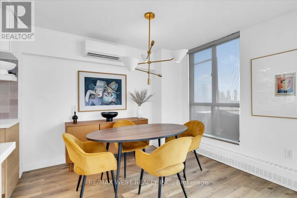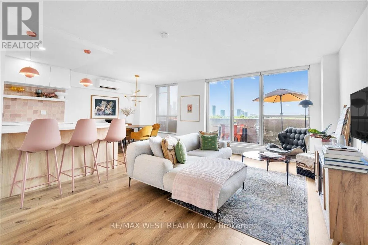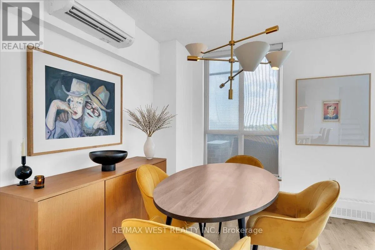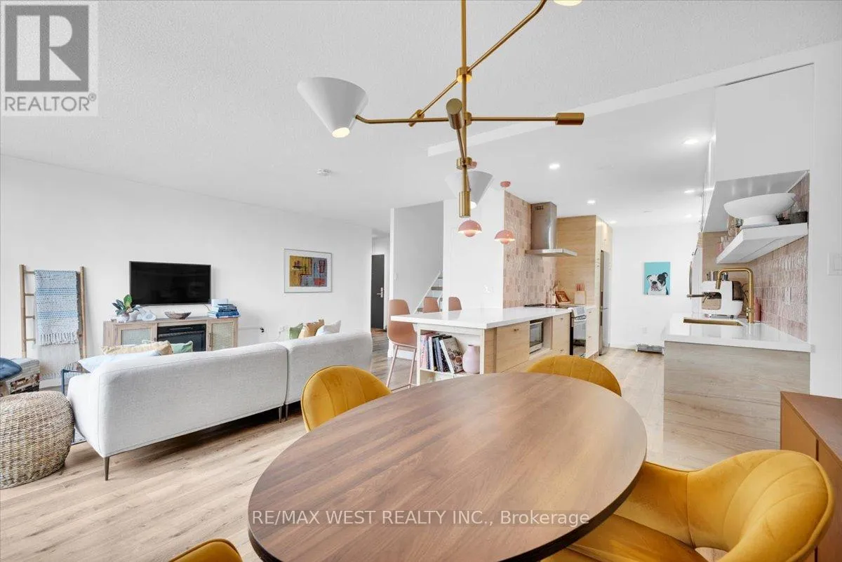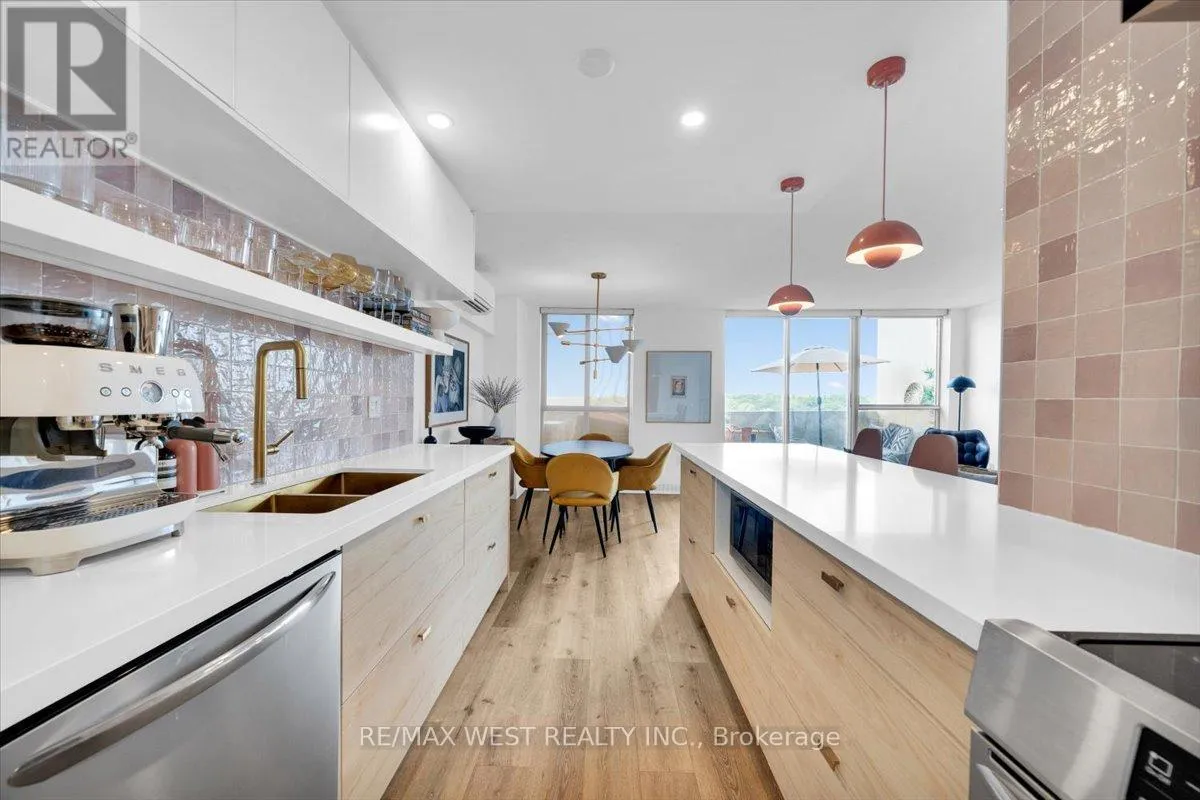 South Kingsway/Ormskirk Ave Fall head over heels in this one-of-a-kind professionally designed two-storey corner suite the moment you arrive. Rarely offered in High Park-Swansea, this three-bedroom, one-bath, two-storey condo showcases panoramic views of the Humber River and Lake Ontario from every room. Expansive floor-to-ceiling windows fill the open-concept layout with natural light and offer serene treetop views.The open living and dining areas create a backdrop for gatherings. The chef-inspired kitchen boasts white quartz countertops, a blush-pink tile backsplash, stainless steel appliances and three terracotta pendants above the island. A custom eat-in nook framed by water views sets the scene for morning coffee. Upgraded hardwood floors and designer lighting complete the aesthetic. Sliding glass doors open to an oversized private terrace with treetop and water views, creating the perfect oasis. Enjoy barbecues, alfresco dinner gatherings and beautiful sunrises and sunsets. This secluded terrace truly completes the condo experience. Discover three generous bedrooms bathed in natural light and framed by lush treetop scenery. The spa-like bathroom makes a bold statement with lush botanical wallpaper, a deep soaker tub, a sleek black shower head and matching fixtures. Additional conveniences include one exclusive underground parking spot, a private storage locker and all-inclusive maintenance fees covering cable television and high-speed internet. The building amenities include pool, gym, sauna, tennis court, security guard, private dog park, visitor parking, bicycle storage and tennis courts. Ideally located steps from High Park, Lake Shore Waterfront Trails, Grenadier Pond, local cafes, cheese boutique, and easy access to The Queensway, Lake Shore, Bloor Street West, and TTC. This designer suite offers the ultimate blend of modern style, comfort and city convenience. Unpack, move in and start living the elevated lifestyle you've been dreaming of, welcome home! (id:27476)