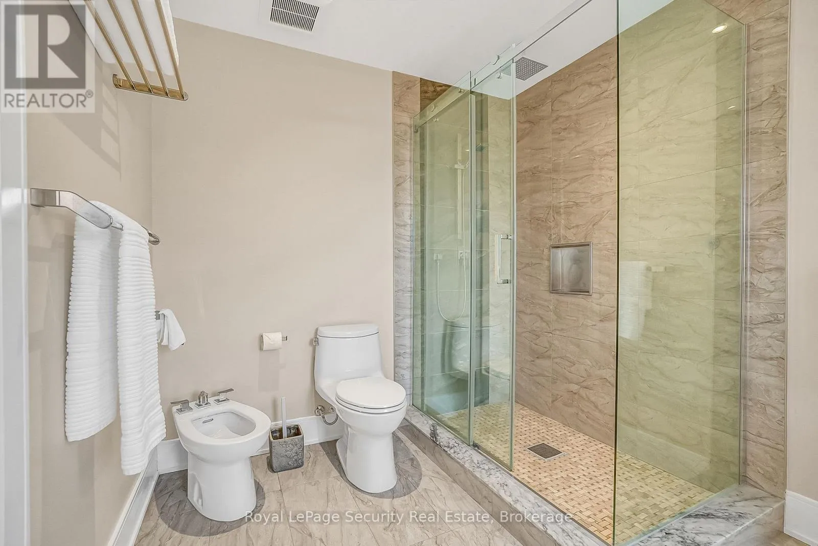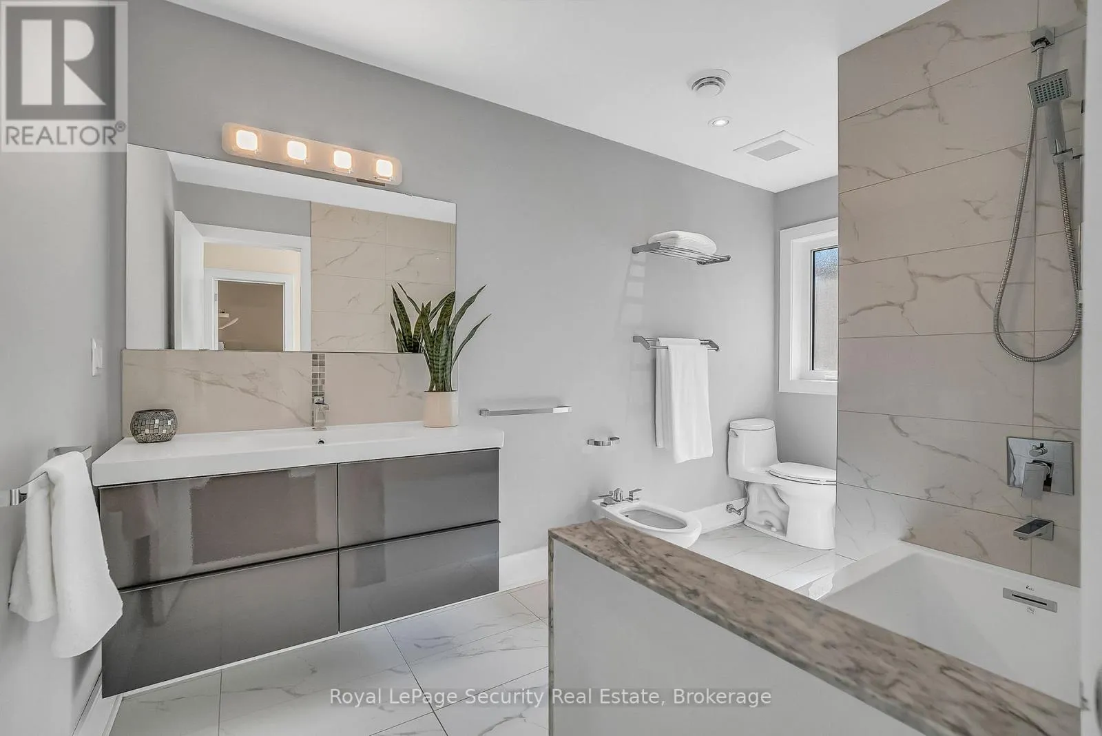 JANE/EGLINTON Prepare to be captivated! This extraordinary property, tucked away on a tranquil, private dead-end street, is the definition of modern luxury. The impressive 2017 second-storey addition and full remodel created a seamless, open-concept layout perfect for today's lifestyle. The gourmet kitchen boasts quartz countertops, a generous center island, ample storage with pot drawers and a dedicated pantry, and a convenient pot filler faucet. Elegant hardwood flooring graces both the main and second levels. The upper floor is a private oasis. Retreat to the spacious Primary Bedroom, featuring a stunning coffered ceiling, a charming Juliette balcony, and a custom walk-in closet. The spa-inspired 6-piece ensuite offers indulgence with a rain shower head, frameless glass enclosure, a bidet, and a luxurious free-standing soaker tub. The equally impressive second-floor hall bath includes a floating vanity, separate shower, bidet, and a soaker tub.For ultimate convenience, the home is equipped with dual laundry facilities (second floor and basement). The finished basement offers extended family living or nanny quarters with a separate-entrance apartment. Enjoy the peace of mind provided by the transferable lifetime warranty on the installed LeafFilter Gutter protection. The generously sized lot is designed for entertaining, featuring a large deck, a finished patio stone area, and a side garden. Additional features include an oversized two-car garage, superior front landscaping with 16-inch concrete foundations, and comprehensive perimeter weeping tile drainage. Located just steps from parks, transit (TTC), and essential amenities, this is a unique, meticulously upgraded must-see property! (id:27476)