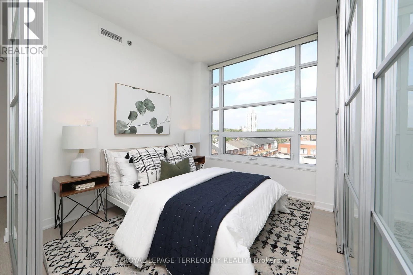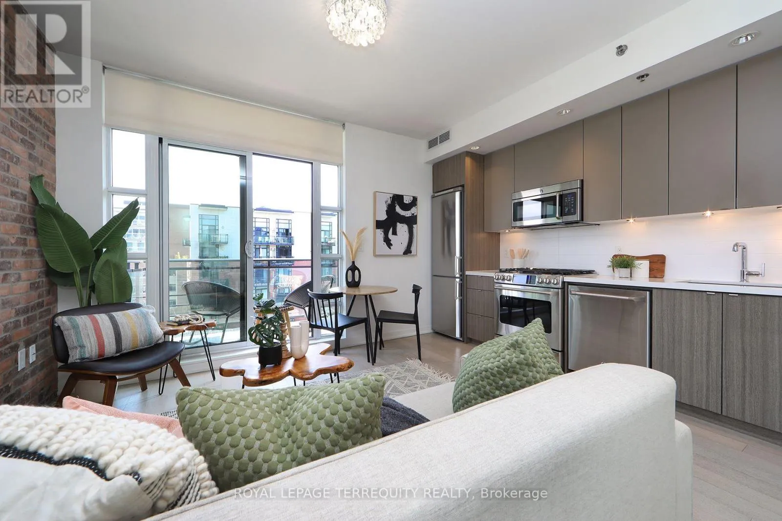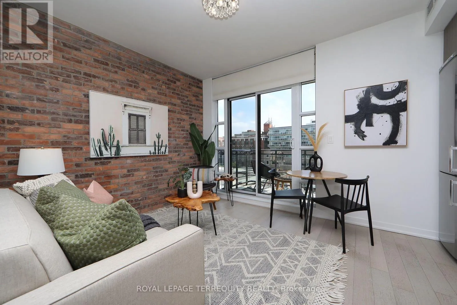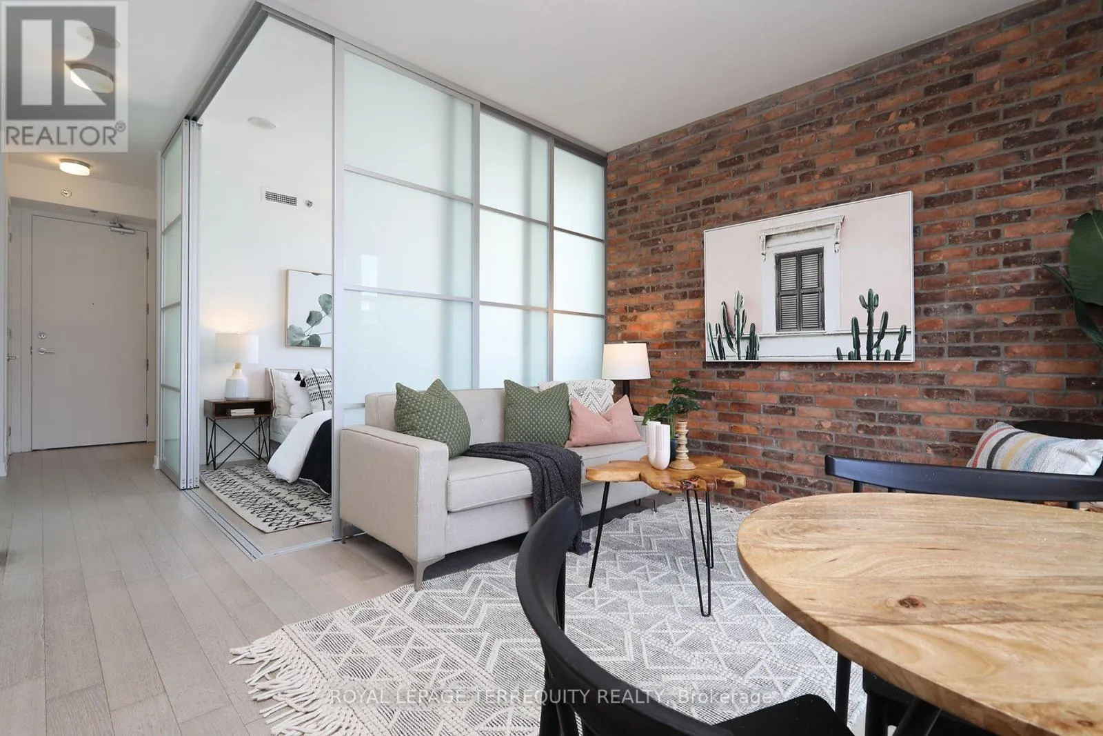 Cross Streets: Carlaw Ave & Queen St East. ** Directions: S of Carlaw. A rare find in the heart of Leslieville - this 1-bedroom corner suite wraps you in light from two exposures, north & east, thanks to an exclusive builder upgrade. At just the right height above the street, you'll feel the city's pulse yet enjoy your own quiet escape. Soaring 9-ft ceilings, a striking brick feature wall, and sleek stone counters set the stage for a home that's as stylish as it is comfortable. Sliding glass doors frame the bedroom, where a rare, large window floods the space with light - balanced by blackout blinds for those slow, indulgent weekends. Step onto your large, private balcony (not shared) with power and watch the neighborhood wake up. This suite includes a deeded parking spot, storage locker, and a bike storage locker - because life here calls for cycling to the market or down the Don Valley trails. The building's boutique charm comes with big amenities: a rooftop deck for sunset cocktails, a well-equipped gym, guest suites, concierge service, party room, theatre room, and visitor parking. Outside your door, Queen Street East buzzes with some of the city's best cafes, bars, and boutiques. Ascari, Crows Theatre, John Chang Park, and Jimmy Simpson Park are steps away, while the DVP and transit make Downtown or the Danforth feel impossibly close. This isn't just a home - its a front-row seat to the best of Toronto's east side. Stylish, effortless, and ready for your next chapter. (id:27476)