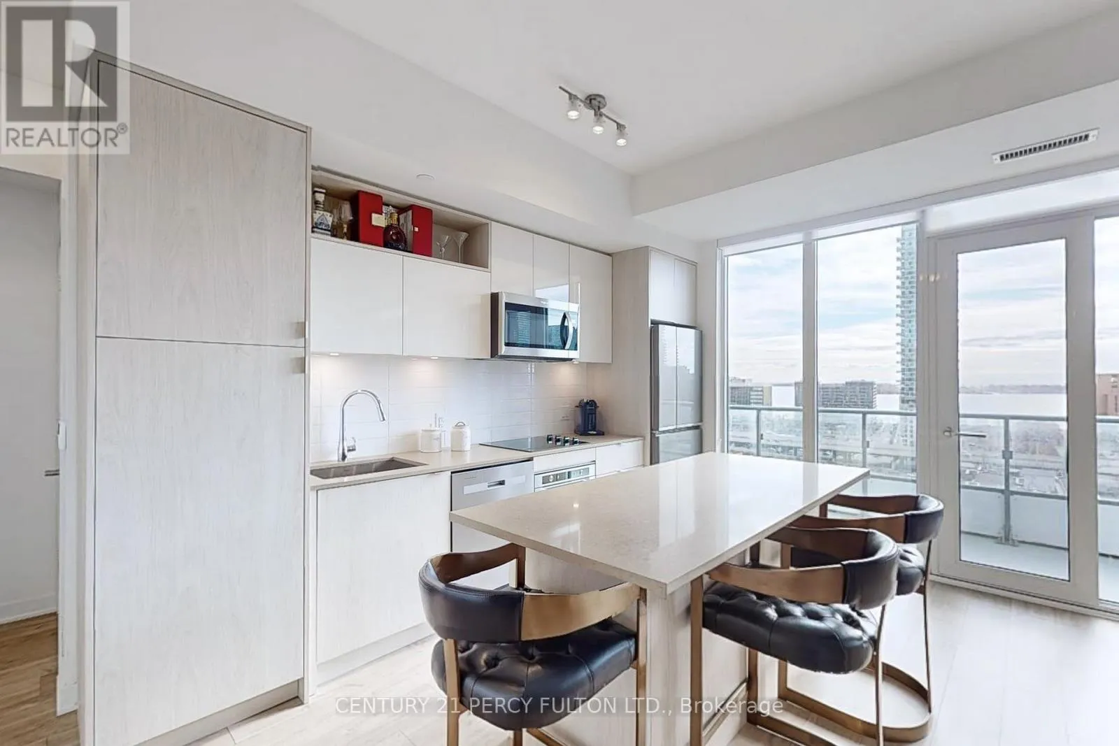 Front/Sherbourne Welcome to Suite 1555 at 121 Lower Sherbourne Street, located in the highly coveted Time & Space Condos by The Pemberton Group in Toronto's vibrant Lakefront community. This incredible and ultra-private 1,100 sq ft corner suite features an expansive 315 sq ft wraparound balcony, offering unobstructed south, west, and east lake views, along with breathtaking city vistas. The open-concept living and dining area is flooded with natural light thanks to floor-to-ceiling windows and 9.5 ft smooth ceilings, creating a bright and elegant atmosphere throughout. Offering 3 bedrooms plus a separate den/office-easily used as a 4th bedroom with its full closet-this suite provides exceptional flexibility. Enjoy 3 full bathrooms, including a private balcony off the primary bedroom. With no unit above, the outdoor space delivers unmatched peace and privacy. The upgraded kitchen boasts a huge custom quartz island with seating for four, perfect for cooking, entertaining, or gathering with family and friends. Every room showcases stunning, unobstructed views. A truly rare offering: this suite includes two side-by-side parking spaces located directly beside the building entrance, adding ultimate convenience. Simply put, there is no other suite offering this level of luxury, privacy, and panoramic views. (id:27476)