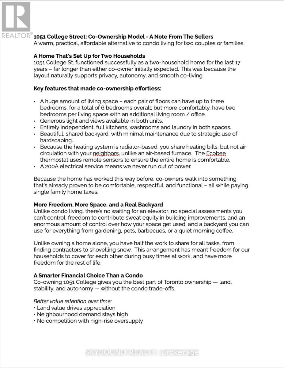 Cross Streets: College & Gladstone. ** Directions: On College, east of Dufferin. Welcome to 1051 College. This peaceful and impeccably maintained 2.5-storey home blends timeless charm with contemporary elegance in the heart of Little Portugal. Thoughtfully updated and highly versatile, it's perfect for multi-generational living, remote work, co-ownership, potential rental income with some modifications, or enjoying as one spacious family home. The main floor features three generous rooms and a walkout to a private backyard. Each room offers exceptional flexibility, whether used as a home office, a king-sized bedroom, or extra living space tailored to your needs. Up the staircase, the second floor offers a modern full bath with heated floors, an inviting living room with a bay window, and a fully renovated chef's kitchen designed for connection and creativity. Beside the kitchen, a large laundry room (one of two in the home) adds convenience, while the bright dining area with a wide pass-through creates an easy flow that keeps gatherings effortless and social. The third floor provides peaceful privacy with extra closet spaces and two king sized sanctuary-style bedrooms, perfect for rest and relaxation. The lower level adds even more living space with its own entrance, full kitchen, and open-concept areas for dining, living, and working. Use as an in-law or nanny suite, or as potential rental space. A second laundry area, cold storage, and a spa-inspired bathroom with heated floors, a live-edge vanity, and a vivid Murano style glass sink complete the floor. With updated fibreglass sound-insulated windows, high ceilings on every floor, 200-amp service, and cohesive design details, this property is truly move-in ready. A Walk Score of 98 and transit at your door mean effortless access to schools, parks, cafés, restaurants, and boutique shopping; everything you need to enjoy the best of city living. With nothing left to do but choose your bedrooms, 1051 College Street invites you to settle in and start your next chapter in comfort and style. (id:27476)