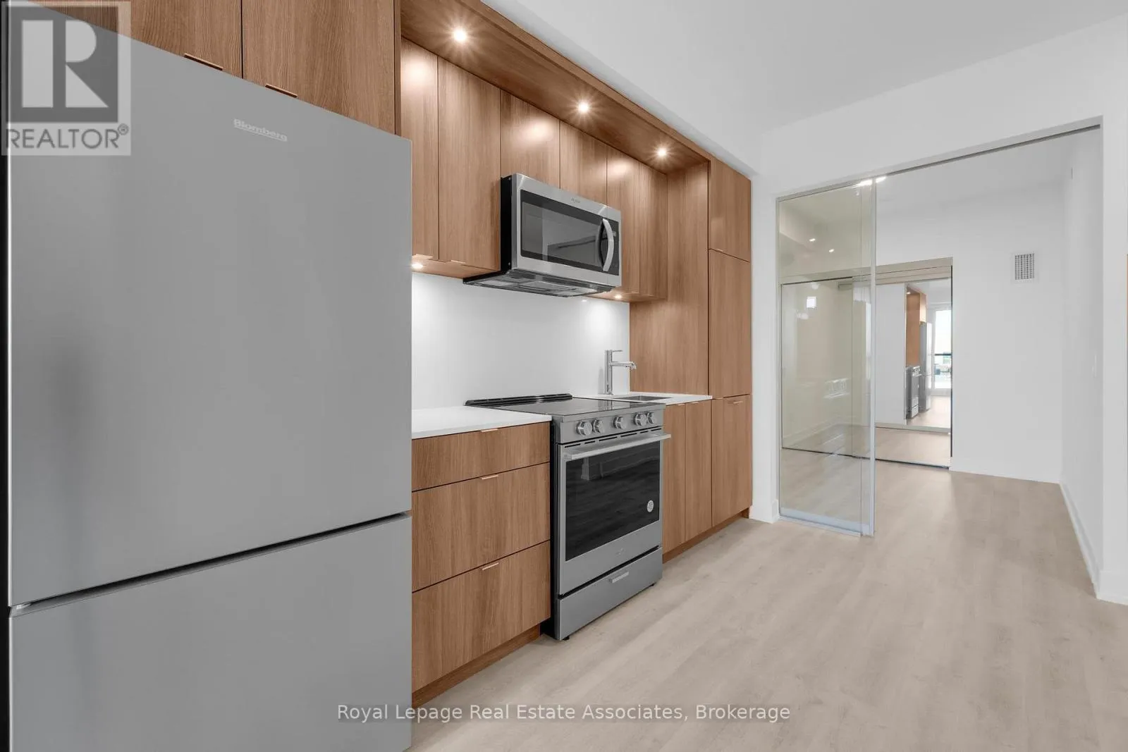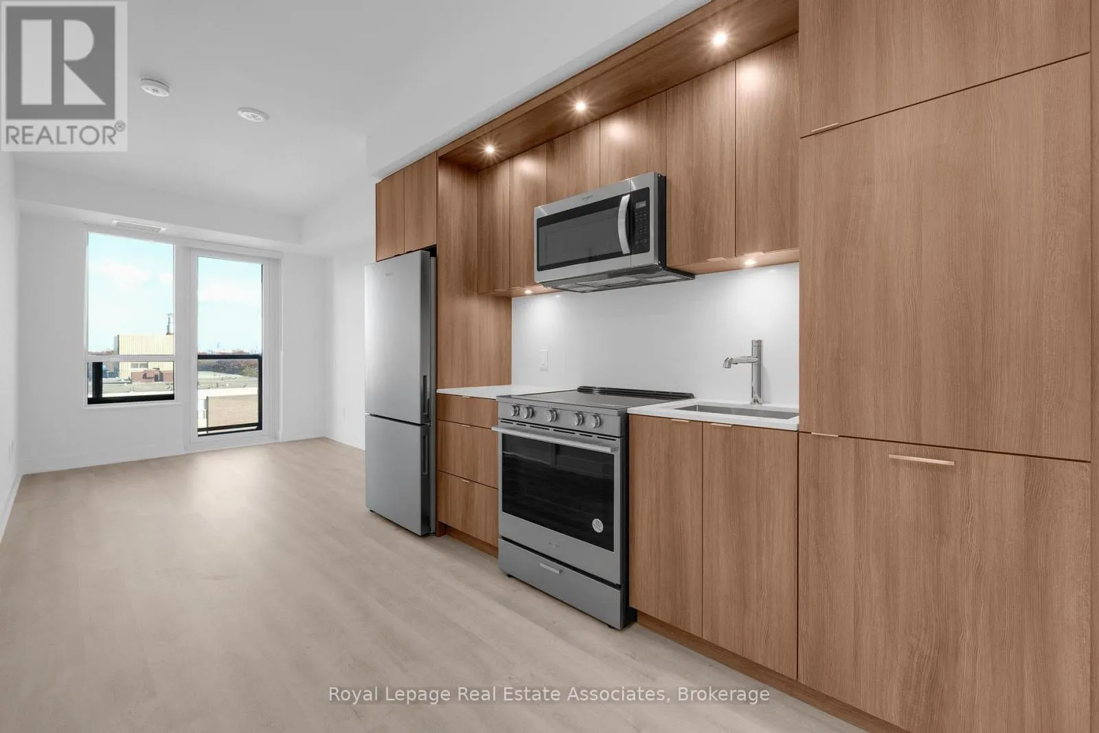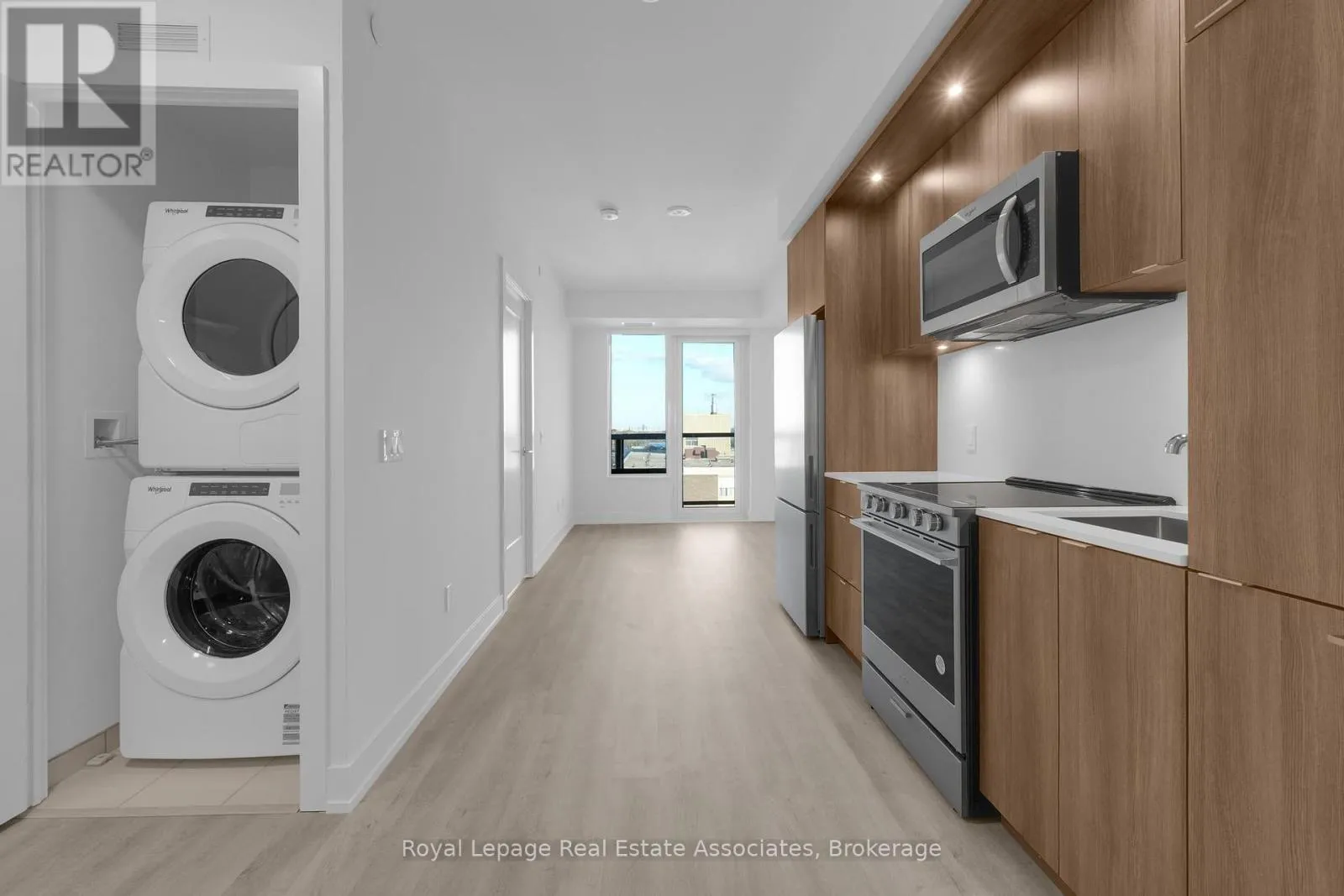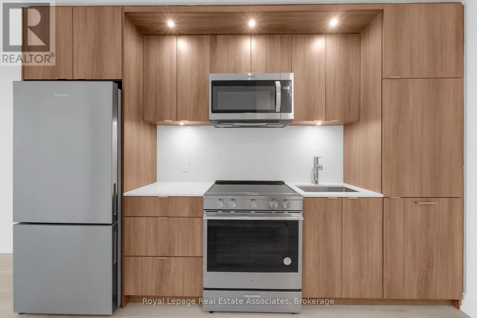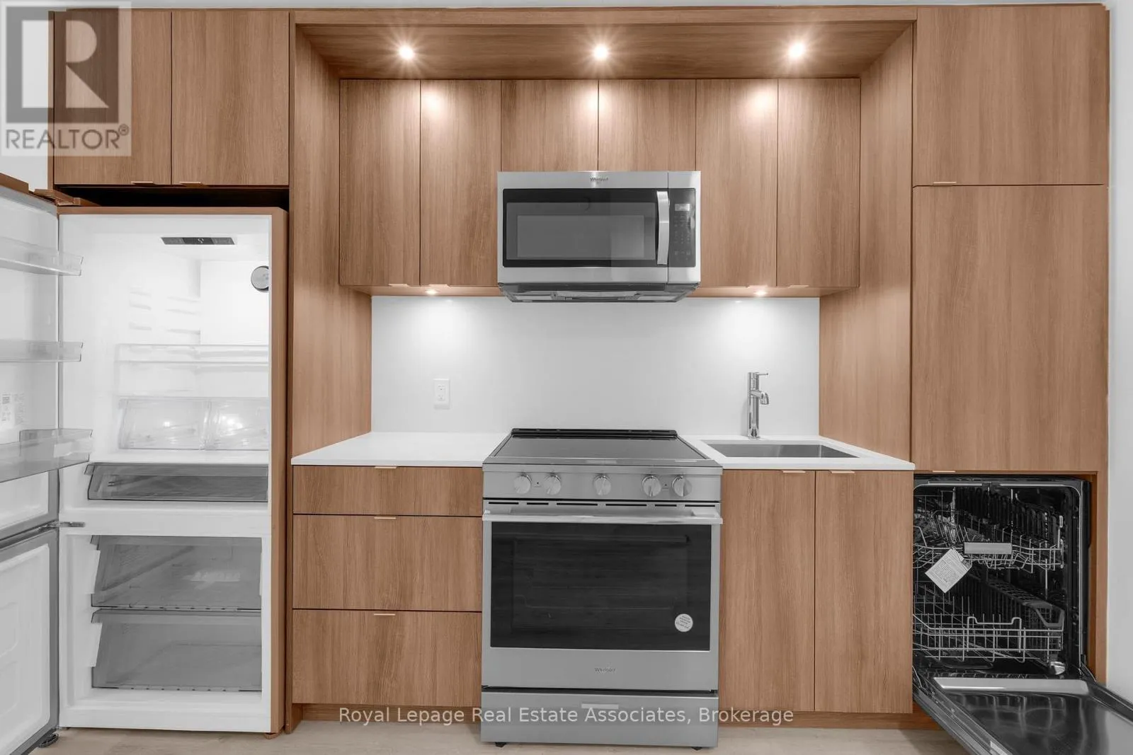 Bloor & Islington Welcome to this bright and modern 2-bedroom, 2-bathroom suite offering 681 sq. ft. of functional living space with contemporary finishes throughout. Thoughtfully designed, this layout features a split-bedroom floor plan for optimal privacy, ideal for roommates, professionals, or small families. The open-concept kitchen is beautifully appointed with full-size stainless steel appliances, sleek cabinetry, and LED valance lighting. The spacious living and dining area features wide-plank flooring and large windows that fill the home with natural light, creating a warm and inviting atmosphere. Both bedrooms offer excellent closet space and large windows, with the primary bedroom featuring its own 3-piece ensuite. The second bedroom is generously sized with easy access to the full main bathroom. Enjoy the convenience of in-suite laundry, 1 dedicated parking space, and a private balcony with views overlooking the surrounding community. Located within steps of parks, schools, shopping, transit, and everyday conveniences, this suite offers the perfect blend of comfort, style, and practicality. (id:27476)