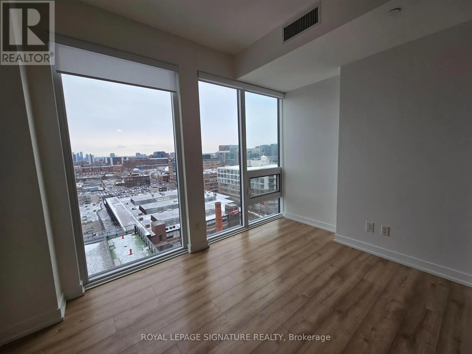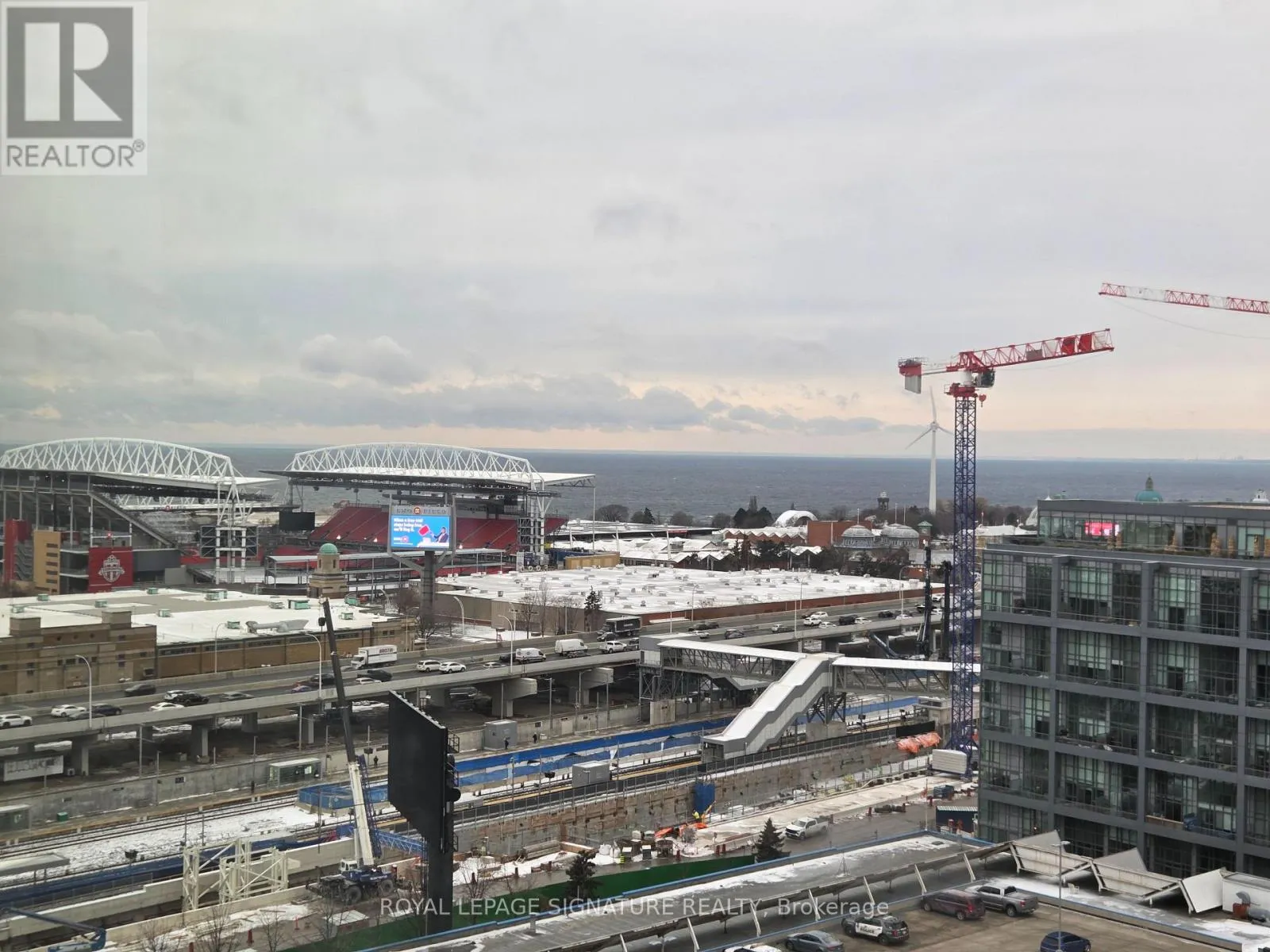 Strachan / East Liberty Upscale urban living in this stunning, sun-filled 3-bedroom, 2-bath corner condo in the heart of downtown Toronto, just steps from Lake Ontario. Floor-to-ceiling windows showcase panoramic lake and city skyline views, flooding the space with natural light. The open-concept living and dining area is perfect for entertaining, complemented by a sleek modern kitchen with stainless steel appliances and stone countertops. The spacious primary bedroom features a walk-in closet and a private ensuite. Two additional bedrooms offer flexibility for family, guests, or a home office. Enjoy ensuite laundry, a private balcony, and the best of city living right at your doorstep. *Freshly Painted* (id:27476)