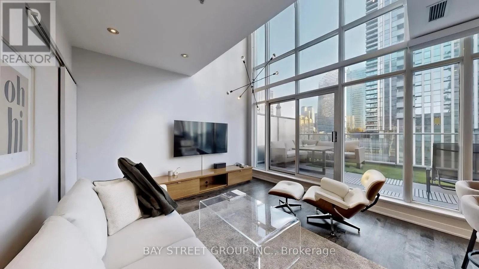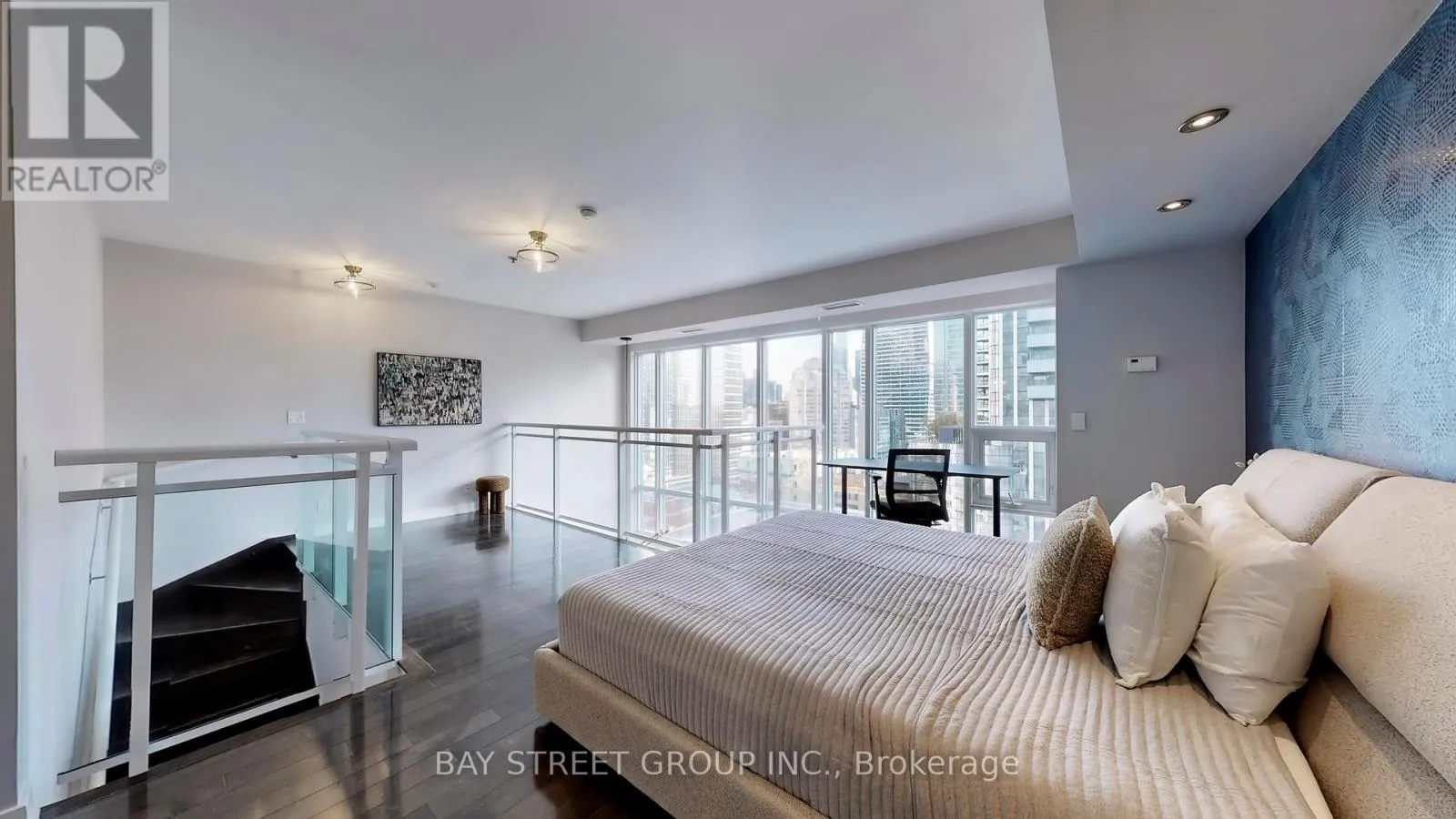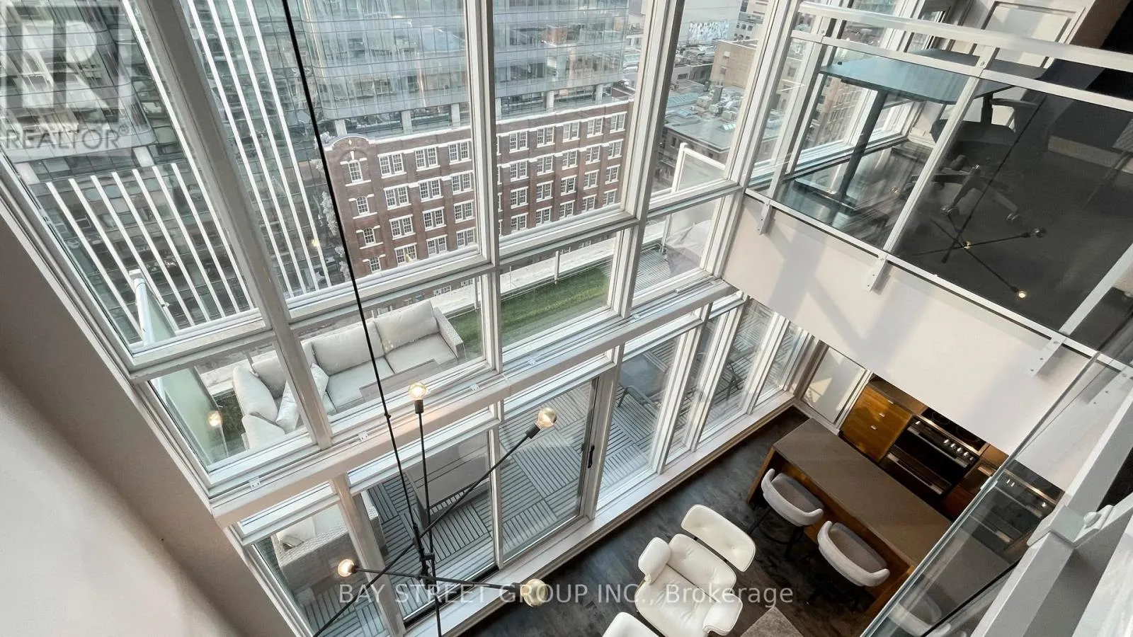 Cross Streets: Richmond/University. ** Directions: Follow google maps. Stunning south-facing 2-storey upper penthouse with dramatic floor-to-ceiling windows flooding the space with natural light. Features an oversized 240 sq ft terrace with BBQ-perfect for entertaining. The main level offers an open-concept layout with hardwood floors and a combined kitchen/living area. The second-floor primary suite includes a dedicated office area, a walk-in closet, and a spa-inspired ensuite. Comes with Tandem 2-car parking and Automatic Blinds, All just steps to the subway and Toronto's Financial & Entertainment Districts. (id:27476)
