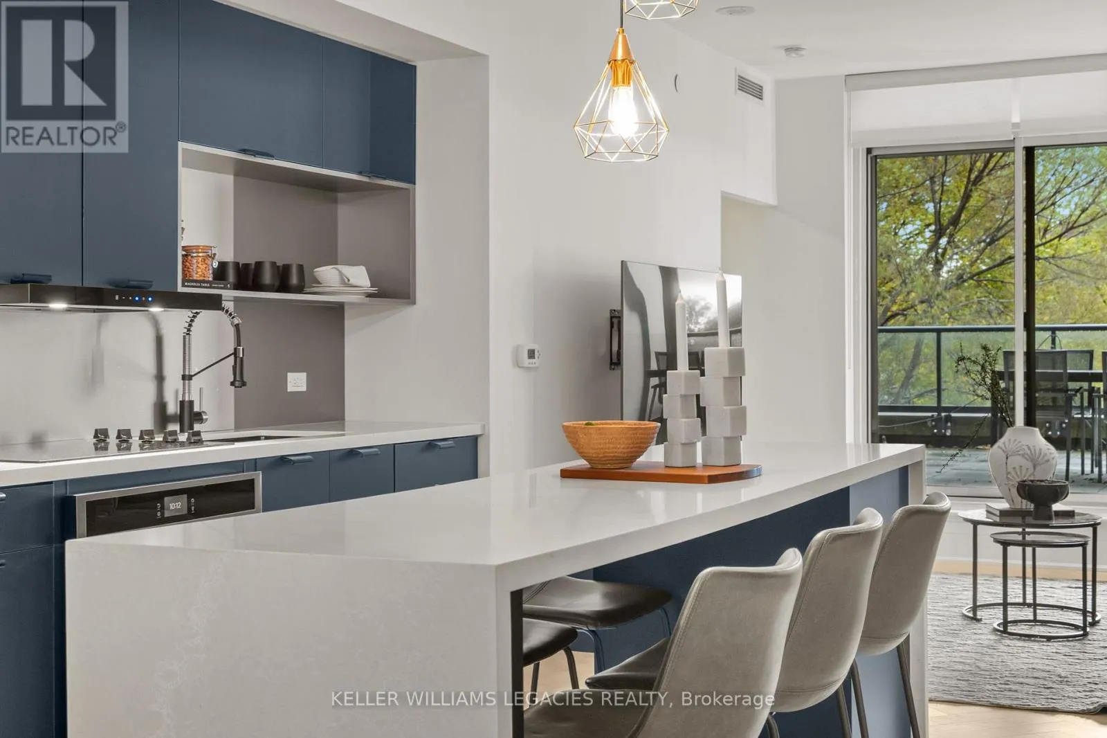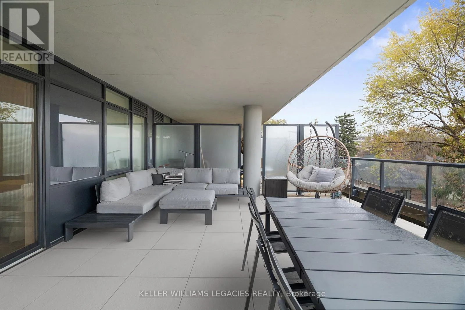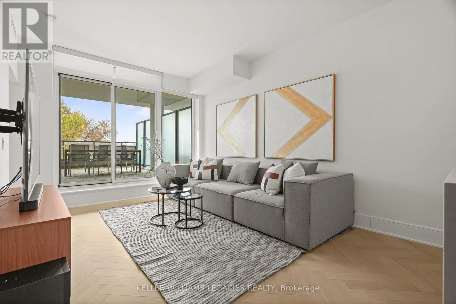 Cross Streets: Bathurst & Eglinton. ** Directions: As per Google Maps. Experience upscale living in the heart of Forest Hill's prestigious Upper Village. This beautifully, upgraded 2-bedroom, 2-bathroom condo offers a refined blend of luxury and modern convenience-just steps from boutique shopping on Eglinton and minutes from the Eglinton subway station.The suite showcases exquisite hardwood chevron flooring throughout, a custom-designed kitchen with premium built-in appliances, and an impressive extra-long waterfall island that seats six and doubles as a dining table. Two generously sized bedrooms feature custom built-in closets for exceptional storage, while both bathrooms have been upgraded with new vanities and modern toilets. New baseboards and elevated finishes enhance the home's sophisticated aesthetic.An open-concept living room creates a bright and inviting atmosphere, flowing seamlessly onto the stunning 370 sq. ft. private terrace-perfect for indoor-outdoor living, entertaining, or simply enjoying the breathtaking views. Residents also enjoy access to a beautifully landscaped upper-floor terrace and BBQ area overlooking serene surroundings.Building amenities include a gym, outdoor patio, guest suite, security concierge, and convenient parking. Maintenance fees include internet, home phone, TV, and water, offering outstanding value. With the upcoming Eglinton Crosstown LRT soon at your doorstep, convenience, connectivity, and luxury living come together in this rare opportunity in one of Toronto's most sought-after neighbourhoods. (id:27476)
