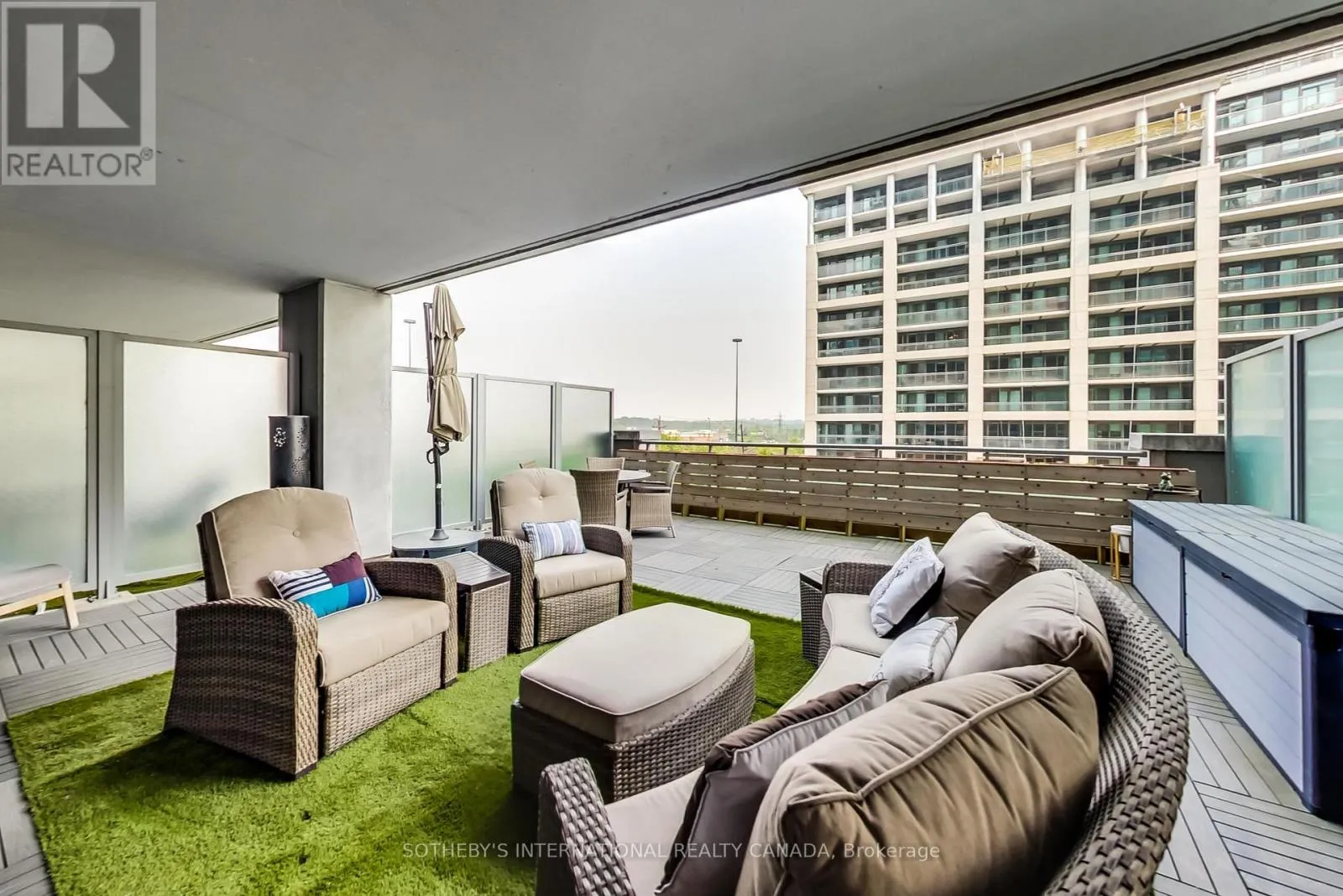 Cross Streets: Lakeshore Blvd W./ Park Lawn. ** Directions: Lakeshore/ Brookers Lane. This is a wonderful opportunity to live in this fabulous and stylish 1 + den unit featuring a large 507 sq ft terrace with incredible lake views. The spacious open concept layout allows for easy entertaining, or enjoy your morning coffee or evening cocktails on the large terrace that is almost as large as the unit itself - only select units in the whole building have a terrace this size. The corner kitchen allows for extra countertop space and the custom kitchen island comes with the unit. Working from home? The den can be used as a desk/ office area or dining area. Worried about where to put all of your clothes? The bedroom has a large walk-in closet and there is plenty of other storage in the long foyer closet with built-in custom organisers inside. Had a long day at work? Relax in the jacuzzi bath. This unit has it all. Parking and locker included. Low maintenance fees. Move in and be on the terrace all Summer long.Humber Bay is one of the most in demand neighbourhoods in the city. Close enough to downtown Toronto, and with all of the benefits of living by the lake and green space. Amazing restaurants and bars and brunch spots are on your doorstep with the Westlake Village a few mins walk away - Metro supermarket, LCBO, banks, gyms and more, or stroll to the famous San Remo bakery on a Saturday morning for those amazing doughnuts. Lake Ontario waterfront is steps from the front of the building with running & cycling paths to downtown Toronto, Mississauga & beyond. The streetcar runs just outside the building. Be on the Gardiner in less than 5 mins. (id:27476)