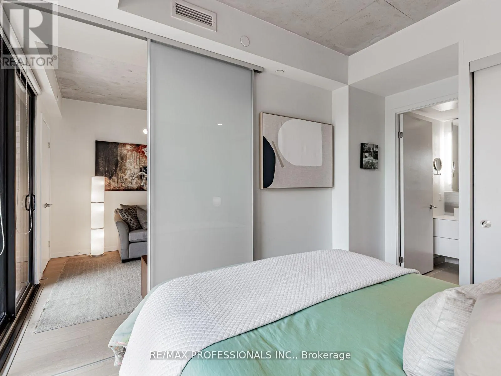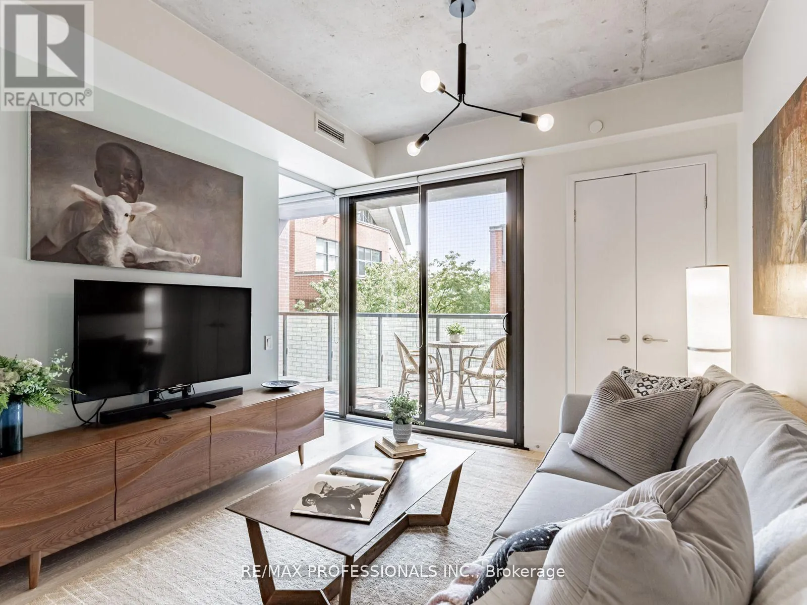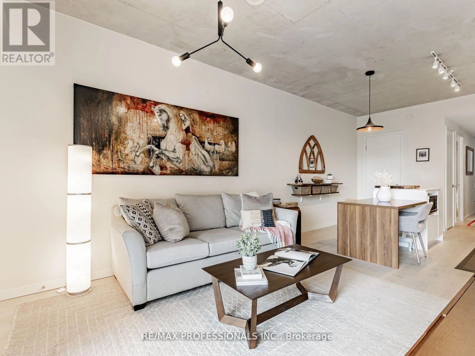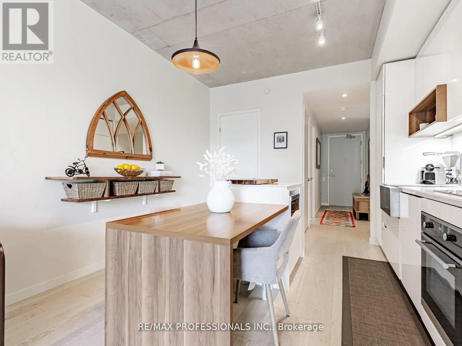 Dundas/Sorauren Live in one of Toronto's most sought-after neighbourhoods, in a boutique building designed by renowned neo-modern architect Peter Clewes. This intimate and stylish residence offers the perfect balance of design and function. This thoughtfully planned 1+den suite with two full baths features a versatile den that can easily serve as a second bedroom or home office. Soaring nine-foot exposed concrete ceilings, floor-to-ceiling black-framed windows that flood the unit in sunlight, and bleached oak floors fill the space with natural light and give it a modern edge. The sleek kitchen is equipped with built-in appliances, quartz counters, a stainless steel backsplash, oversized sink, and crisp white cabinetry. A custom island with quartz counters extends into a walnut dining table, creating a seamless space for both cooking and entertaining. The primary bedroom offers pot lighting, floor-to-ceiling windows, double closets, and a spa-like three-piece ensuite with a frameless glass walk-in shower. A private covered balcony, integrated front closet, ensuite storage, and in-suite laundry complete the home, along with one underground parking space. Residents enjoy exceptional building amenities including a gym, party room, concierge, BBQ area, bike storage, and visitor parking. Situated in the heart of Roncesvalles, one of Toronto's most vibrant communities, this home is surrounded by cafes, restaurants, markets, shops, and parks including an off-leash dog park! With quick TTC access by streetcar or subway, downtown is only minutes away. Stylish, functional, and ideally located, this condo offers the best of both home and neighbourhood. (id:27476)
