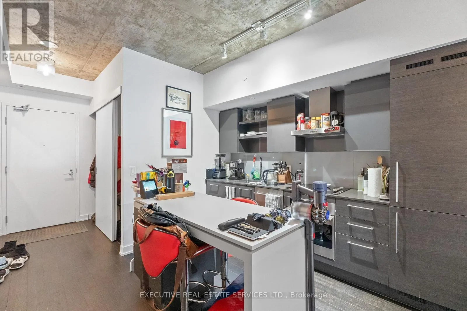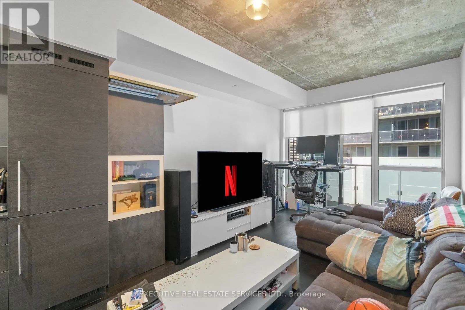 King St W & Strachan Ave Welcome to Unit 721 at 1030 King Street West - DNA3 Condos! This stylish 1 Bedroom + Den suite offers the perfect mix of modern finishes, thoughtful design, and unbeatable location. Boasting over 600 sq ft of interior living space plus a large 100 sq ft balcony, this bright and functional layout is ideal for professionals, first-time buyers, or investors alike. The open-concept living area features floor-to-ceiling windows, exposed concrete ceilings, and wide-plank flooring for that authentic downtown feel. The modern kitchen includes upgraded built-in appliances, stone countertops, and ample storage. A spacious den provides the flexibility for a home office or guest space, while the primary bedroom offers excellent light and privacy. Enjoy warm summer days or evening sunsets from your private balcony, or take advantage of DNA3s outstanding amenities including a fully equipped fitness centre, party room, rooftop terrace with BBQs, and 24-hour concierge. Situated steps from restaurants, cafes, grocery stores, transit, and parks, and just minutes to Liberty Village, Queen West, and Trinity Bellwoods. Includes a locker. Move-in ready, beautifully maintained, and located in one of Torontos most desirable buildings.Extras: (id:27476)
