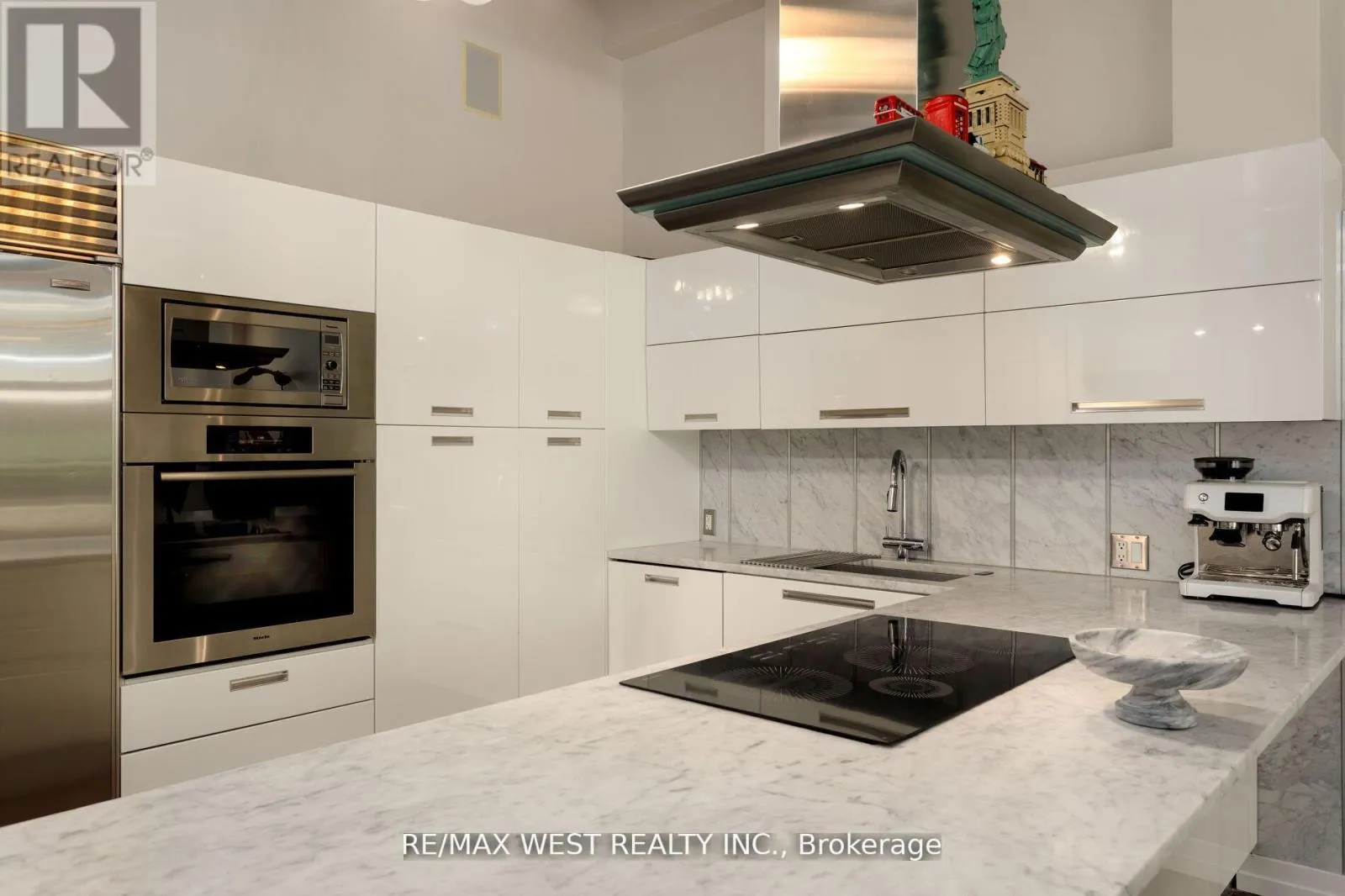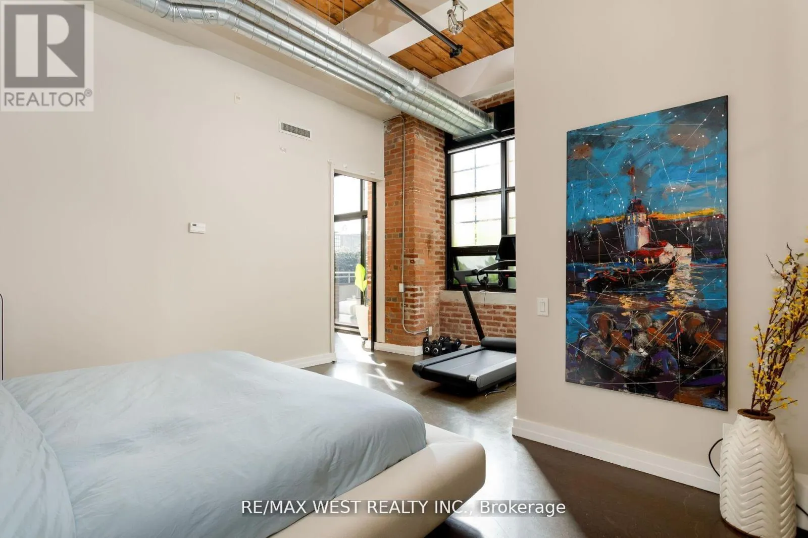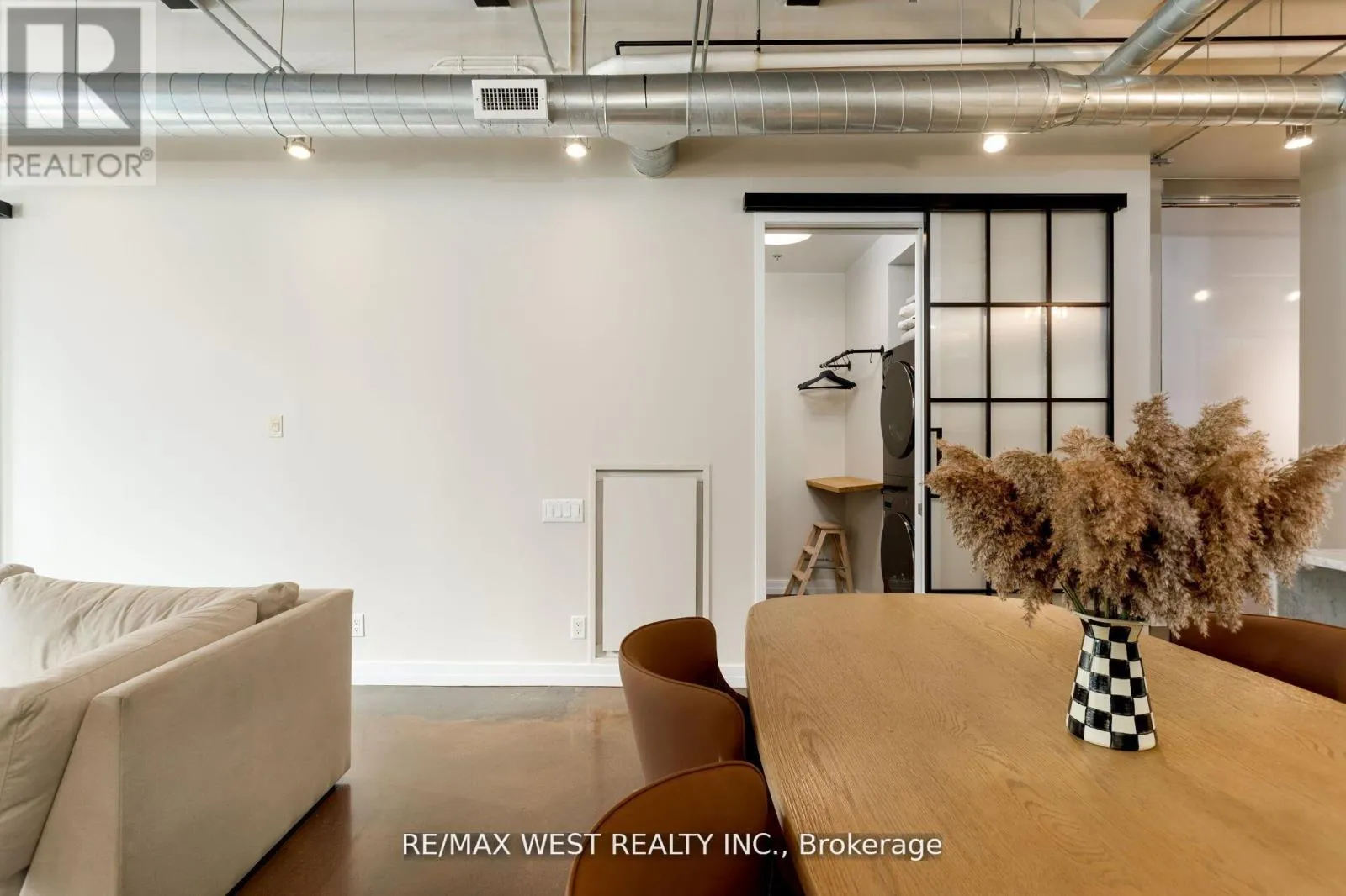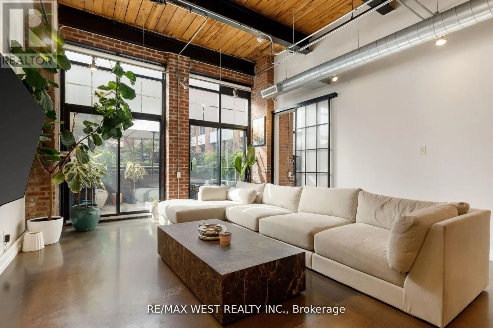 Cross Streets: Hanna Ave/East Liberty St. ** Directions: King and Dufferin. Experience unparalleled sophistication in this custom-crafted hard loft, a rare gem nestled within the historic Irwin Toy Factory in the heart of Liberty Village - one of Toronto's most vibrant and sought-after neighborhood's. Offering approximately 1,475 square feet of interior elegance and a 191-square-foot private terrace, this residence perfectly balances expansive open-concept living with intimate outdoor retreat. Step inside and be captivated by the loft's 13-foot Douglas Fir beamed ceilings, exposed brick walls, and beautifully restored concrete floors - a seamless fusion of industrial heritage and modern refinement. Every detail has been thoughtfully curated to blend timeless character with contemporary luxury. The chef-inspired kitchen is a culinary showpiece, featuring top-of-the-line Sub-Zero and Miele appliances, a Frigidaire gallery induction cooktop, Scavolini white gloss cabinetry, and exquisite marble countertops with a waterfall island and built-in wine fridge. A separate storage/pantry room and dedicated laundry room with custom built-ins ensure both practicality and sophistication. The upgraded bathroom exudes European elegance with Italian ceramic finishes, while Komandor custom closets, including a walk-in closet, provide elevated organization throughout. Upgraded mirrored sliding storage doors further enhance the home's architectural flow and style. Enjoy the comfort of automated window blinds, offering ambiance and privacy at your fingertips, and the convenience of an extra-large parking space that accommodates two vehicles with ease. (id:27476)