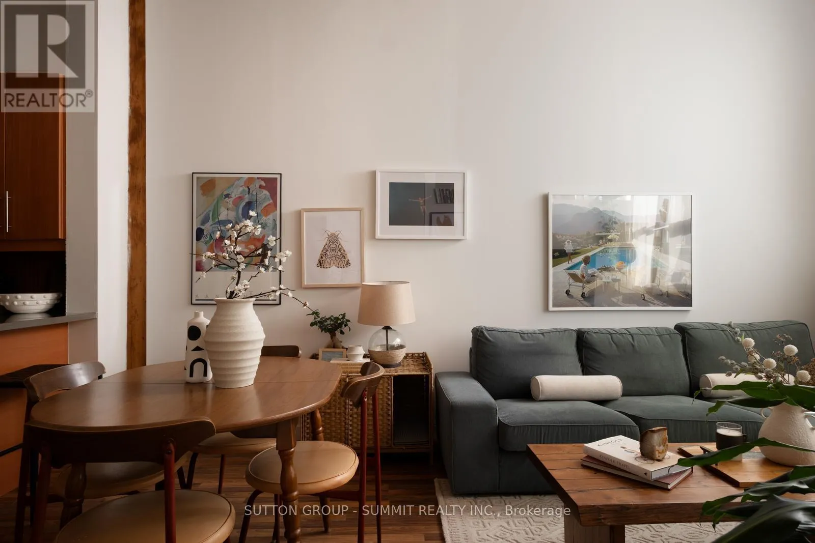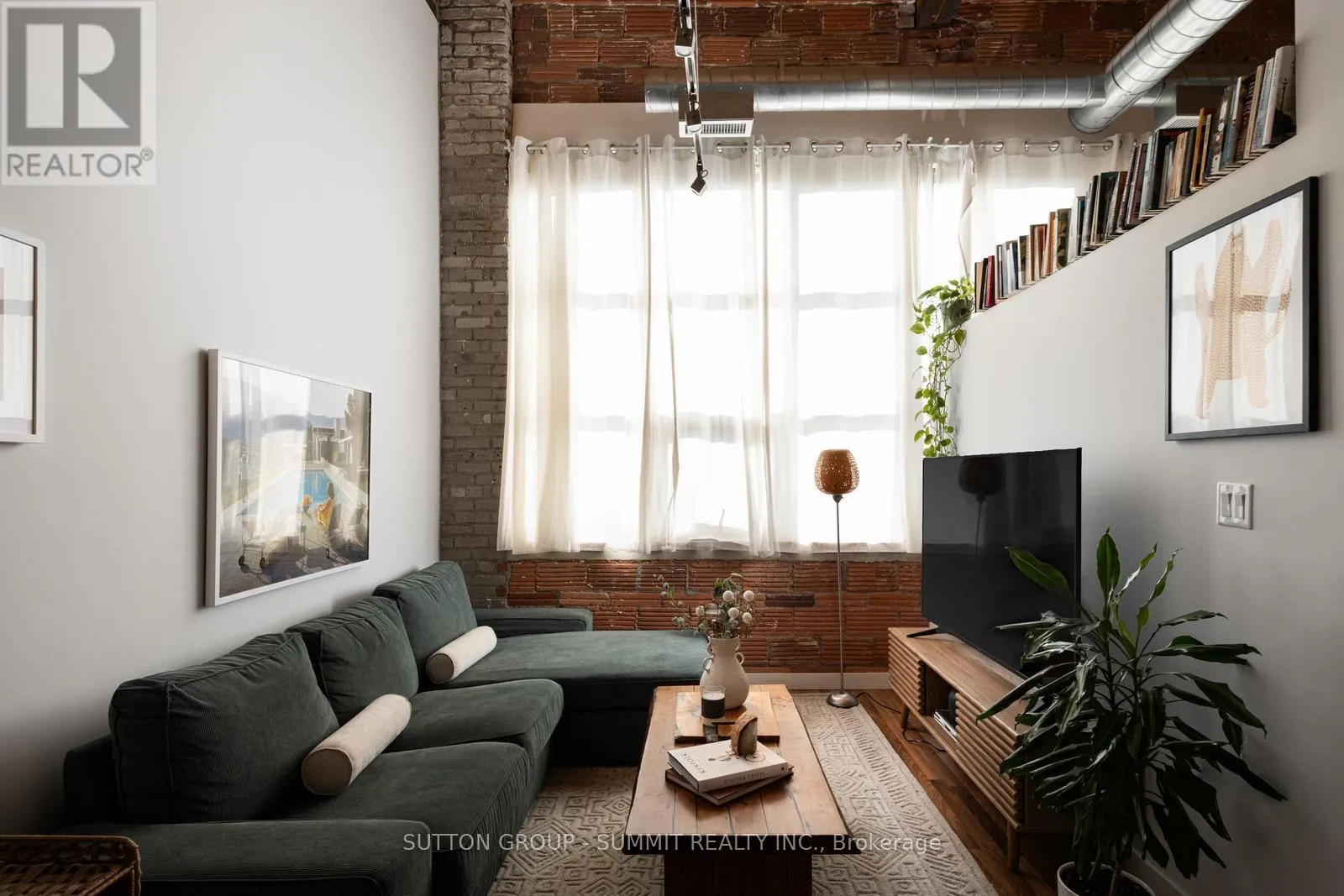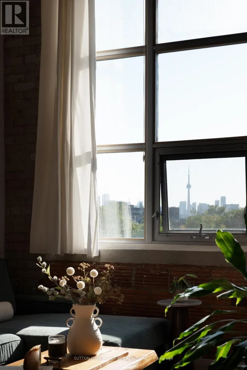 Cross Streets: Dundas St. W. & Bloor St. W. ** Directions: Dundas St. W. & Roncesvalles Ave. A featherweight name, but a heavyweight loft. Once home to the B.F. Harvey Co. bedding factory, the Feather Factory (c. 1911) now stands as a boutique hard loft that blends century-old character with modern style - right in the heart of Roncesvalles. Dramatic 15-foot ceilings, original wood beams, and exposed brick set the backdrop for a home that feels both expansive and intimate. Factory-style windows invite eastern light to pour across the space, framing skyline views that shift with the day. The stainless-steel counters and oversized breakfast bar add a cool, utilitarian edge to a space that's effortlessly stylish. This 1-bedroom, 1-bathroom loft doesn't try to impress, it just does. Authentic, rare, and ready for its next chapter. Step outside and you're surrounded by Roncy's best: morning coffee at Propeller, dinner at The Commoner, a film at the Revue. High Park, Sorauren Farmers Market, the Railpath, and MOCA are all within easy reach. Streetcar, subway, GO, and UP Express are minutes away. For people who don't do boring. This one's for you! (id:27476)