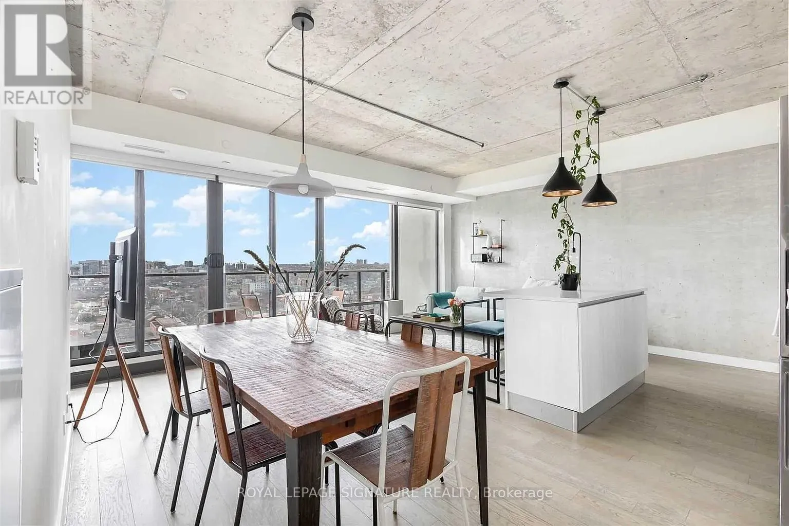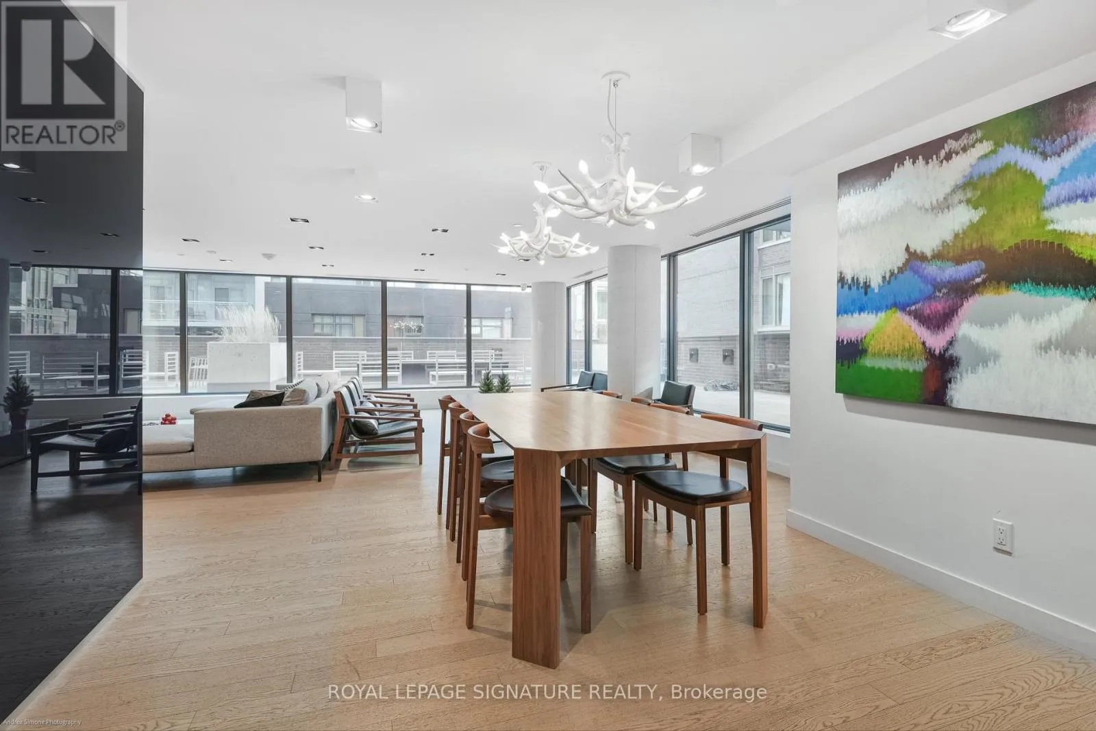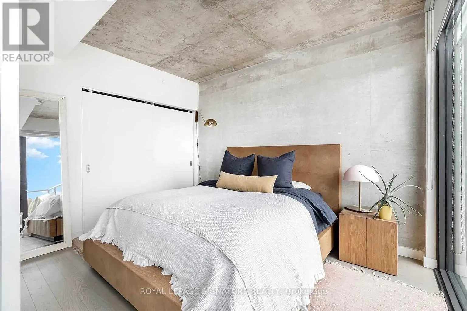 Cross Streets: Adelaide St W/Bathurst St. ** Directions: Lobby entrance off of Bathurst St - entrance to underground parking lot off of Browns Lane. Fully Furnished & All-Inclusive (incl WiFi)! Every inch of this luxurious loft is thoughtfully interior designed with premium hand-picked pieces. Featuring an open concept sunset soaked floor plan stylishly loaded with Scandinavian-inspired soft-loft finishes: soaring 9ft ceilings, exposed concrete ceilings & feature walls, engineered hardwood & floor-to-ceiling windows lining the entire west wing. The lavish living room is set-up with entertainers in mind - a clever conversation pit with a three-seater sofa and armchair, a TV and walk-out to the west-facing terrace. Slide the terrace doors open and experience invigorating indoor-outdoor living! There is a seamless flow from the living to the dining space, which is fashionably framed by a modern light pendant and features a full-sized dining table seating 6. The European-style Chef's kitchen overlooks the living, dining and terrace with quartz counters, glossy tile back splash, full-sized, high-end stainless steel appliances (bonus gas stove!) & a quartz kitchen island with extra prep space seating 3. Retreat to the primary suite with a cloud-like bed atop a custom bed frame + built-in storage! Enjoy a double-door custom closet, floor-to-ceiling windows + a casement window (for extra fresh air) & a frosted glass sliding door. Unwind in the 4-piece spa-inspired bath with a 2-in-1 rainfall glass block shower + waterfall tile deep soaker tub, lush vanity with exquisite backsplash detail + under-sink storage, separate built-in storage tower & contemporary ceramic floors. The guest bedroom dextrously doubles as a home office with an office desk, chair & custom Murphy Bed: open it up for overnight guests or neatly fold it into the wall and the space seamlessly transforms to your very own yoga studio or home gym. Sprawl out on the oversized terrace & catch endless sunsets - cleverly covered so you can enjoy your outdoor oasis year-round. Complete with a gas line for BBQ-enthusiasts, love seat & bistro table with chairs (id:27476)