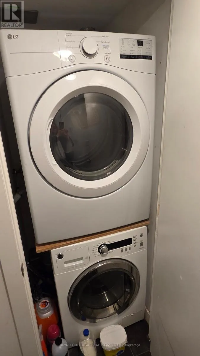 Richmond & Jarvis Beautifully updated 590 sq ft south facing 1 bedroom unit in Moss Park Downtown Toronto. The kitchen has been upgraded with new soft close cabinets, black granite counter top designed to add an eating area/breakfast bar for 2. Quality Stainless steel appliances, Frigidaire range, Whirlpool fridge, Whirlpool over the range microwave, Bosch dishwasher and LG stackable washer and dryer. Living room has stunning custom wood accent wall with built-in soft close cabinets and 65" Flat Screen Samsung TV included in the sale! Primary Bedroom, with walk-in closet, is large enough for a king bed and you still have space for a desk! Exceptionally well laid out suite for a single person or couple. South facing balcony with a city view, no buildings blocking your view! The unit also comes with a parking stall and locker, added value for the unit. If you do not use the parking stall or locker, you can rent them out! Unbeatable location and low maintenance fees which Include All Utilities!! Amenities include 24-hour concierge, exercise room, sauna, party room, guest suites and ample visitor parking. All of this in an unbeatable location, just steps to the Financial District, St. Lawrence Market, Distillery District, a 3-minute Walk to the Subway, Path, St. James and Berczy Parks, and the Waterfront Trails. Please Note: Although the unit is currently occupied by a tenant, most of the furniture is negotiable for sale. (id:27476)