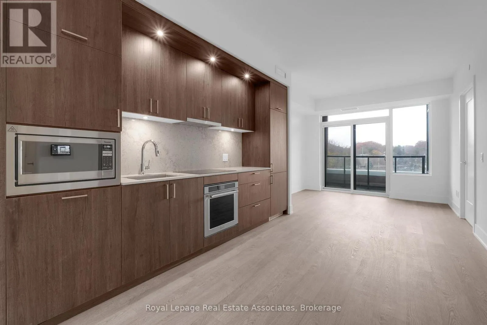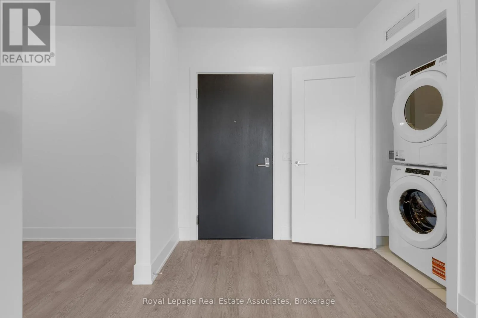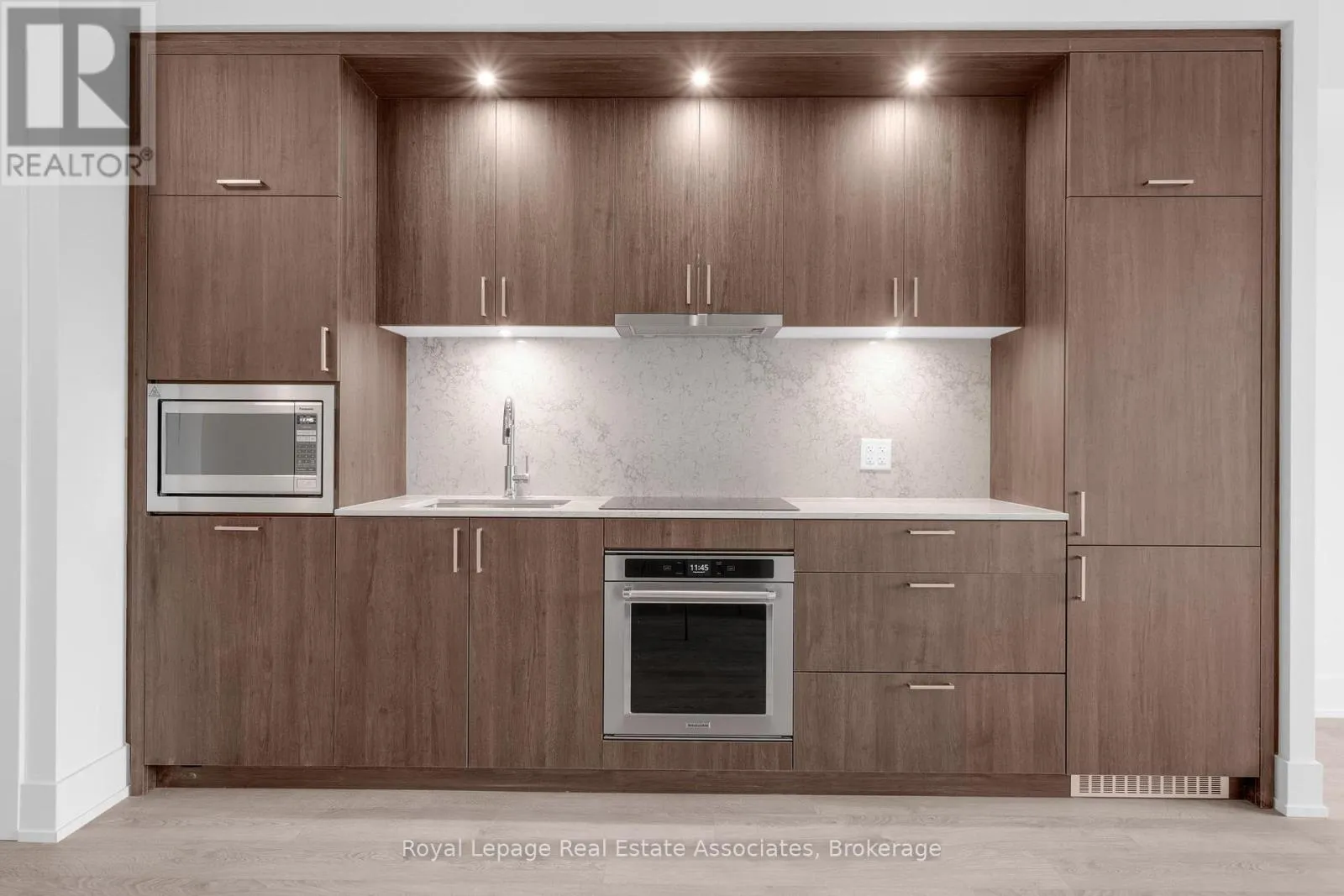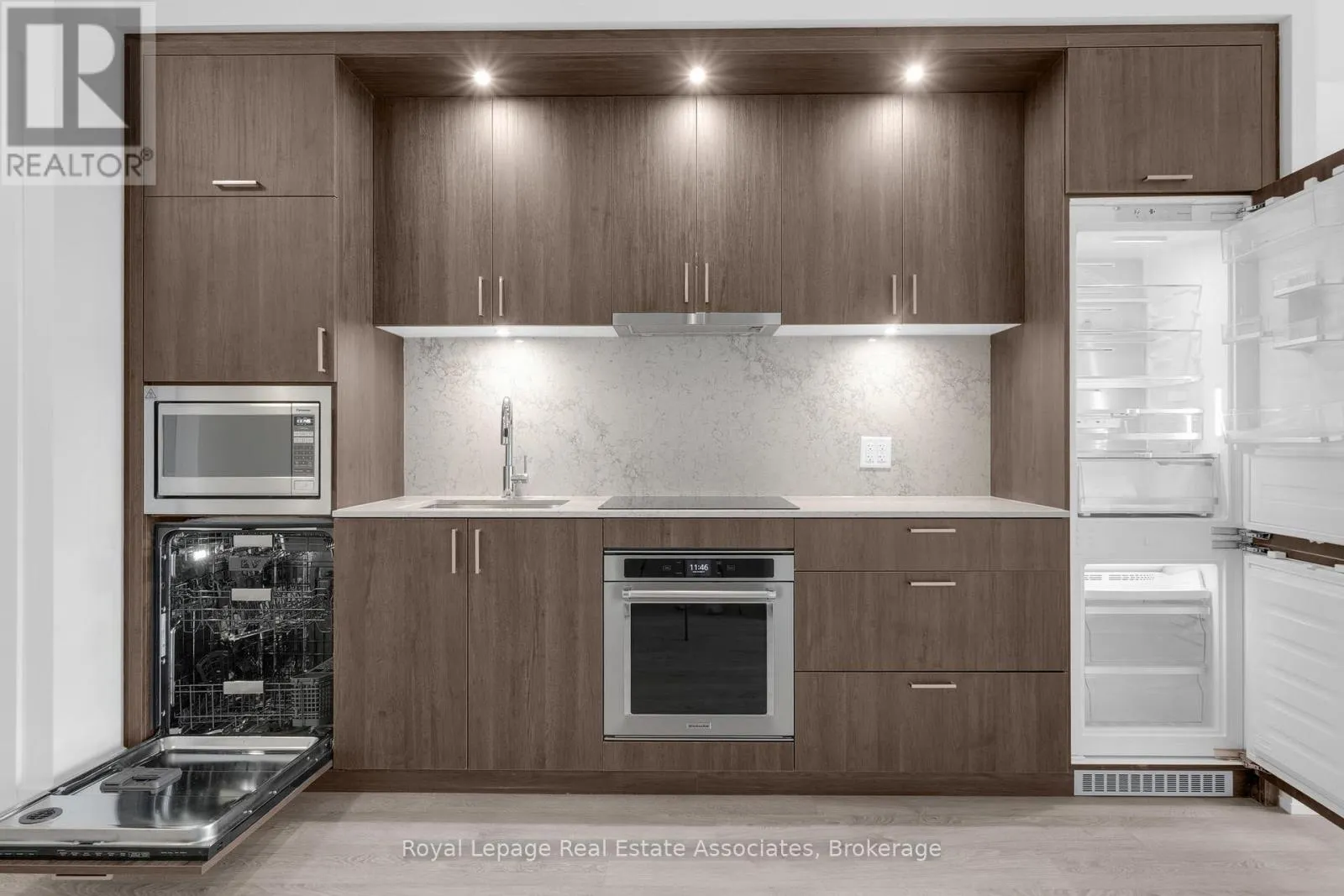 Royal York/Dundas St W Welcome to Edenbridge by Tridel, where sophisticated design meets modern comfort in the heart of The Kingsway. This bright and functional 1 bedroom + den, 1.5 bathroom suite offers 655 sq. ft. of thoughtfully designed living space with elegant finishes throughout. The contemporary kitchen features full-height wood-grain cabinetry, quartz countertops, integrated stainless-steel appliances, a built-in wall oven, sleek cooktop, under-cabinet lighting, and ample storage - combining everyday practicality with a refined aesthetic. The open living and dining area is enhanced by wide-plank flooring, clean modern lines, and expansive windows that fill the home with natural light. A seamless walk-out leads to the private balcony, offering views overlooking the surrounding tree-lined neighbourhood. The spacious bedroom features large windows, a generous closet, and easy access to the private ensuite, finished with polished porcelain tile, a modern vanity, and a deep tub/shower enclosure. The versatile den is ideal for a home office or quiet workspace. A convenient powder room off the main living area adds everyday flexibility, while the full-size stacked Whirlpool washer and dryer provide in-suite convenience. One parking space is included. Residents enjoy access to a premium collection of amenities including a fitness centre, indoor pool, sauna, yoga studio, rooftop terrace, party and dining rooms, and 24-hour concierge service. Ideally located steps from Humbertown Shopping Centre, transit, parks, and top-rated schools - with quick access to downtown Toronto and Pearson Airport - this suite offers upscale living in one of Etobicoke's most desirable communities. (id:27476)
