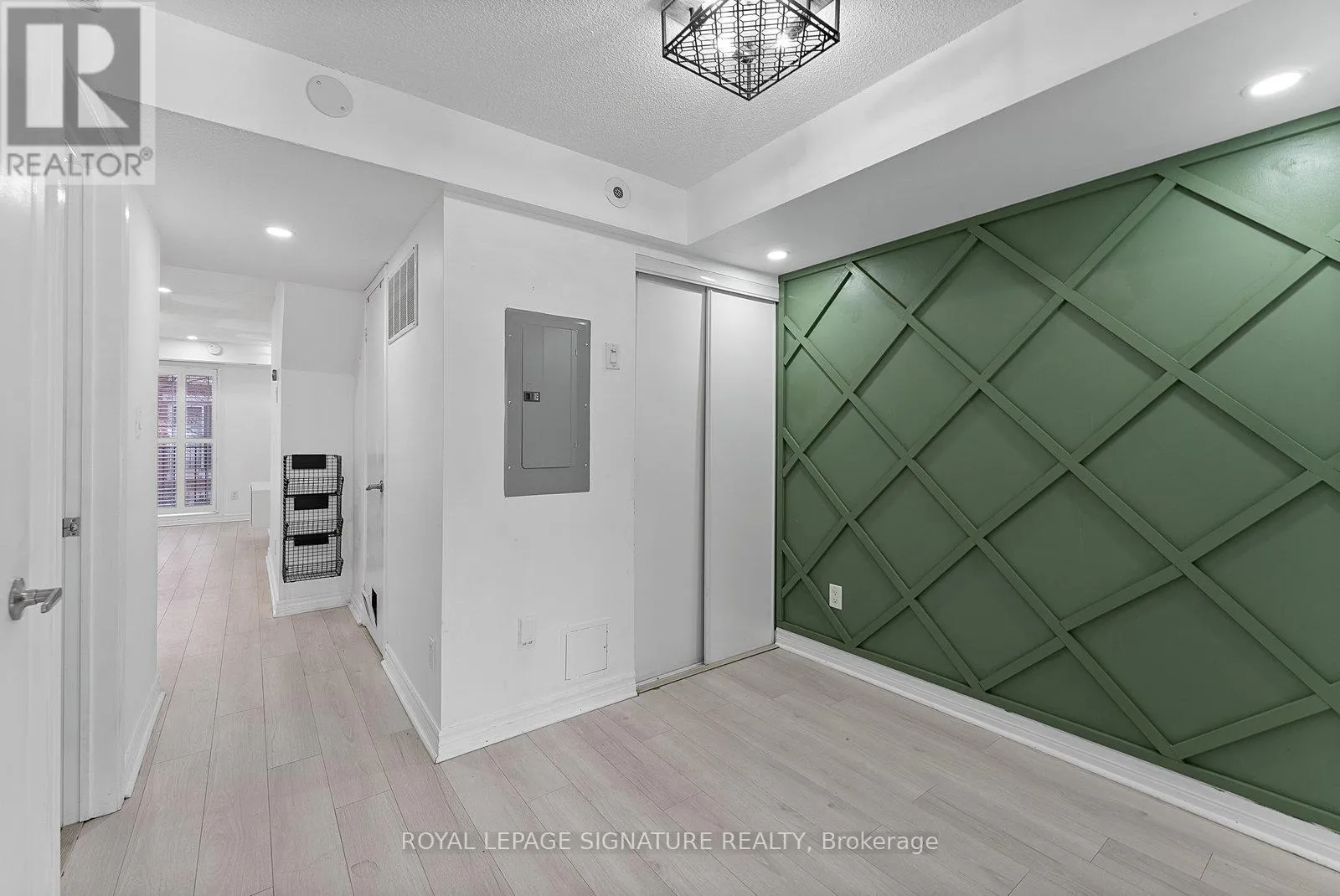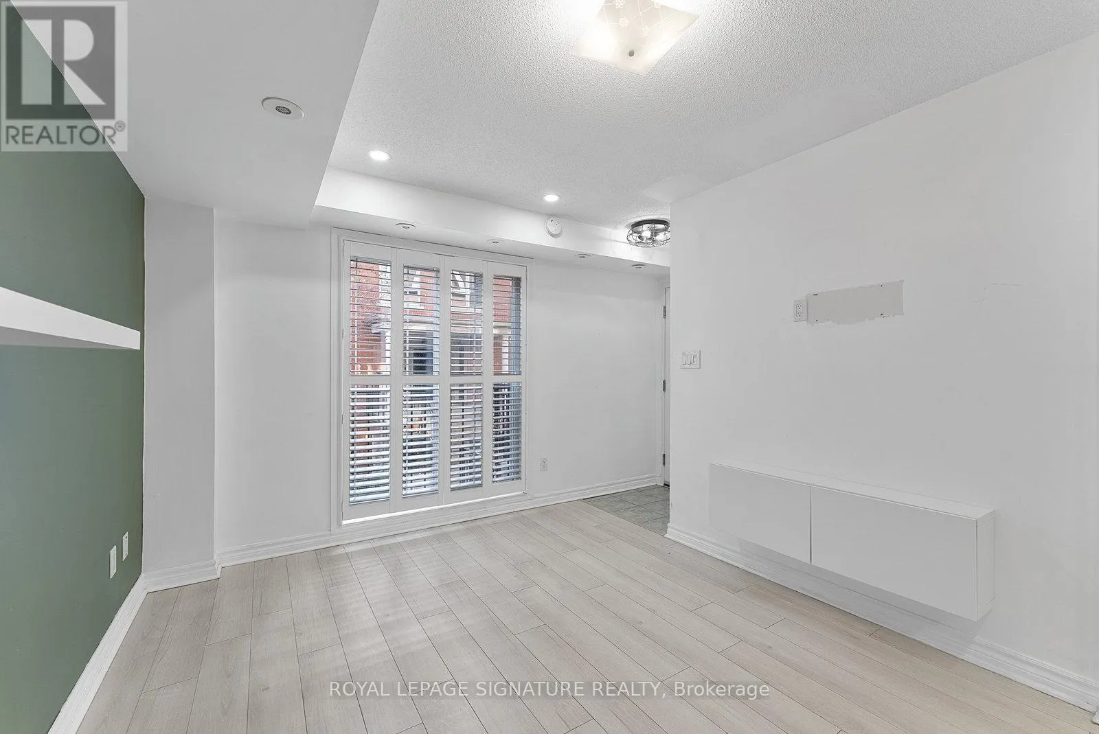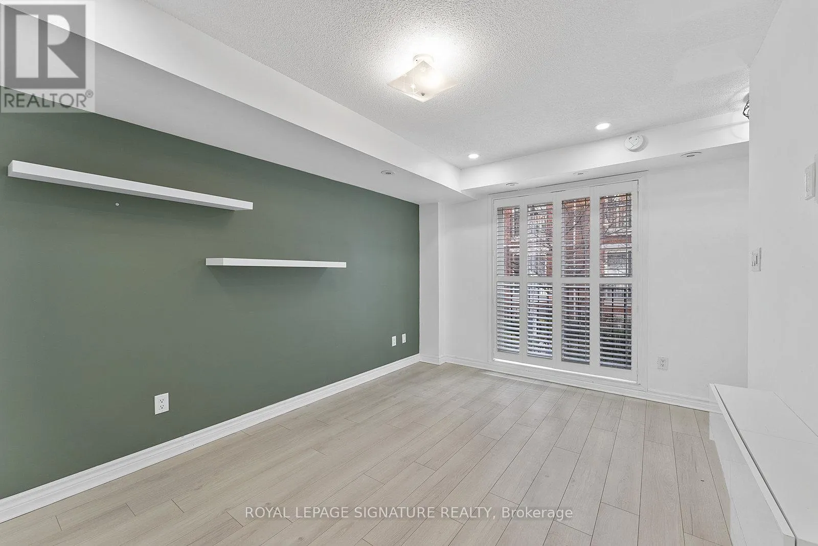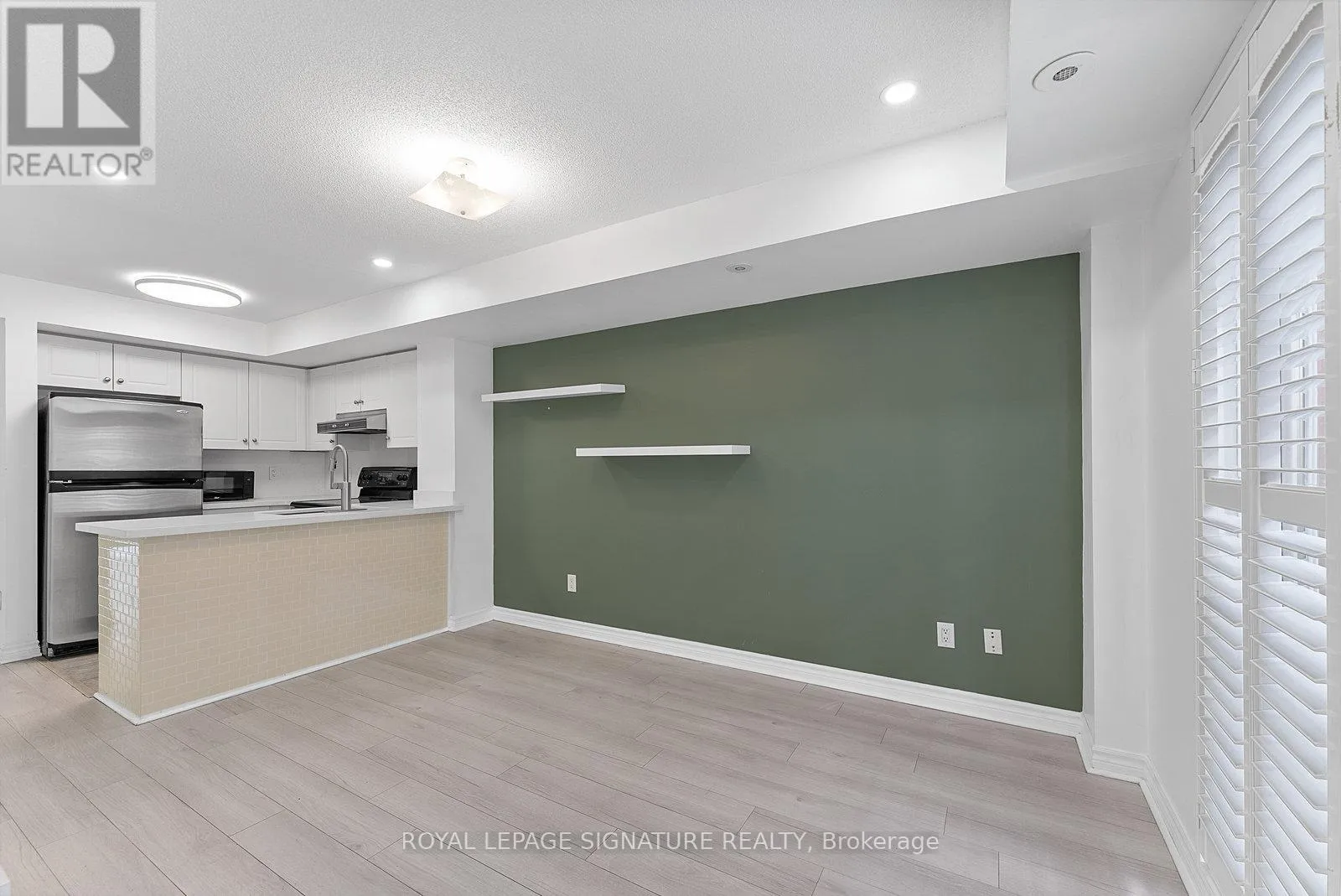 King St W/Dufferin St Tastefully Upgraded Tranquil Two Bed + Den Townhome With A Terrace & Juliette Balcony! An Entertainer's Dream Suite Featuring Smooth White Oak Laminate & Premium Wood Shutters Throughout! An Open Concept L-O-N-G Living/Dining Space With A Sage Green Accent Wall, Juliette Balcony, Floating Shelves & A Built-In Media Unit. The Expansive Gourmet Kitchen Features A Navajo White Subway Tiled Breakfast Bar, Quartz Counters, Stainless Steel Full-Sized Appliances, Marble-Style Backsplash & Loads Of Upgraded Cabinetry. The Primary Suite Will Sweep You Off Your Feet With A Walk-In Closet, *Bonus* Linen Closet, Floor-To-Ceiling Windows, Silver Bullet Grey Accent Wall & Walk-Out To The Private Terrace. The Second Bedroom Makes The Perfect Gym, Yoga Studio, Home Office, Little Kid's Room Or Nursery With A Large Window, Open-Faced Closet & Silver Bullet Grey Accent Wall. The Open Concept Den Features A Zen Green Geometric Wooden Feature Wall & Makes The Ideal Playroom, Home Office or Reading Nook. Relax & Unwind In The 4-Piece Bath With A Sage Green Accent Wall, 2-In-1 Subway Tiled Shower/Tub, Mirrored Medicine Cabinet, Under-Sink Storage & Bonus Shelving. Super Convenient Ensuite Stackable Laundry! Slide The Juliette Balcony Open For Fresh Air Or Retreat To The Decked Private Terrace Off The Primary Suite - Enjoy A Warm Cup Of Coffee In The Morning Or Glass Of Bubbly In The Evening! (id:27476)