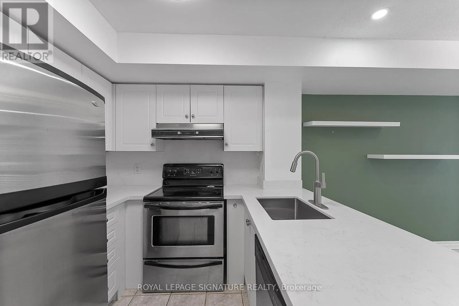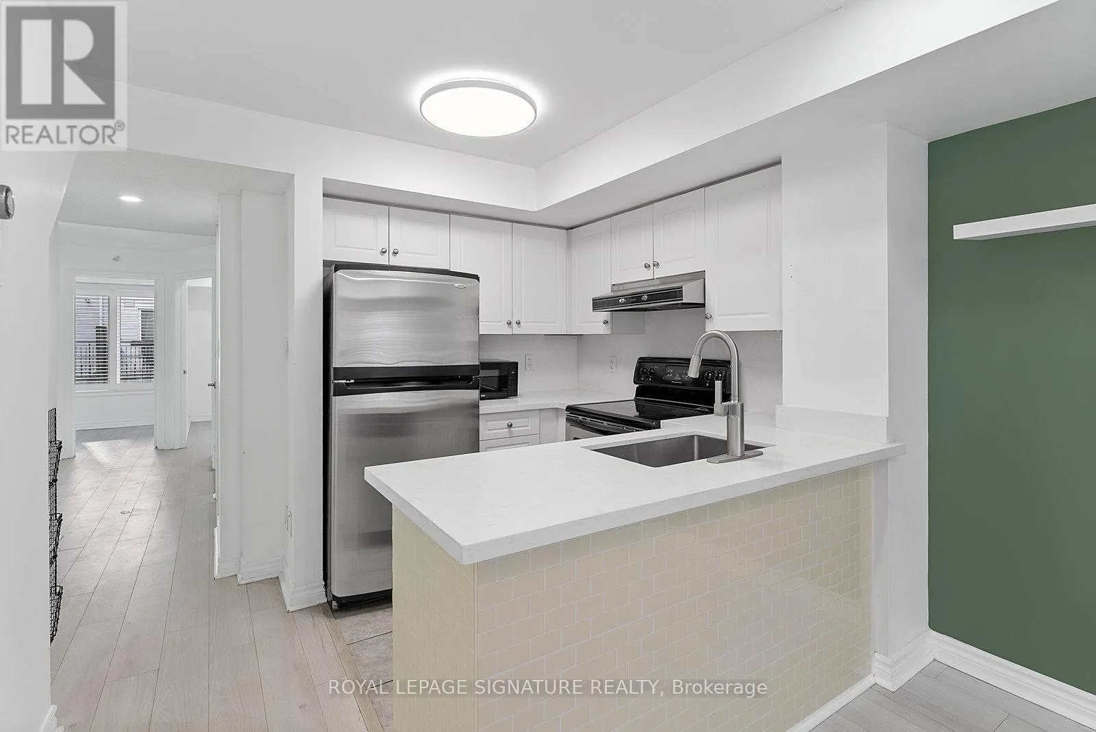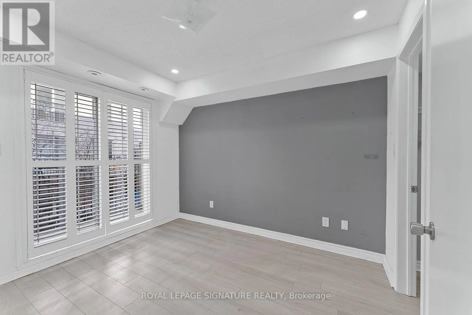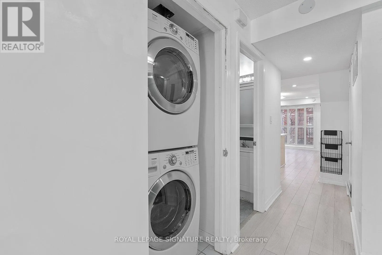 King St W/Dufferin St Tastefully Upgraded Tranquil Two Bed + Den Townhome With A Terrace & Juliette Balcony! An Entertainer's Dream Suite Featuring Smooth White Oak Laminate & Premium Wood Shutters Throughout! An Open Concept L-O-N-G Living/Dining Space With A Sage Green Accent Wall, Juliette Balcony, Floating Shelves & A Built-In Media Unit. The Expansive Gourmet Kitchen Features A Navajo White Subway Tiled Breakfast Bar, Quartz Counters, Stainless Steel Full-Sized Appliances, Marble-Style Backsplash & Loads Of Upgraded Cabinetry. The Primary Suite Will Sweep You Off Your Feet With A Walk-In Closet, *Bonus* Linen Closet, Floor-To-Ceiling Windows, Silver Bullet Grey Accent Wall & Walk-Out To The Private Terrace. The Second Bedroom Makes The Perfect Gym, Yoga Studio, Home Office, Little Kid's Room Or Nursery With A Large Window, Open-Faced Closet & Silver Bullet Grey Accent Wall. The Open Concept Den Features A Zen Green Geometric Wooden Feature Wall & Makes The Ideal Playroom, Home Office or Reading Nook. Relax & Unwind In The 4-Piece Bath With A Sage Green Accent Wall, 2-In-1 Subway Tiled Shower/Tub, Mirrored Medicine Cabinet, Under-Sink Storage & Bonus Shelving. Super Convenient Ensuite Stackable Laundry! Slide The Juliette Balcony Open For Fresh Air Or Retreat To The Decked Private Terrace Off The Primary Suite - Enjoy A Warm Cup Of Coffee In The Morning Or Glass Of Bubbly In The Evening! (id:27476)