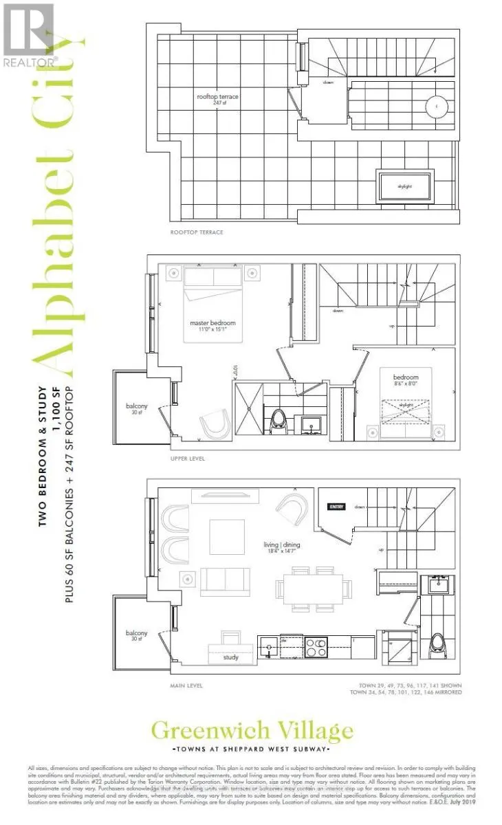Sheppard/Faywood Welcome to Greenwich Village, a stylish and spacious 1,100 SF modern condo townhome nestled in the heart of Clanton Park. This rare 2-bedroom + study, 2-bathroom unit offers a thoughtfully designed layout with exceptional features that elevate everyday living. Enjoy the convenience of a nearby underground parking spot just steps from your door and the added benefit of being one of the few units where you can temporarily stop in front to unload groceries or drop off family, making life that much easier. Step inside to discover an open-concept living and dining area with rich hardwood floors, a sleek kitchen outfitted with stainless steel appliances, quartz countertops, and custom roller blinds. The primary bedroom boasts floor-to-ceiling windows, a private balcony, and a generous double closet. The second bedroom features a skylight and built-in closet organizers, while the dedicated study offers a bright workspace with walk-out access to another balcony. Enjoy morning coffee or evening wine on either of your two private balconies, or head up to your 247 SF rooftop terrace with stunning southeast views of the city skyline and CN Tower perfect for BBQs, entertaining, or simply relaxing under the stars. With ensuite laundry, central air, and a tankless water heater, comfort and convenience are built in. Located steps from public transit, parks, schools, restaurants, and Yorkdale Mall, this townhome offers the perfect blend of urban accessibility and residential tranquility. Whether you're a professional, a small family, or someone seeking a vibrant yet peaceful lifestyle, this unit checks all the boxes. Don't miss your chance to lease one of North Yorks most desirable townhomes. Schedule your viewing today and experience elevated living in Greenwich Village. (id:27476)