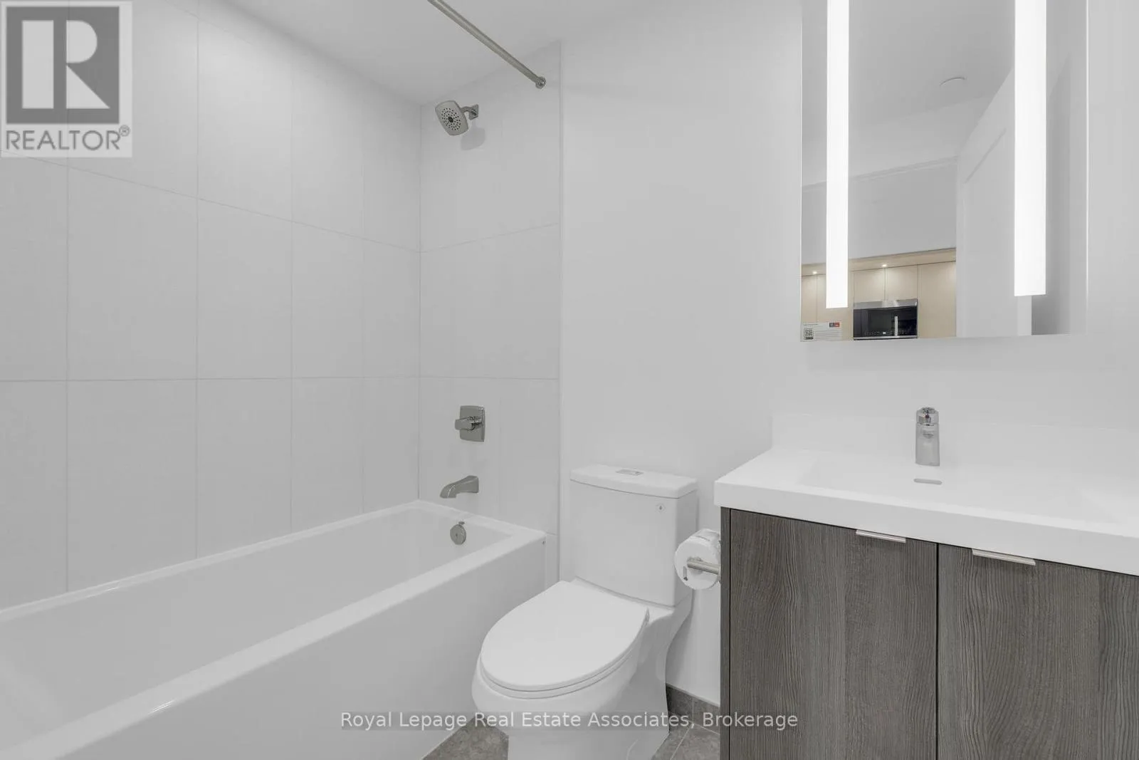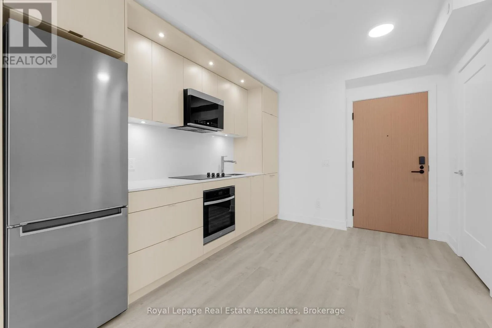 Bloor & Islington Welcome to Westerly 2 by Tridel, a modern condominium community offering efficient and contemporary living in the heart of Islington-City Centre West. This bright 1-bedroom, 1-bathroom suite offers 478 sq. ft. of thoughtfully designed living space with clean finishes and a functional open-concept layout ideal for urban living. The contemporary kitchen features integrated appliances, sleek flat-panel cabinetry in a light neutral tone, quartz countertops, and under-cabinet lighting. The kitchen flows seamlessly into the combined living and dining area, where wide-plank flooring and a large window bring in excellent natural light and provide a comfortable space for everyday living. The bedroom is well-proportioned with a large window and generous closet space, while the modern 4-piece bathroom showcases full-height tilework, a deep soaker tub with tiled surround, chrome fixtures, and a sleek vanity with integrated lighting. In-suite laundry is conveniently tucked into a dedicated closet just off the main living area. One parking space is included for added convenience. Residents of Westerly 2 enjoy access to an impressive collection of amenities including a fitness centre, yoga studio, co-working lounge, party room, kids' zone, outdoor terrace, and 24-hour concierge. Ideally located steps to Islington Subway Station, grocery stores, parks, dining, and everyday conveniences, this suite offers comfortable, well-connected living in a desirable Etobicoke neighbourhood. (id:27476)