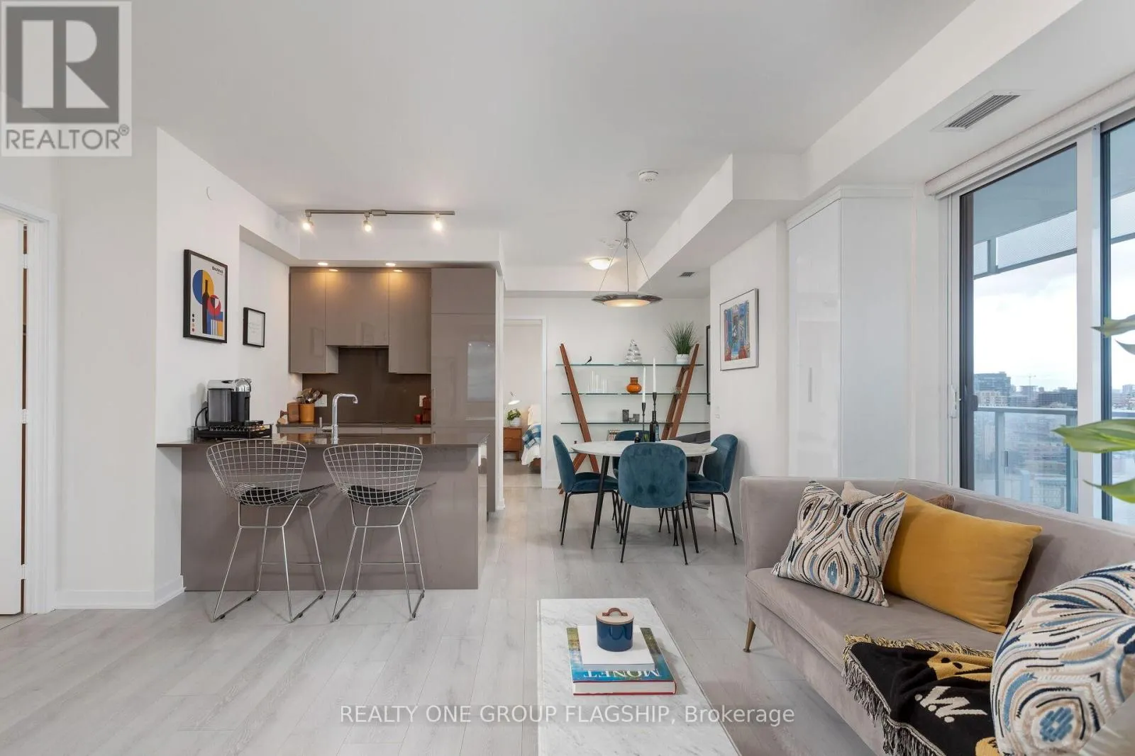 Cross Streets: Yonge / Lake Shore. ** Directions: E on Queens Quay, N on Freeland. Welcome to The Prestige at One Yonge, situated right at the heart of Torontos vibrant life. With the lake just steps away, and Torontos buzz all around you, heres a place that serves up the best in modern urban living the way you want it: with smart good looks and a sense of luxe. This incredibly appointed corner unit features a bright and open split bedroom layout with a sunny South East exposure and water views, stainless steel appliances, floor to ceiling windows throughout which let in abundance of natural light, 2 large bedrooms, a den, lots of storage, custom built-ins from California Closets, custom electric window coverings, an extra large balcony, and ensuite laundry. Suitcase move-in ready and fully furnished! Fantastic building amenities include: Concierge, gym, meeting rooms, games room, party room, kids play room, outdoor patio with BBQs, dining room, and more. Next door is a community centre with indoor pool and gym. (id:27476)