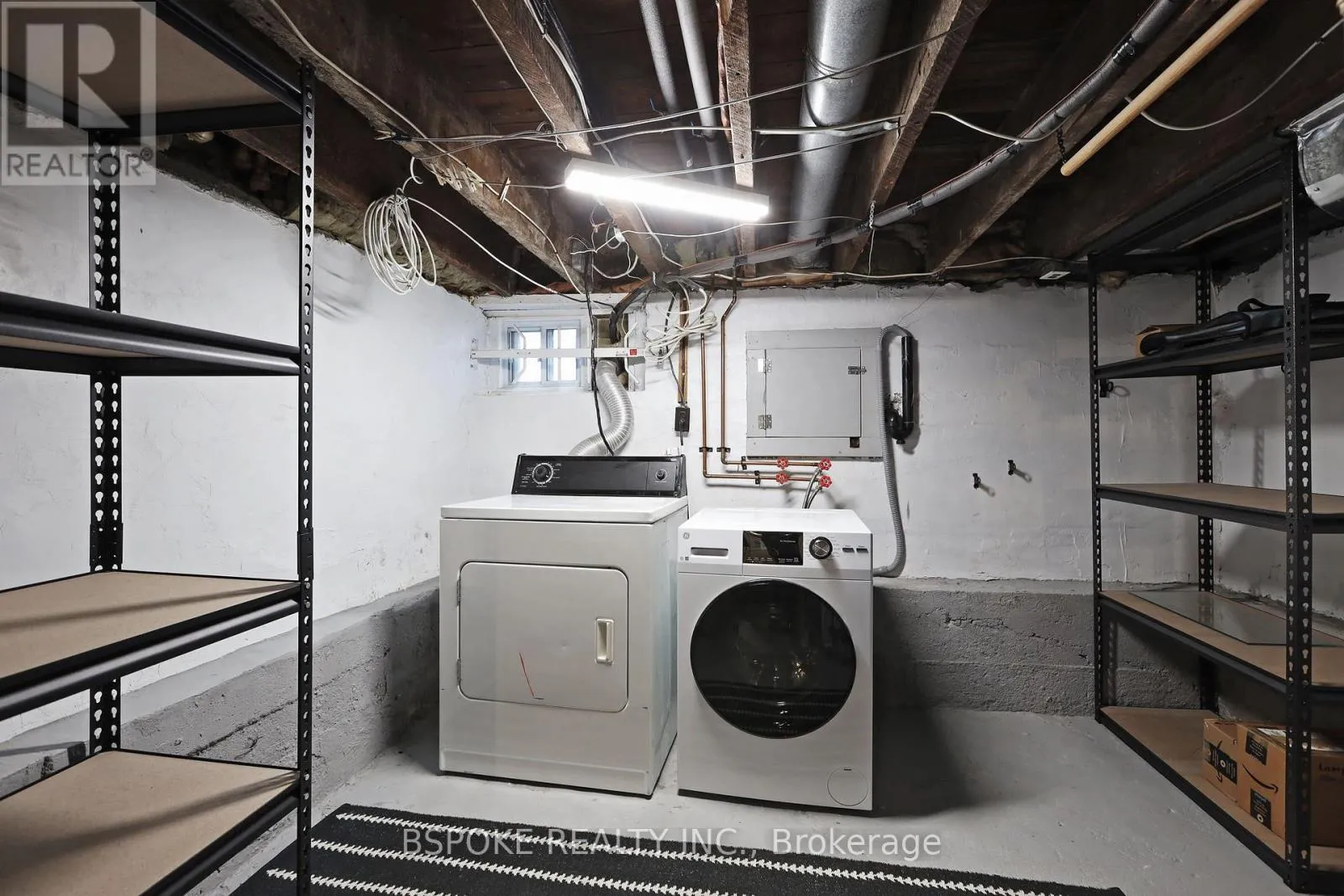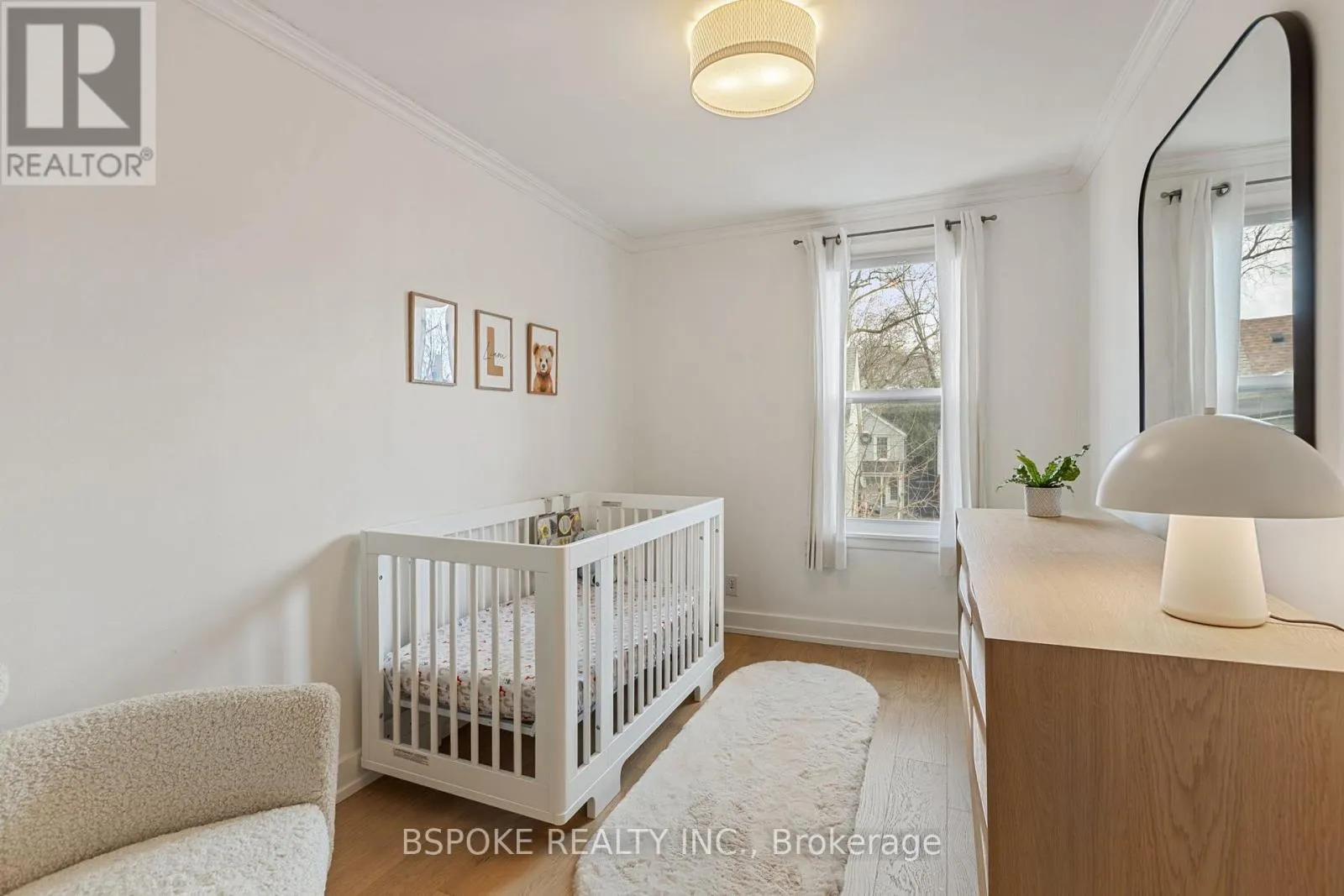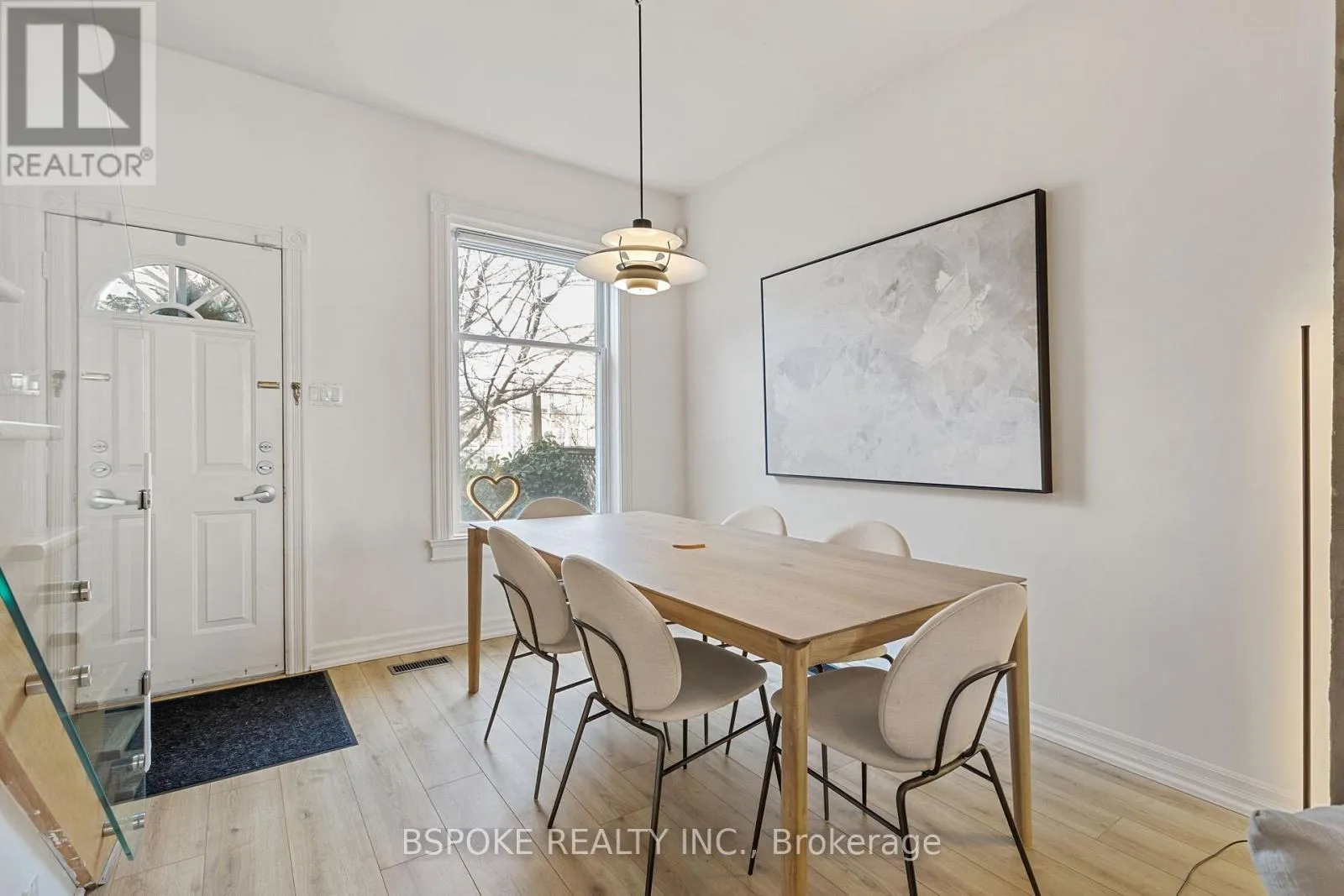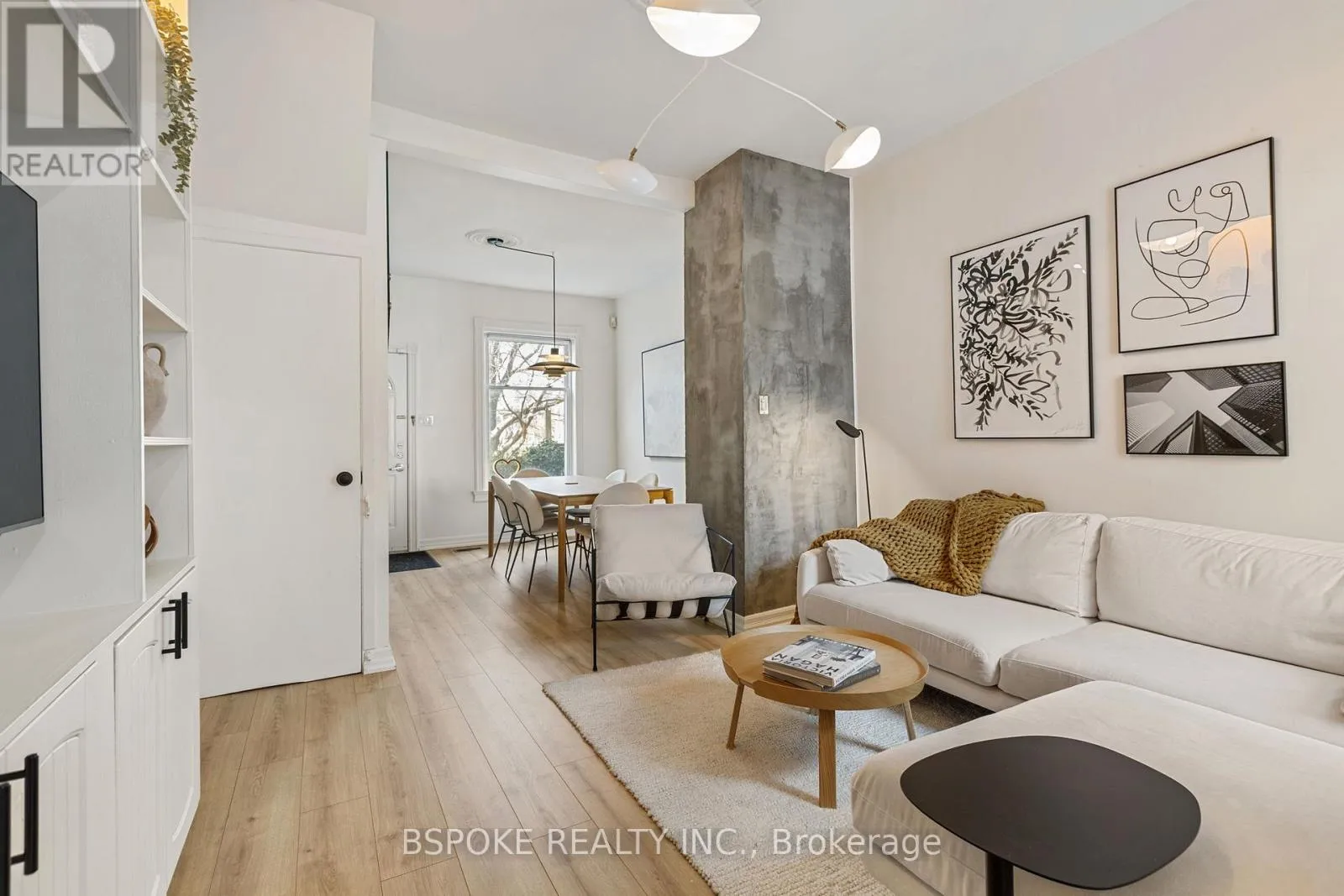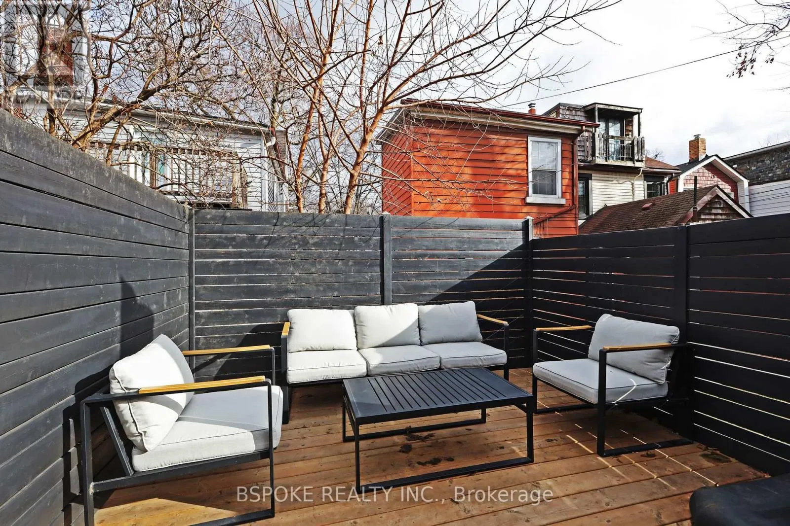 Cross Streets: Gerrard St E/Broadview Av. ** Directions: . Charming end-of-row in South Riverdale with a welcoming setback, perennial garden and a little free library. Inside, over 9 ft high ceilings with Victorian ceiling roses, and an open-but-defined living and dining room create an easy main floor flow, anchored by built-in shelving and a clean- lined glass staircase. The renovated kitchen delivers style and function with two-tone cabinetry, herringbone tile and a layout that actually works for everyday cooking. Upstairs, two proper bedrooms are paired with a larger-than-expected 4-piece bathroom, and the 2024 engineered hardwood ties the level together. Out back, a surprisingly spacious and low-maintenance private deck stretches the living space outdoors and makes hosting or unwinding simple; the deck surface was fully replaced in 2024. The basement offers laundry and plenty of storage with decent ceiling height. Thoughtful updates include a newer hot water tank (2024), dishwasher (2023), washing machine (2022) and towel warmer in the bathroom (2024) that heats the whole room. All of this in a super desirable and walkable east-end pocket close to Riverdale Park, Lady Marmalade, Gerrard's Little Vietnam, Queen East, the Danforth, transit, shops, bars and restaurants - an ideal house for someone who wants character, comfort and a neighbourhood they'll actually use. (id:27476)