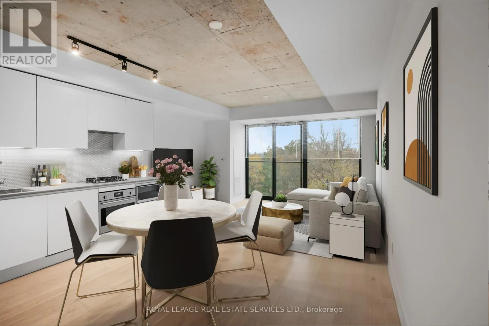 Dundas & Dupont Urban living in the heart of the Junction! Step inside Superkul's award winning boutique condominium project - the Junction House. This thoughtfully designed and spacious, almost 700 sqft, one bedroom unit features exposed 9ft ceilings, floor to ceiling windows, contemporary materials and finishes for both entertaining & ease of living. Well appointed modern Scavolini kitchen includes integrated appliances, porcelain tile backsplash & gas cooktop. There's plenty of room for a dining table or island or both. The open concept living room is flooded with natural light - functional and inviting, an area you'll want to spend time in. Enough space to easily set up your home office. Spa-like bathroom includes a double door vanity, porcelain tiles & large soaker tub. Premium white oak hardwood flooring throughout. Steps from the best restaurants, cafes, charming local shops, breweries, farmer's markets, transit (15 min walk to GO Train, UP Express, subway) providing every convenience. The unique building includes a dynamic co-working/ social space, reliable concierge, well-equipped gym, yoga studio, visitor parking, 4000 sqft landscaped rooftop terrace with BBQs, fire pits and stunning city skyline views. One large storage locker included. Available rental parking in the building. Freshly painted. Don't miss the opportunity to own in one of Toronto's most vibrant and sought after neighbourhoods. (id:27476)