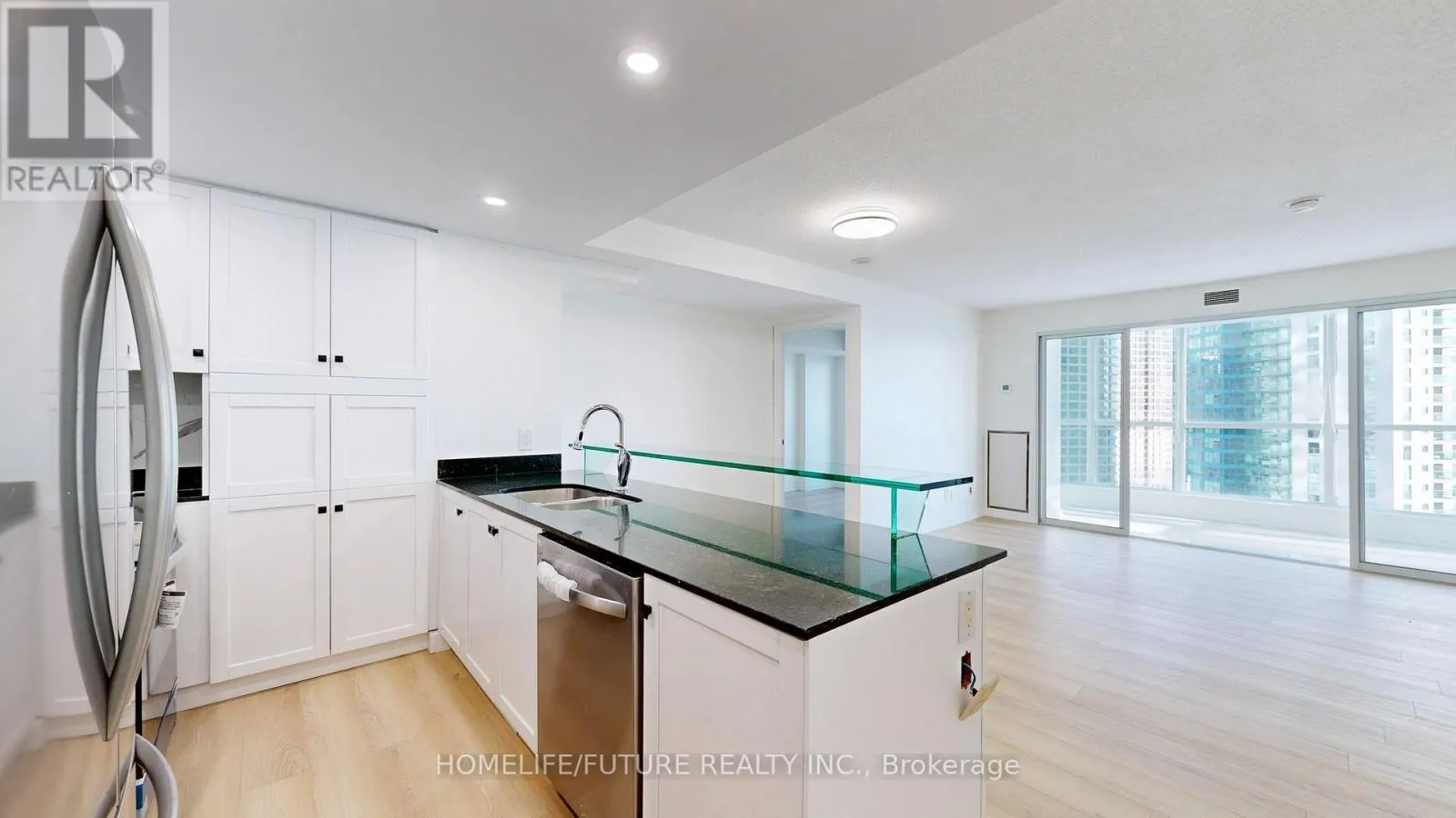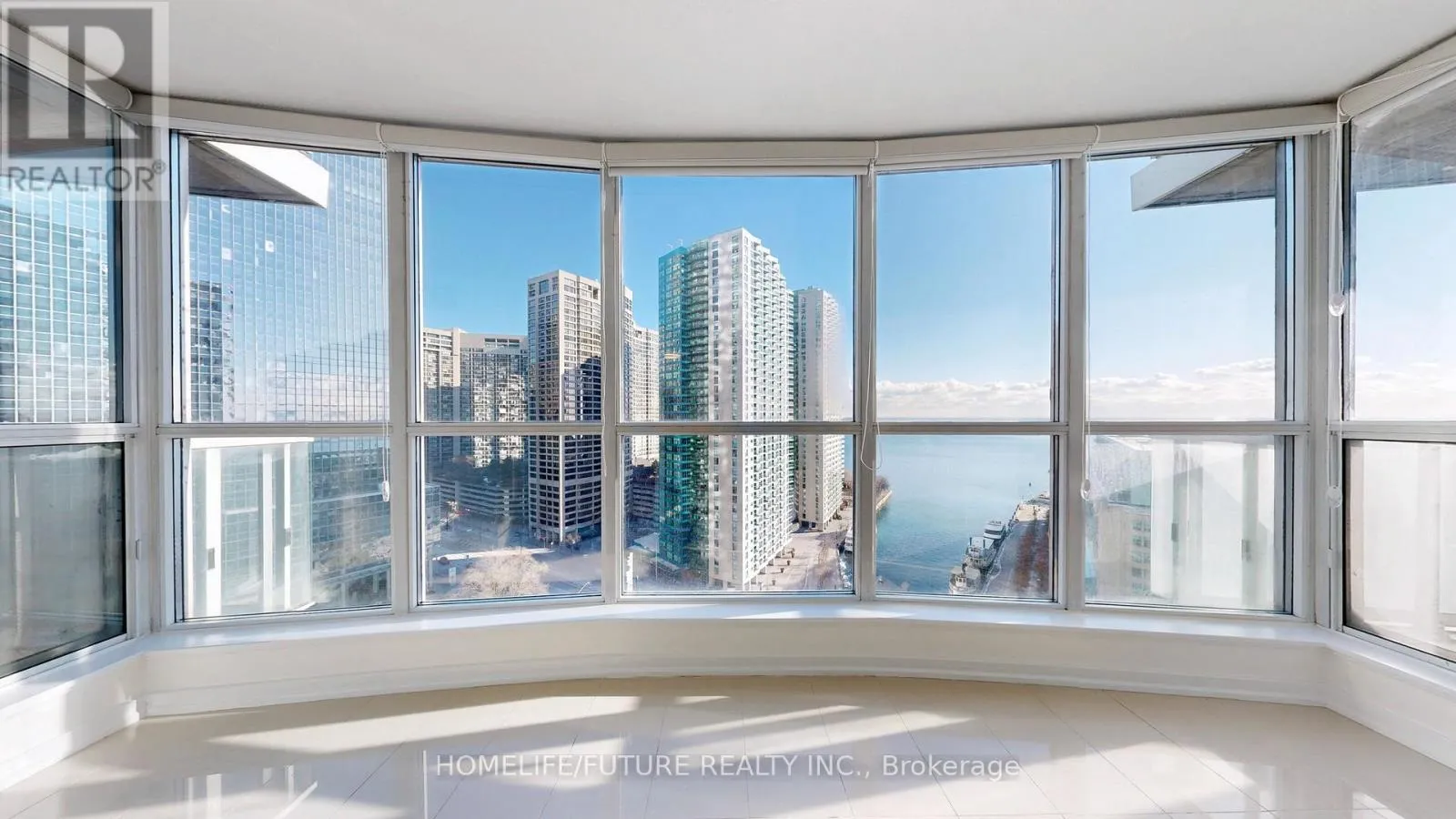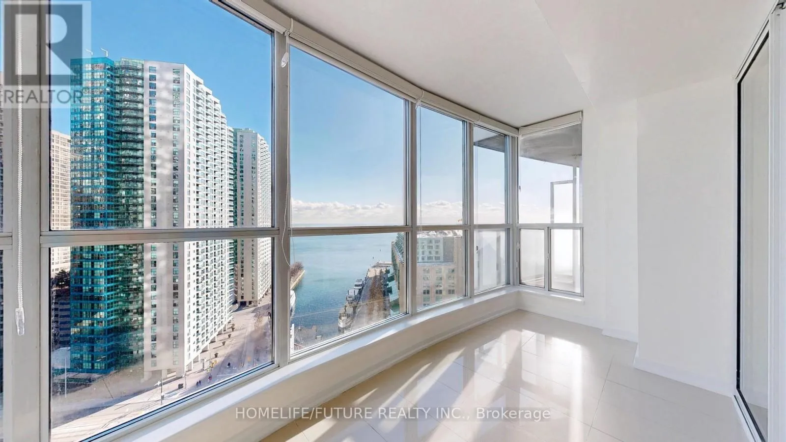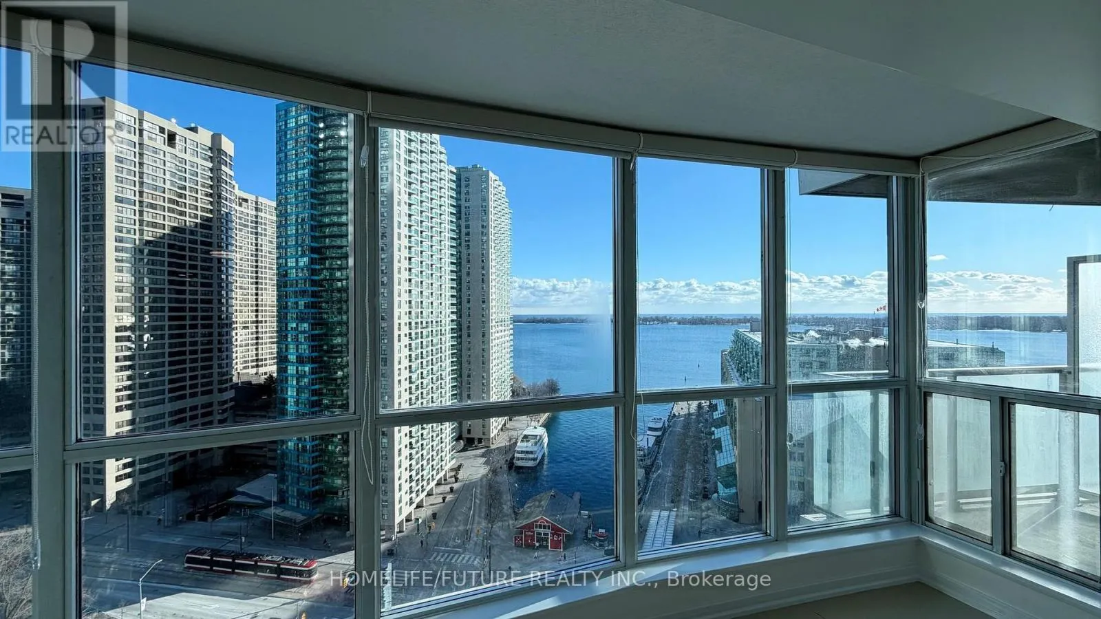 Queens Quay/York St Exceptional Location! Luxurious condominium located in the heart of downtown Toronto. This stunning 979 sq. ft. suite plus a huge balcony With One Parking and Locker offers breathtaking southeast views of the lake and city. The suite features 2 spacious bedrooms, each with walk-in closets and Lake & City views, plus a separate den with double doors, ideal for a home office or guest room. Enjoy 2 full bathrooms and two balconies overlooking the lake. Fully renovated throughout, the unit boasts a brand-new kitchen with granite countertops and breakfast bar, new stainless steel appliances, new laminate flooring, fresh paint, and new window coverings. Floor-to-ceiling windows provide abundant natural light, creating a bright and inviting living space. Move-in ready and perfectly located within walking distance to the Financial District, Union Station, Rogers Centre, Scotiabank Arena (ACC), and the waterfront. Shopping, dining, and entertainment are right at your doorstep. (id:27476)