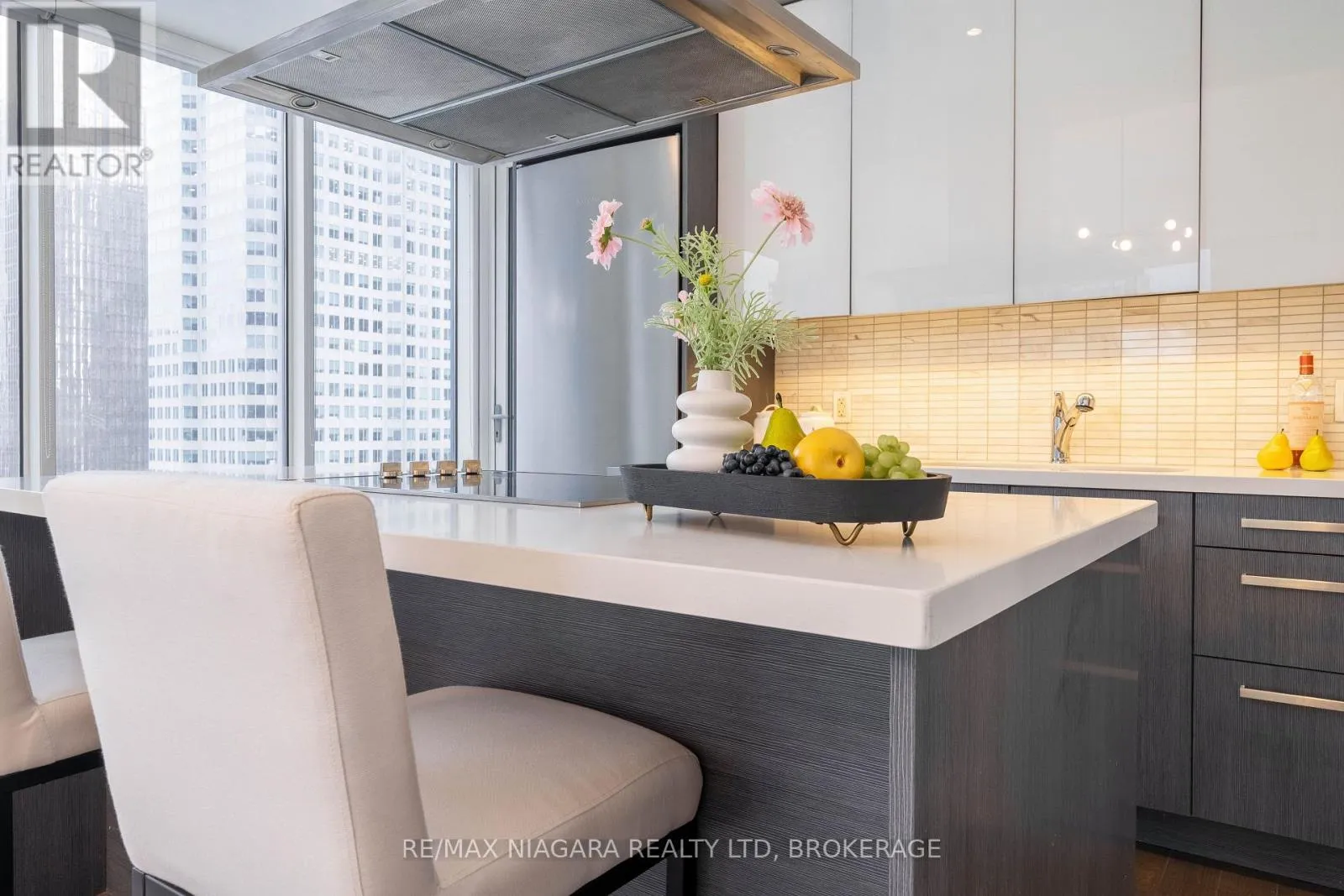Yonge & Front Welcome to 8 The Esplanade, an iconic address offering refined urban living in the heart of downtown. This executive two-bedroom plus den residence provides over 1,000 square feet of thoughtfully designed interior living space, complemented by a private balcony. Soaring ceilings and expansive picture windows bathe the suite in natural light while framing impressive city views.Upon entry, the home reveals a bright, open-concept layout enhanced by floor-to-ceiling windows and premium finishes throughout. The residence features hardwood flooring, a contemporary kitchen equipped with high-end stainless steel appliances, an elegant backsplash, and a centre island ideal for casual dining or entertaining. Additional enhancements include custom closet organizers and recessed pot lighting.The well-appointed layout includes two generously sized bedrooms with ample storage, as well as a spacious den perfectly suited for a home office or professional workspace. Residents enjoy access to an exceptional collection of amenities, including 24-hour concierge service, an indoor pool, a fully equipped fitness centre, a party room, guest suites, and more.Surrounded by world-class dining, shopping, transit, and entertainment, this residence offers unparalleled convenience. Ideally situated steps from Union Station, the PATH, the Waterfront, St. Lawrence Market, and numerous downtown attractions, this is sophisticated city living at its finest. ***One indoor parking spot and one locker are included*** (id:27476)
