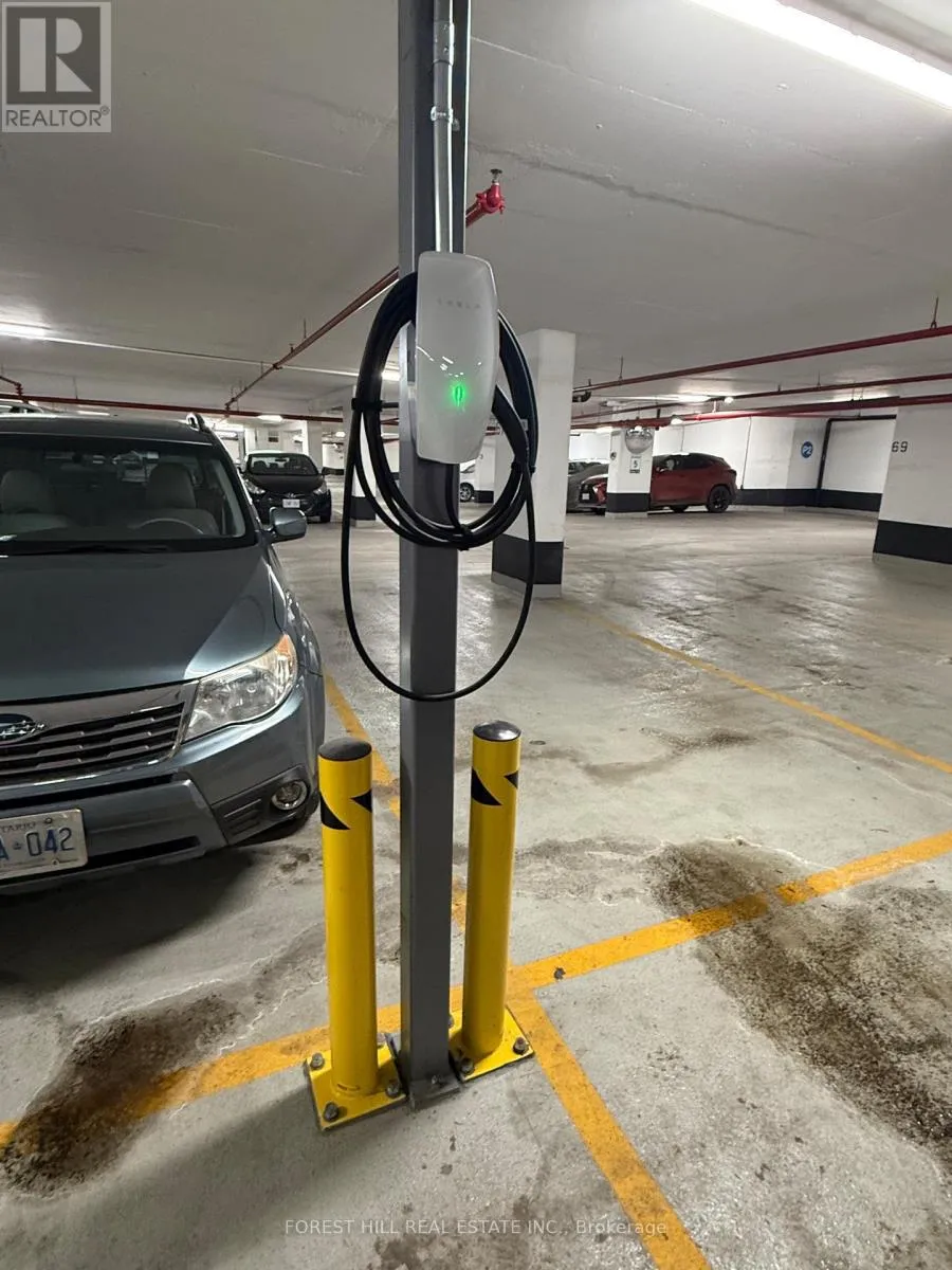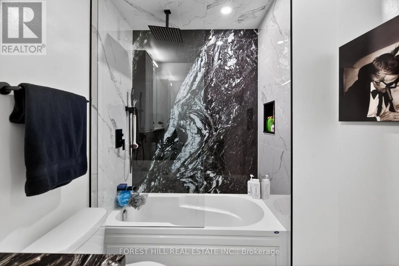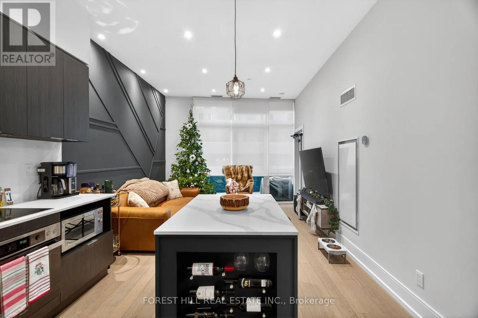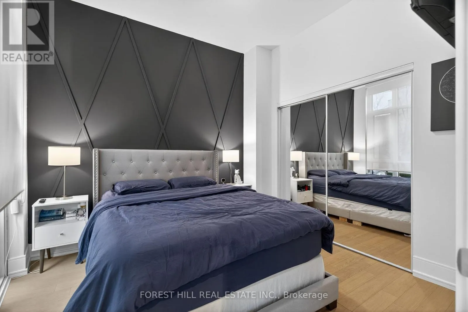 Don Mills / Lawrence Luxury Ground-Floor 1 Bedroom Suite - Fully Renovated & Move-In Ready. This stunning, fully upgraded 1 bed, 1 bath residence features 10 ft ceilings, hardwood floors throughout, full floor-to-ceiling windows. Feature walls in both the living and primary bdrm. Throughout the unit, dual roller blinds offer total control, sheer shades for natural daylight and full blackout rollers for complete privacy and restful nights. Premium Miele S/S appliances, sleek kitchen island w/ waterfall countertop and built-in wine rack, new doors/trim, and pot lights on dimmers throughout. Spa-quality bathroom with upgraded tiles, rainfall shower + handheld, granite vanity top with built in sink, and luxury finishes end to end. Enjoy a rare private ground-floor terrace with composite decking, green feature wall, and LED perimeter lighting-perfect for summer. This ground floor unit lets you skip the elevator waits and enjoy direct, effortless access every day, while still having an elevated balcony overlooking the Shops at Don Mills. This suite also comes with a locker and a Tesla-charging parking spot, a rare upgrade! Tenant pays only hydro. One of the most luxurious units in the building, a must-see! (id:27476)