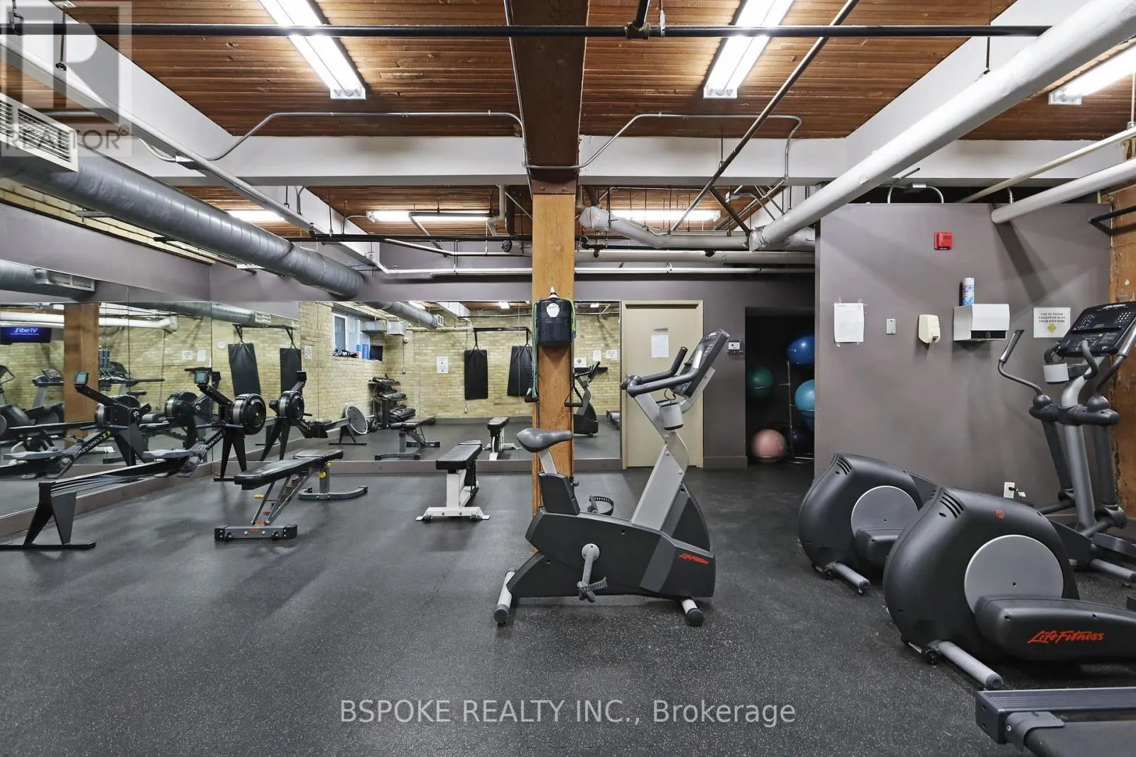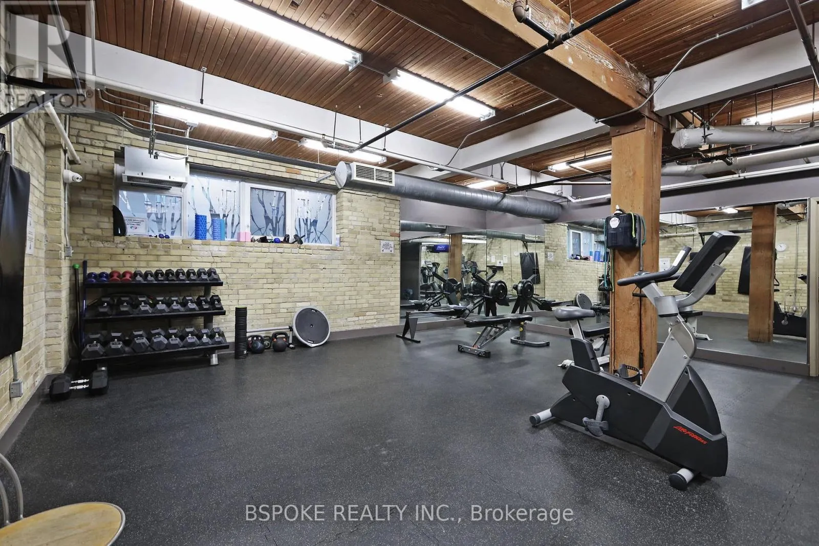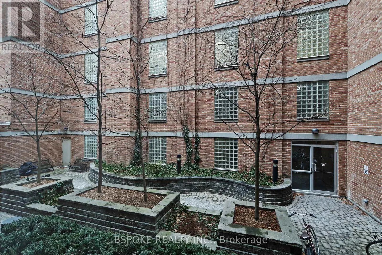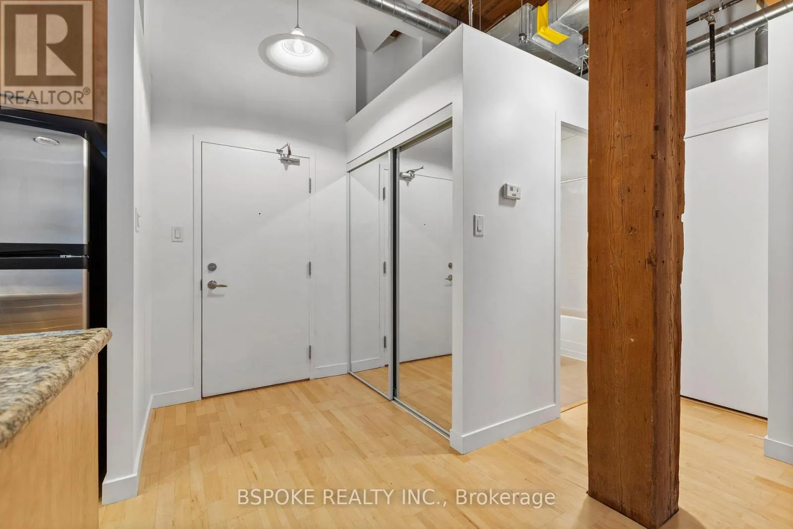 Cross Streets: Queen West & Shaw. ** Directions: Can park on Crawford or Green P on Queen. Hard loft living in the Chocolate Company Lofts, directly across from Trinity Bellwoods Park. Suite 227 delivers the real thing: 12' ceilings, exposed brick, original wood posts & beams, and oversized windows overlooking a quiet courtyard. A proper foyer with a large coat closet opens to an open-concept kitchen/living/dining space that actually works for real life and entertaining-excellent storage, plus a functional island with breakfast bar seating. The bedroom features a large closet, a smart alcove for a desk, and a Juliette balcony for fresh air and extra light. In-suite laundry, one large locker, and second-floor access make day-to-day easy (especially with a dog). Epic Queen West location on the south side of Queen between Crawford and Strachan-steps to Oyster Boy, Mother, Matty's Patties, Nadege, the Candy Factory, and the park across the street. Maintenance fees include heat, central air, water, building insurance and common elements. A true loft on the stretch of Queen West that still feels like itself. (id:27476)