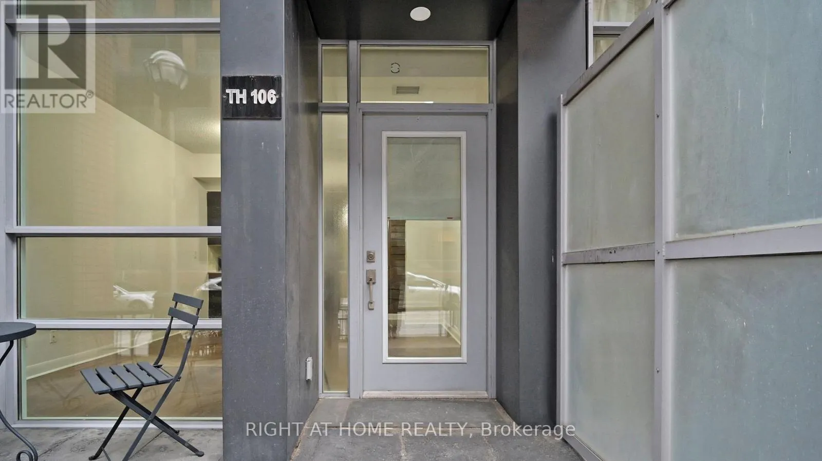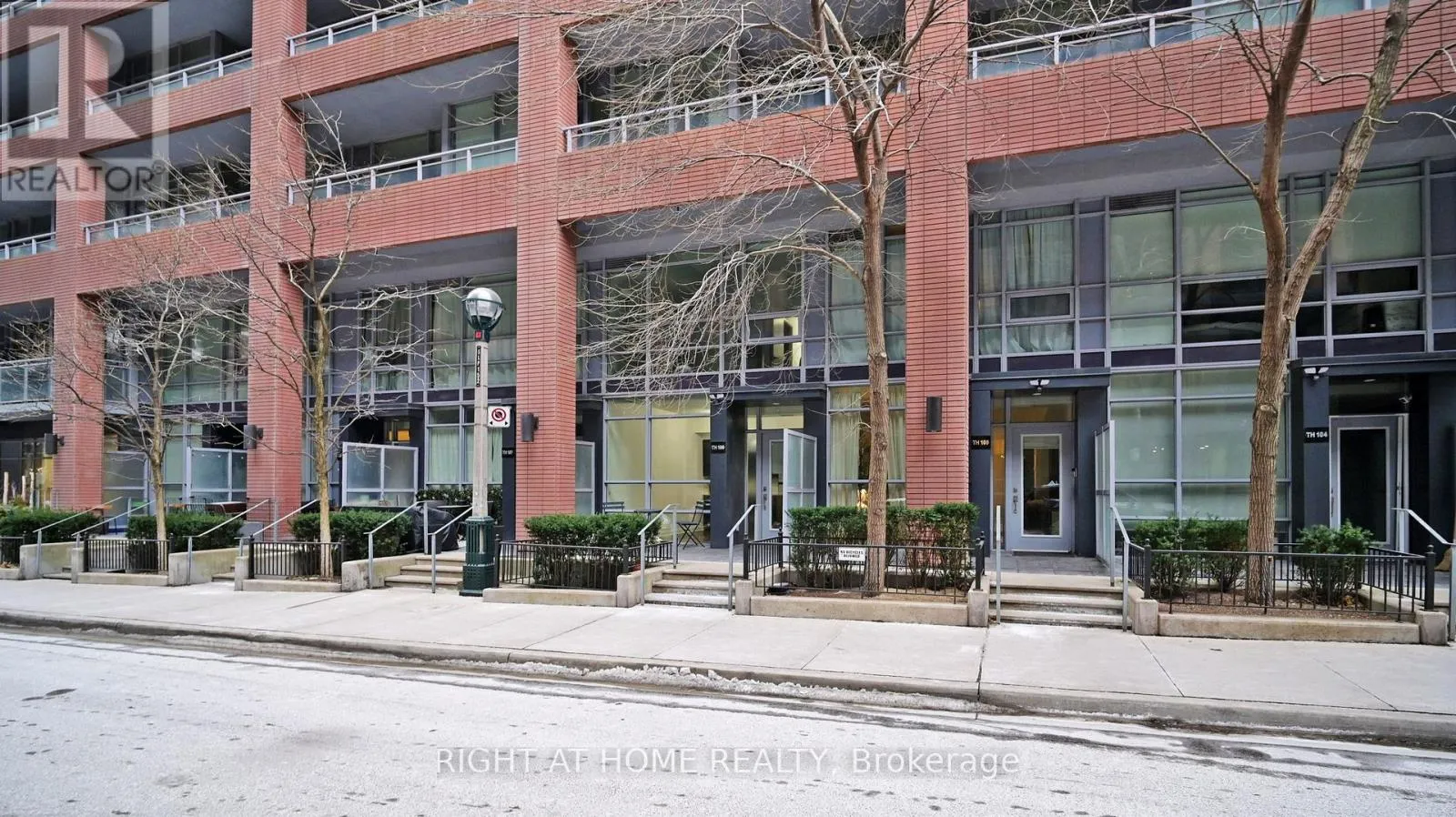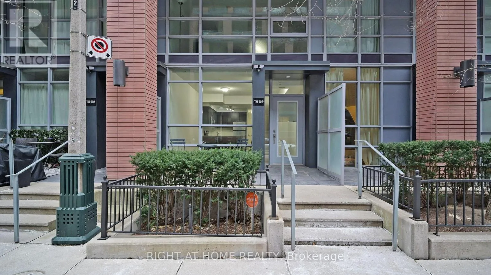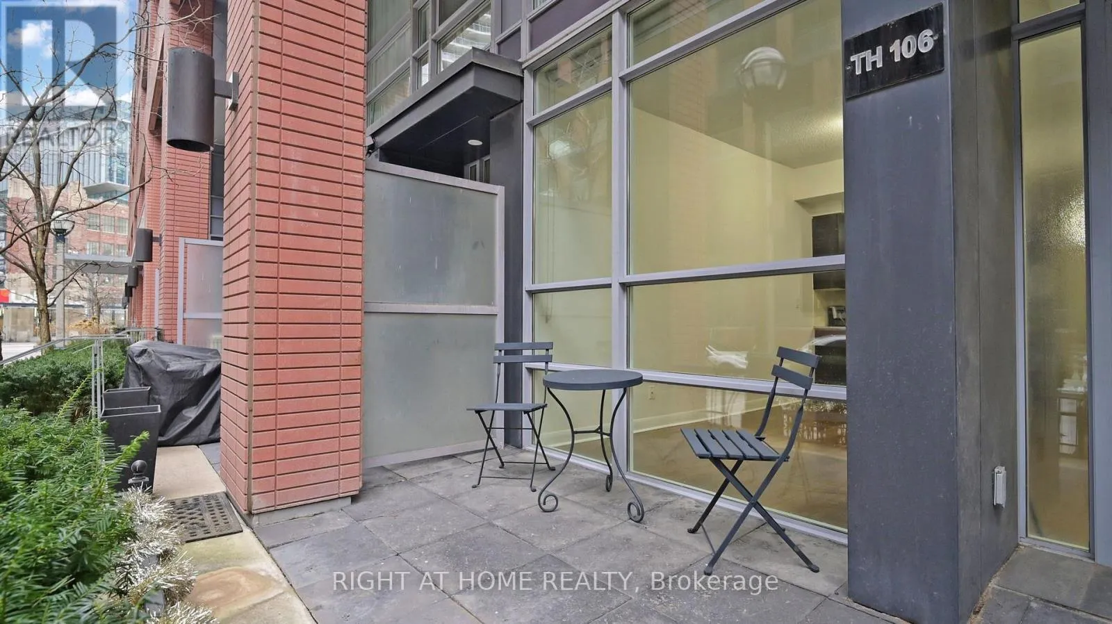 Cross Streets: Bathurst St./Lakeshore BLVD. ** Directions: Bathurst St./Bruyeres Mews. Rarely offered two-storey condo townhouse in the sought-after Fort York/Waterfront neighbourhood. Move-in ready and beautifully maintained. Freshly painted and professionally deep-cleaned, this bright 1+den layout features two full bathrooms and a private patio, perfect for morning coffee or evening downtime. This condo features high ceilings and floor-to-ceiling windows, creating an open feel for everyday living and entertaining. Enjoy the flexibility of a true den that can function as a second bedroom with a custom built-in Murphy bed. The home offers two convenient entrances (street-level and through the building), a tiled building entryway, an open-concept kitchen, and laminate flooring throughout. Notable updates include a new thermostat and heat pump (2021) on the ground level. You'll also love the practicality of your parking spot and locker on the same level, just steps away from the elevator. Well-managed building with semi-annual CAC filter changes, exterior window cleaning once a year, and patio snow/leaf clearing. Amenities include a rooftop patio with BBQ, a guest suite available to rent, bike storage (additional fee), fibre internet availability, and an EV charging station planned within the next year. A contemporary mid-rise with a boutique feel. Moments to Lake Ontario, Harbourfront Centre, transit, shops, dining, entertainment, art galleries, and the Financial District. (id:27476)